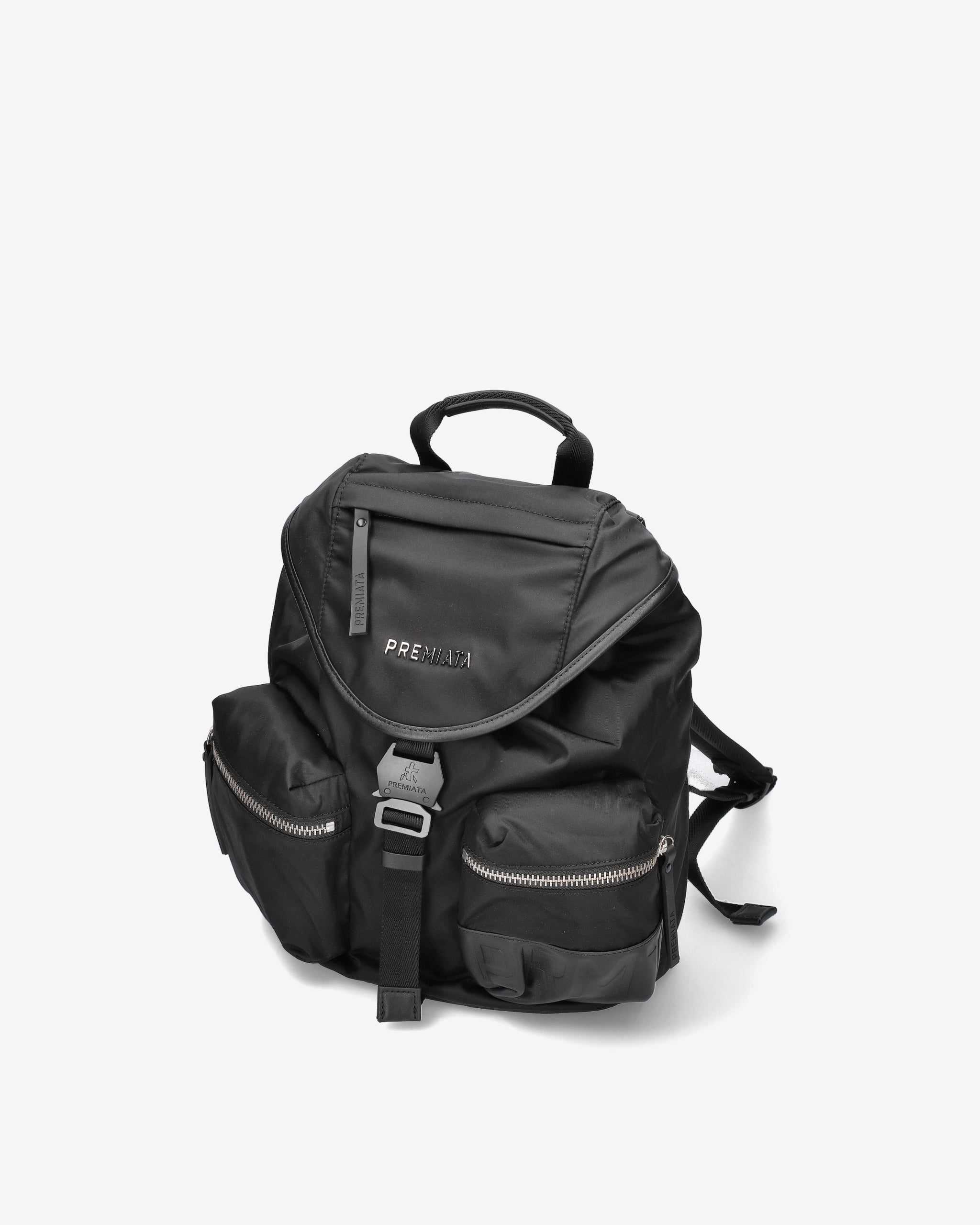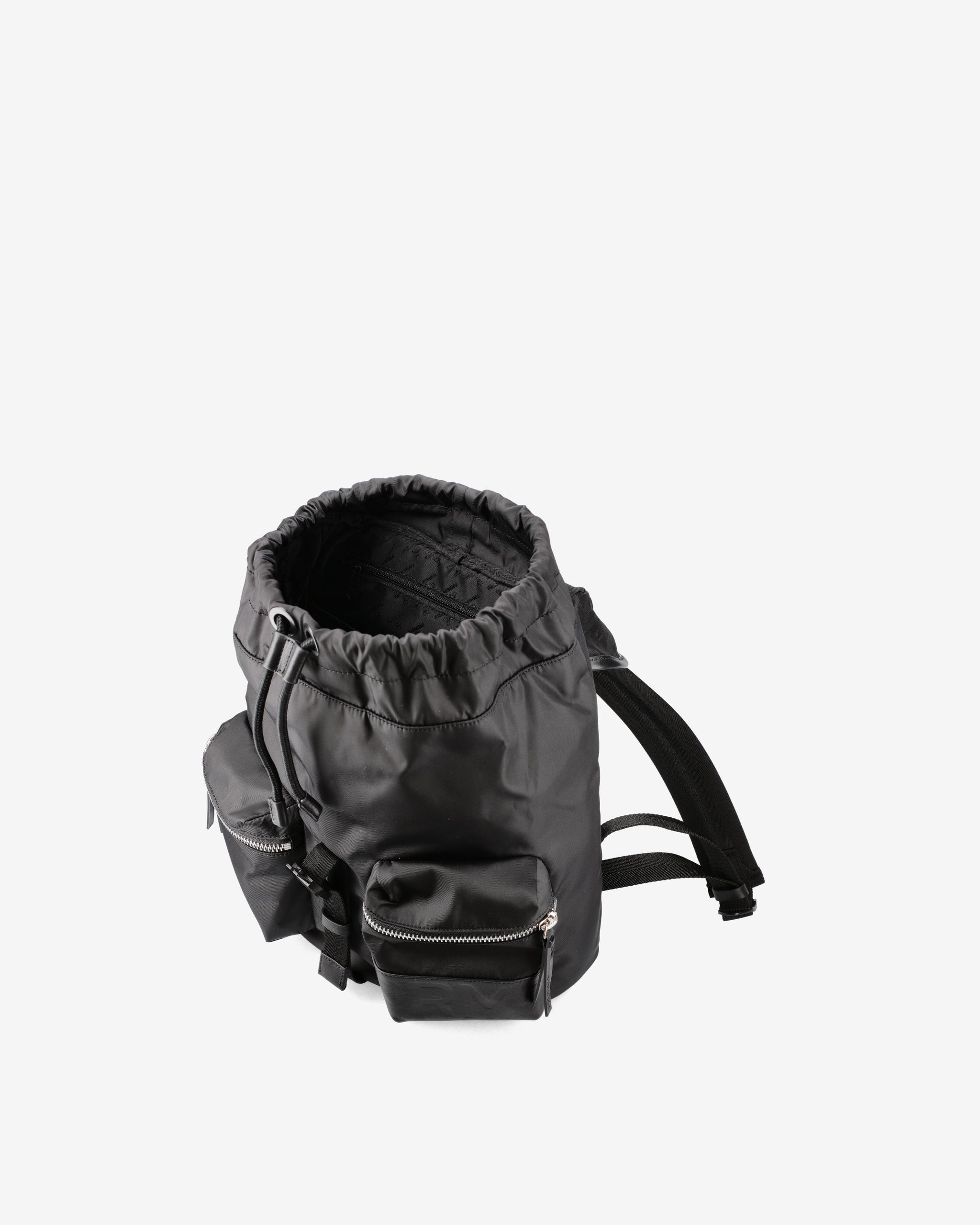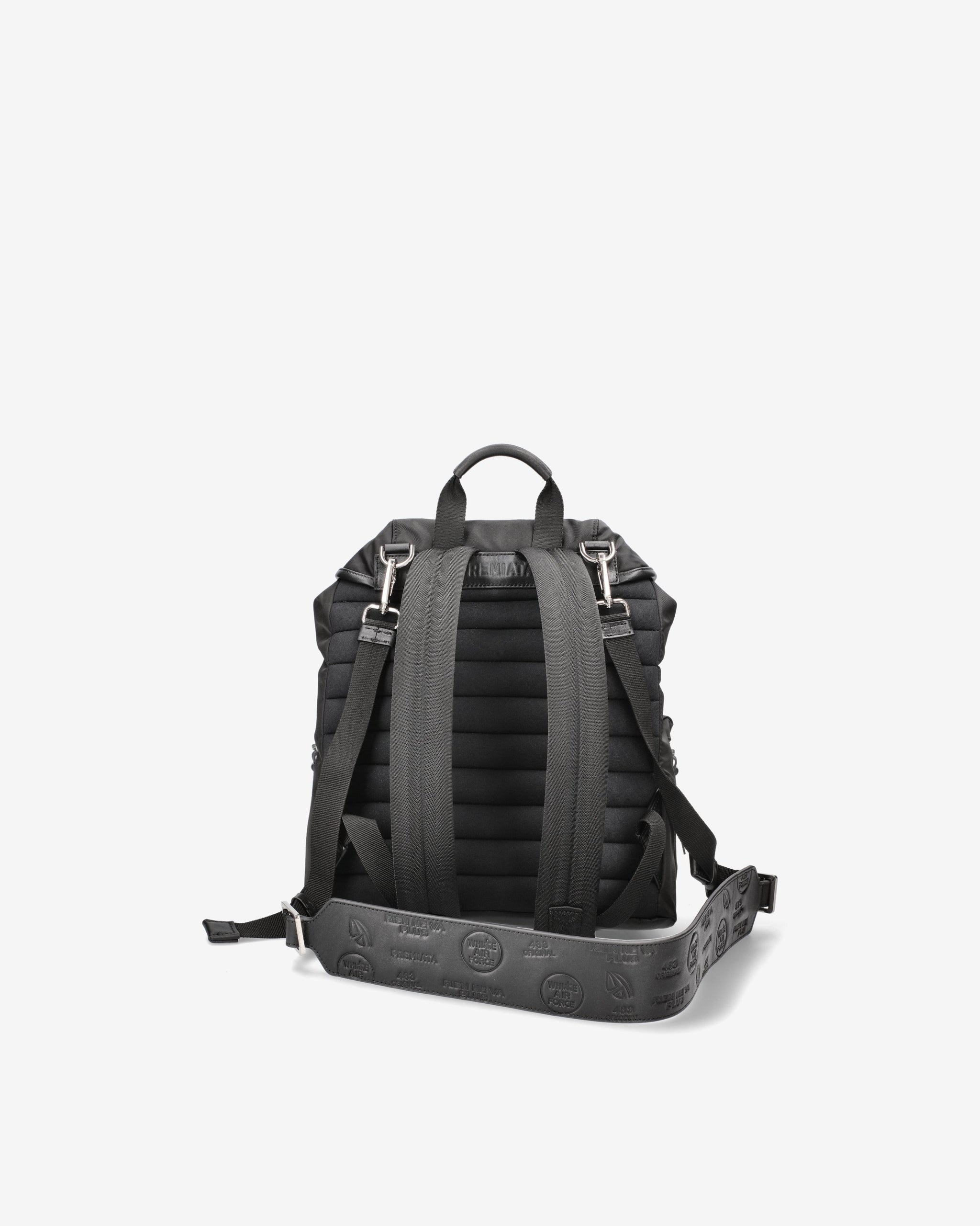 A capacious and versatile model in soft, premium rubberized effect fabric. Padded EVA back and shoulder straps for added comfort. Side pockets with calfskin leather trim and matte metal closures.