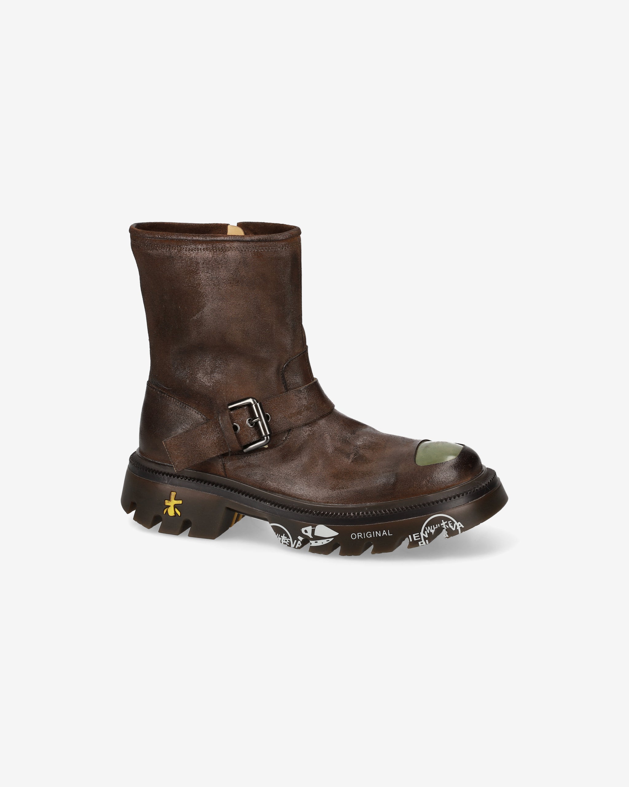Hand-rubbed and dirtied crust leather biker with side buckle, ABS toe cap matching the leather and translucent dark brown bottom. A gritty, handcrafted model inspired by London's underground aesthetic.