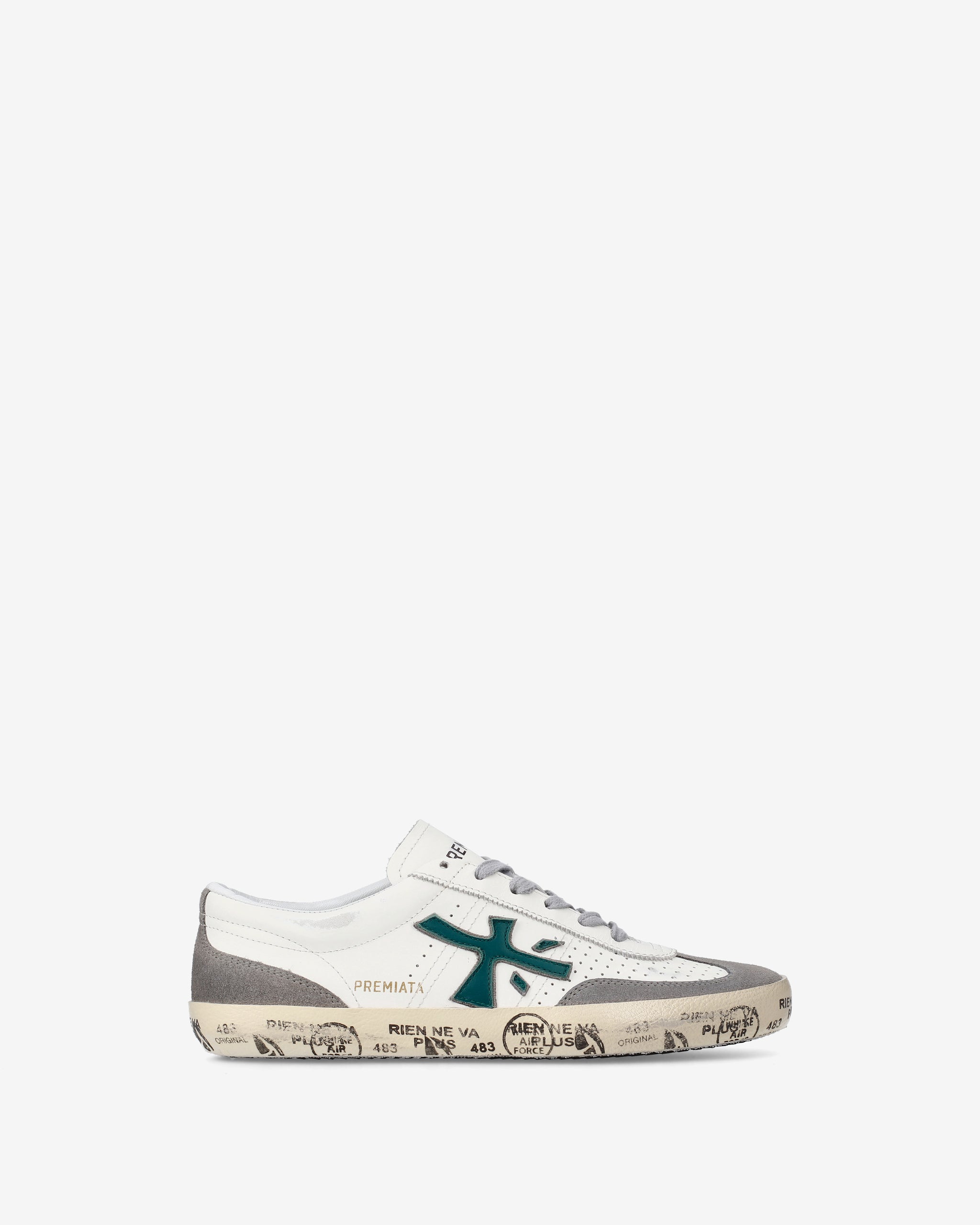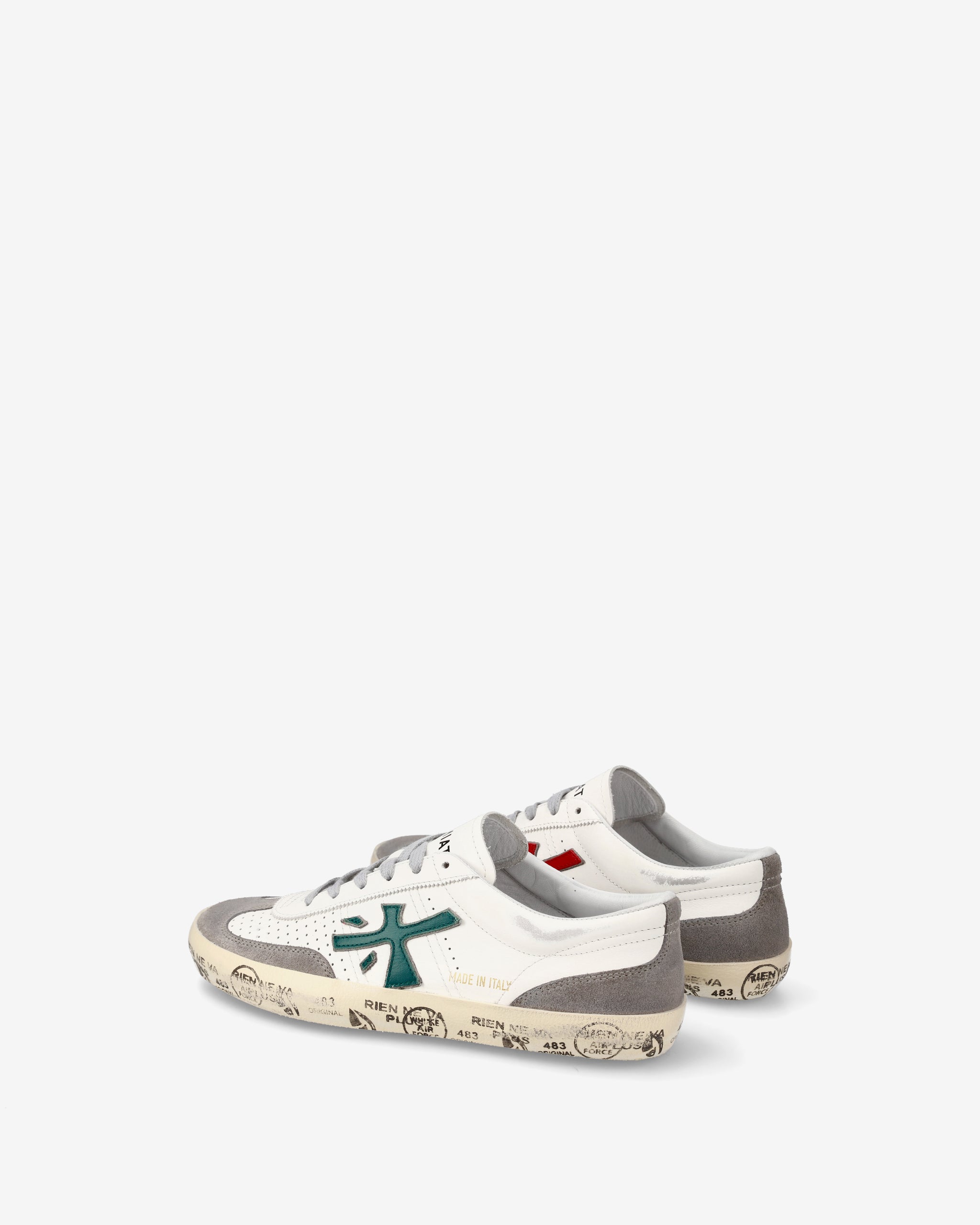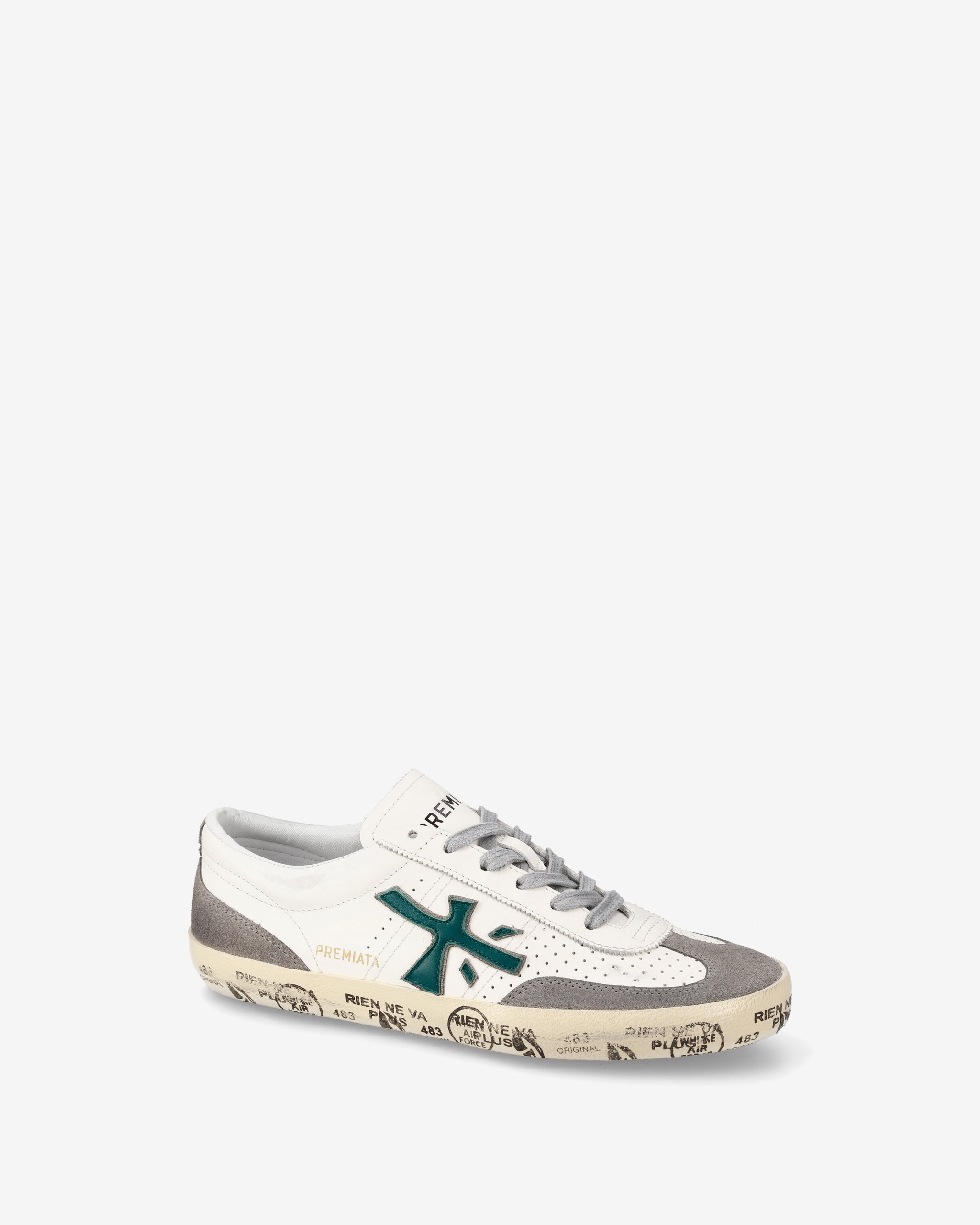 Urban-style sneakers with leather and suede upper, dark green side logo and rubber sole with decorative stamps. Gray laces complete the casual and refined look, perfect for every day wear.