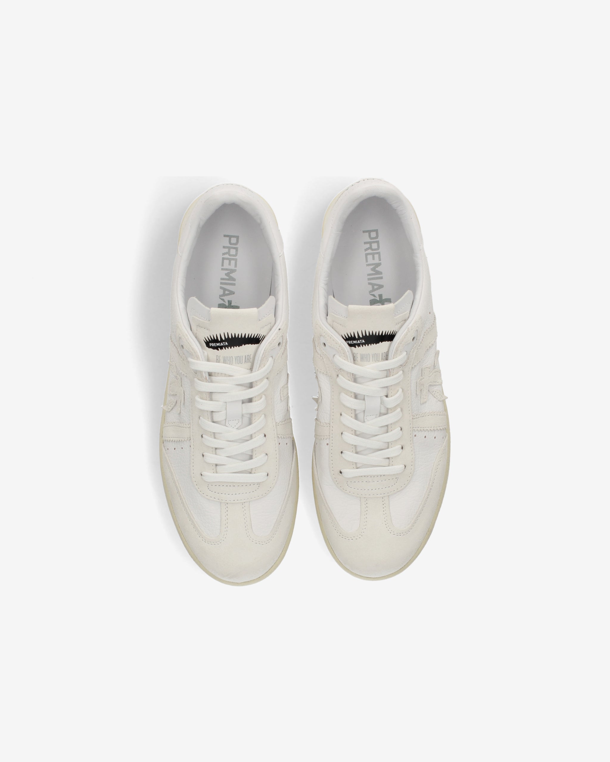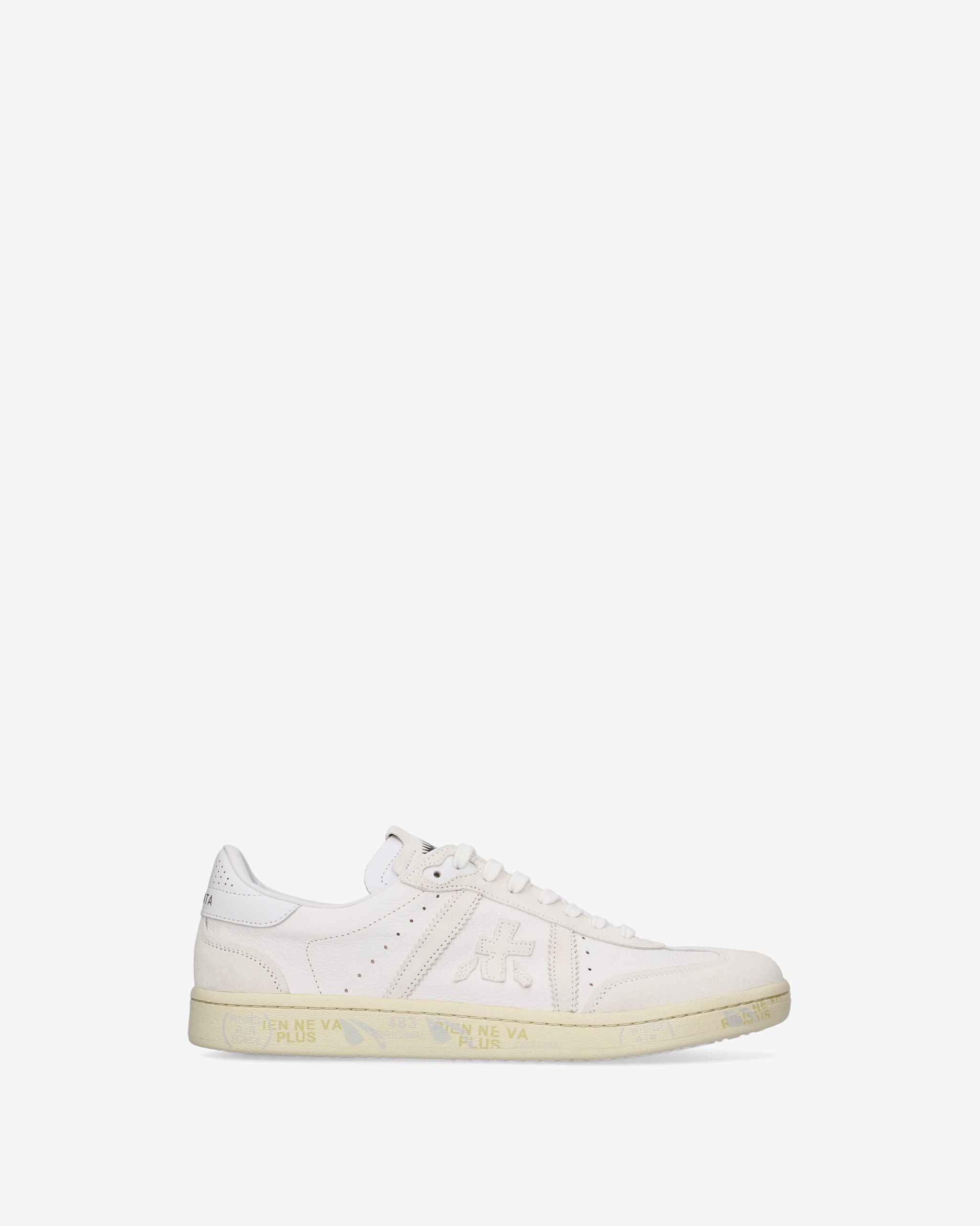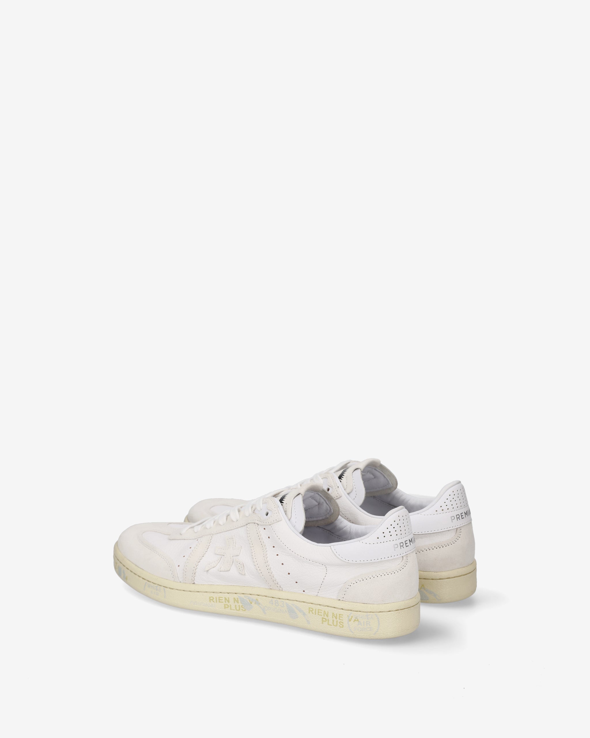 White Bonnie and off-white sole with contrasting blue lining. A white sneaker for a clean and sophisticated look.