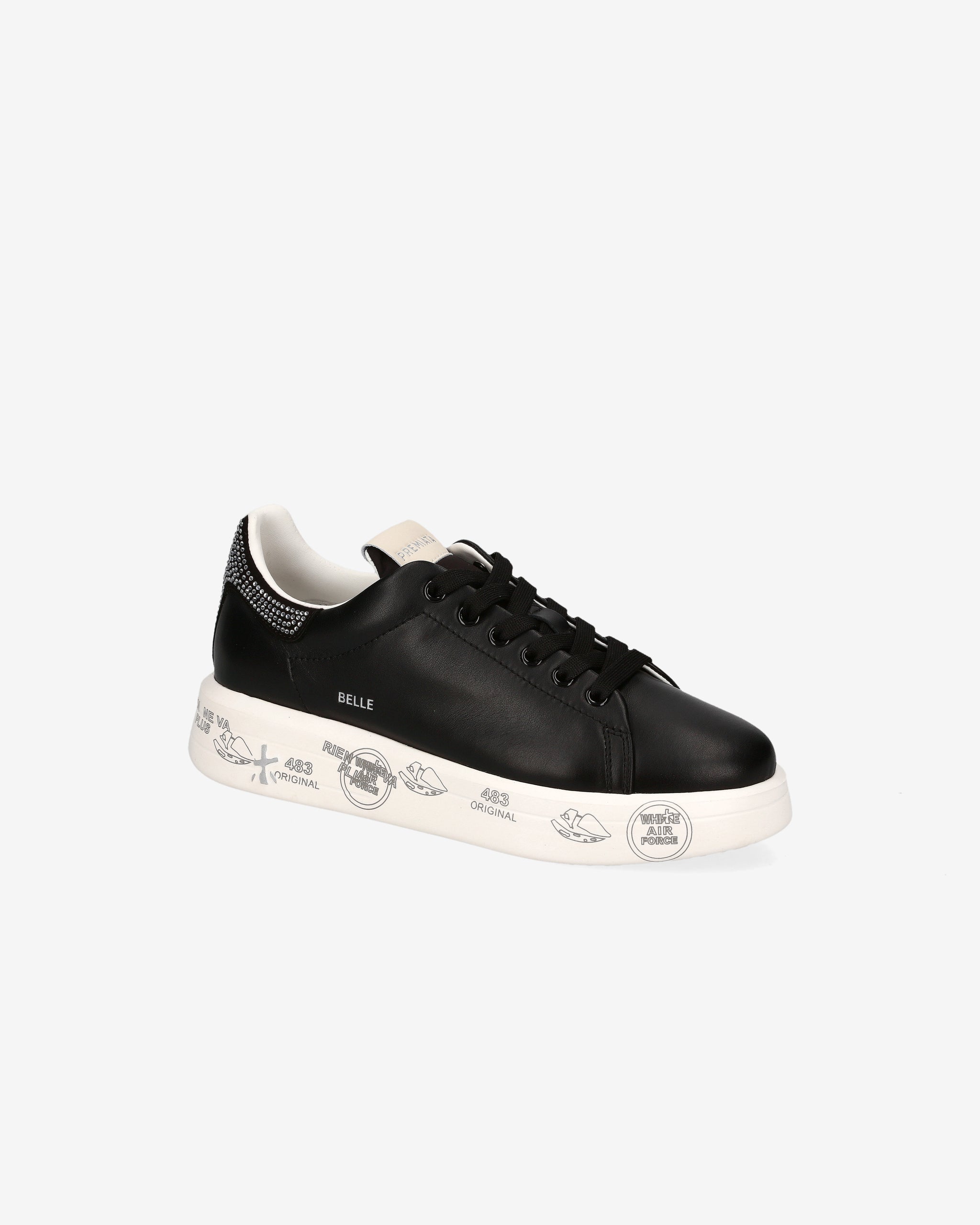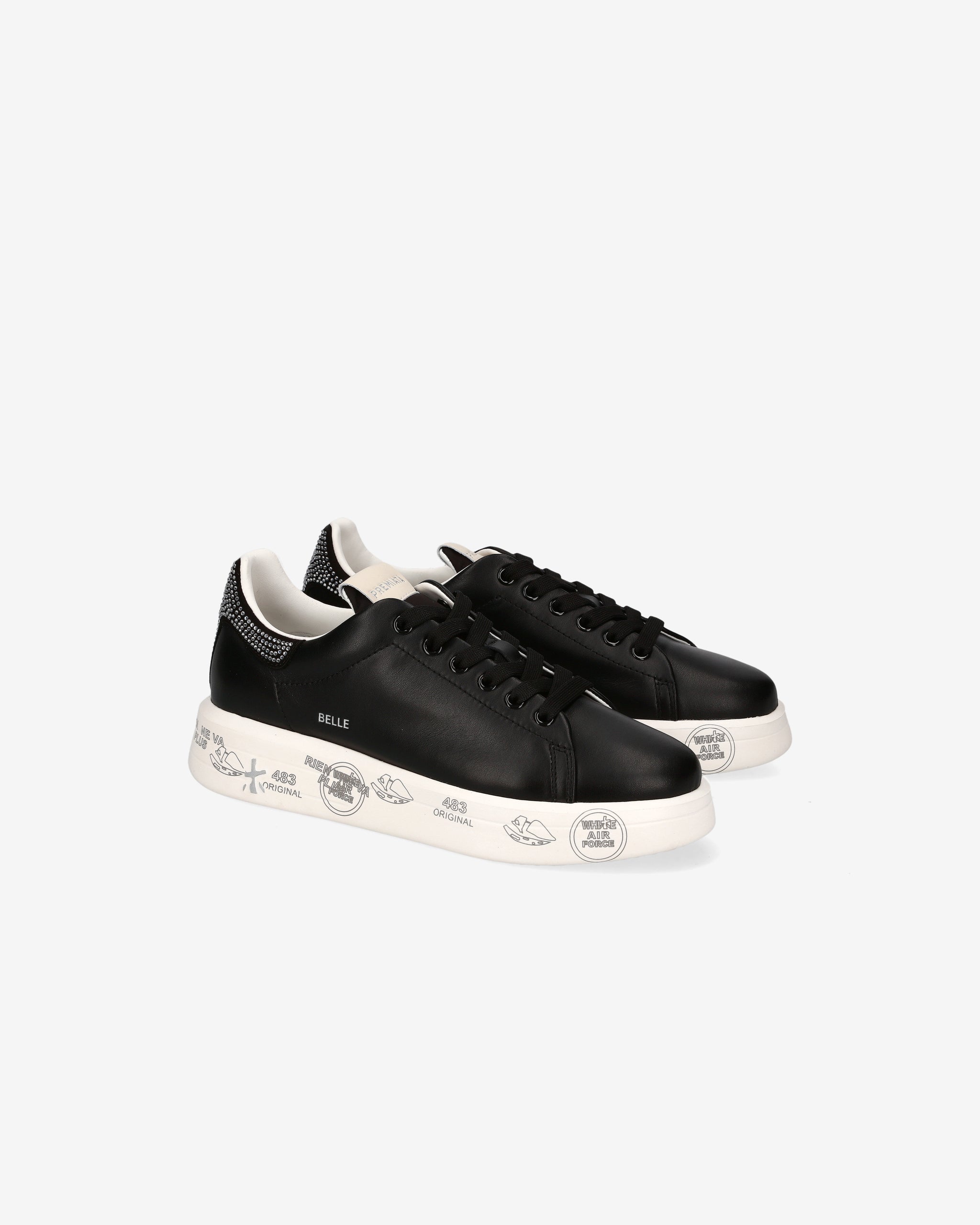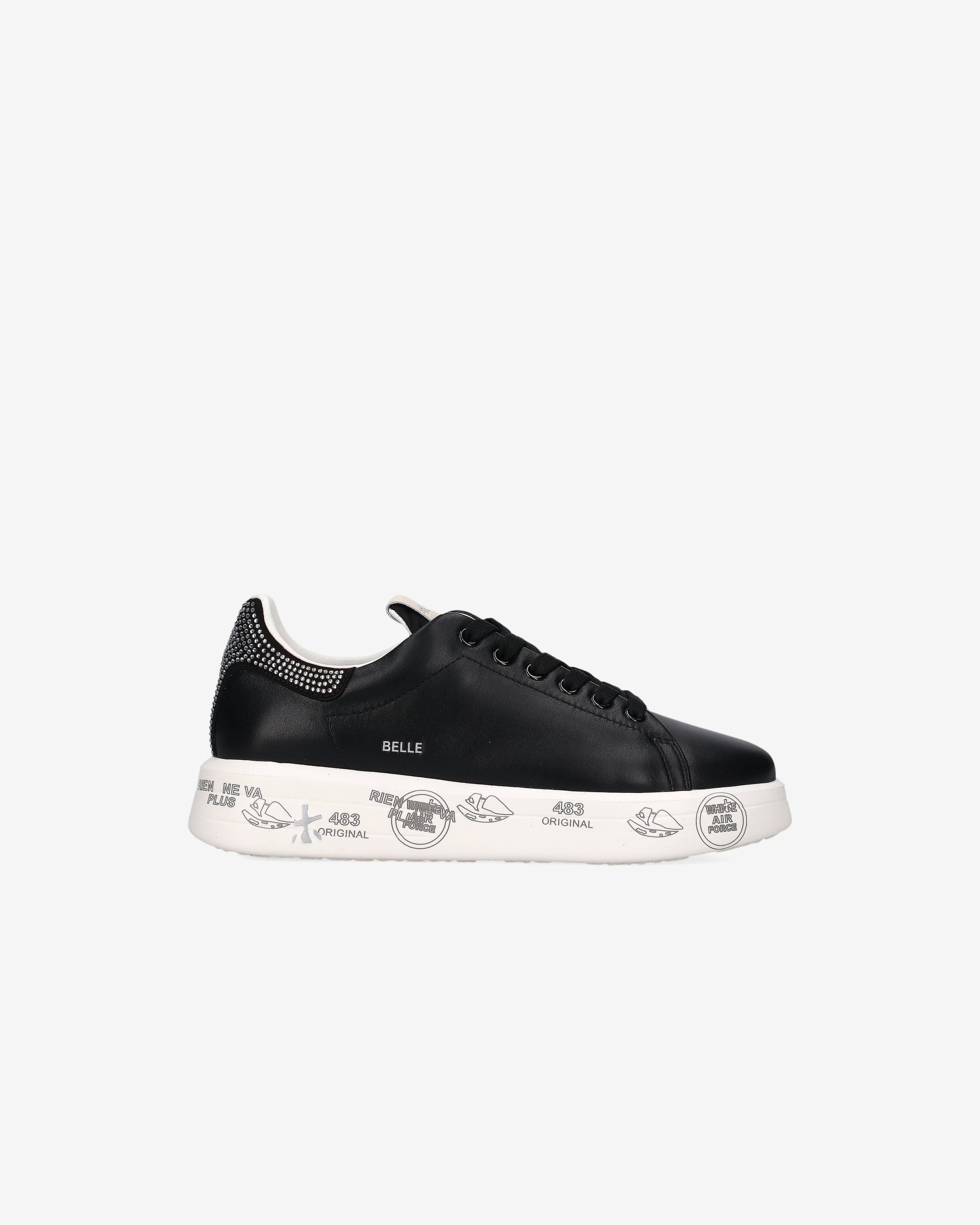 In smooth black leather with jewel detailing on the heel, the Belle sneaker is distinguished by a gritty elegance. Ton sur ton laces and a sole with original Premiata signature graphics add character and recognizability. The essential design is embellished with the brand's signature side lettering and comfort.