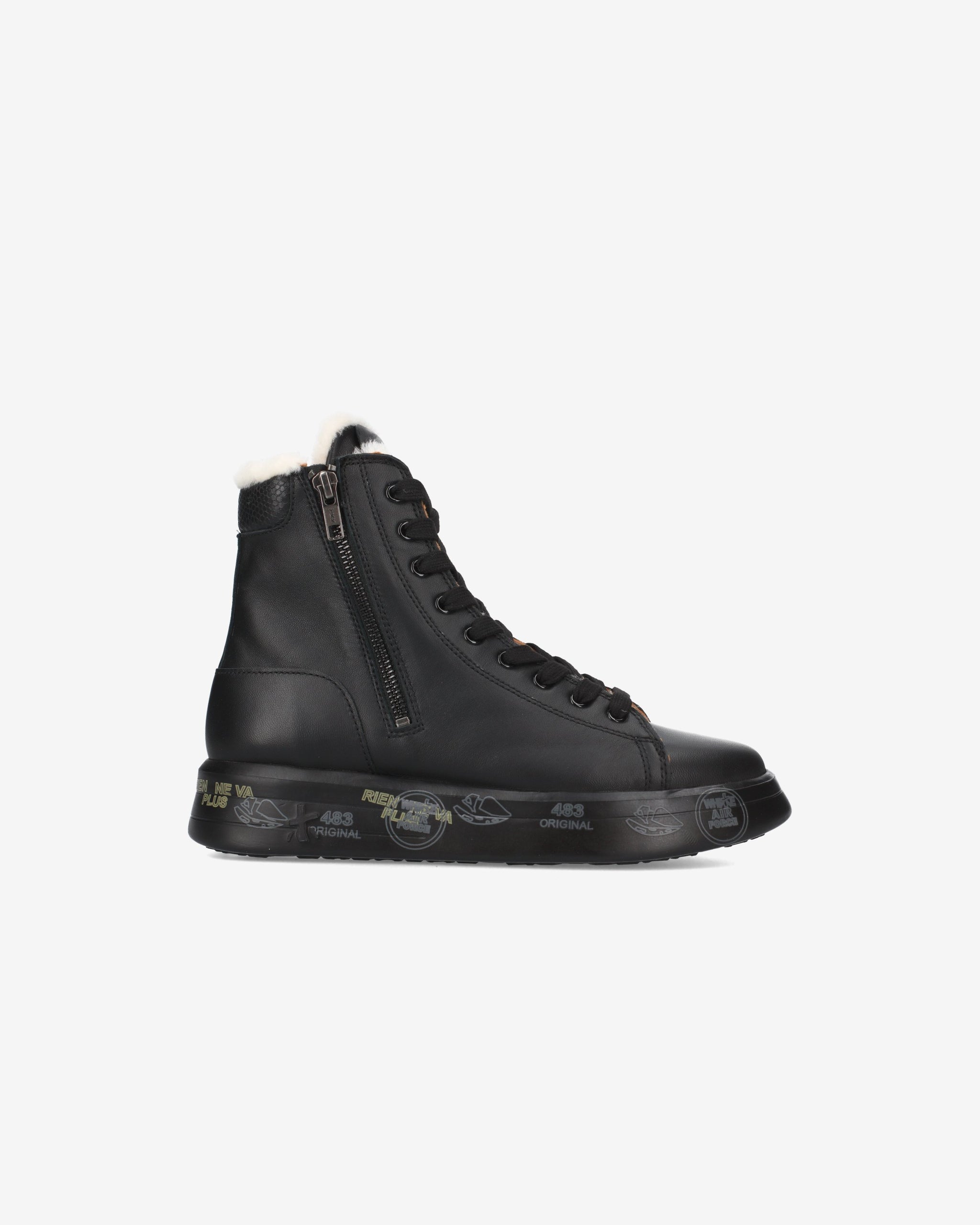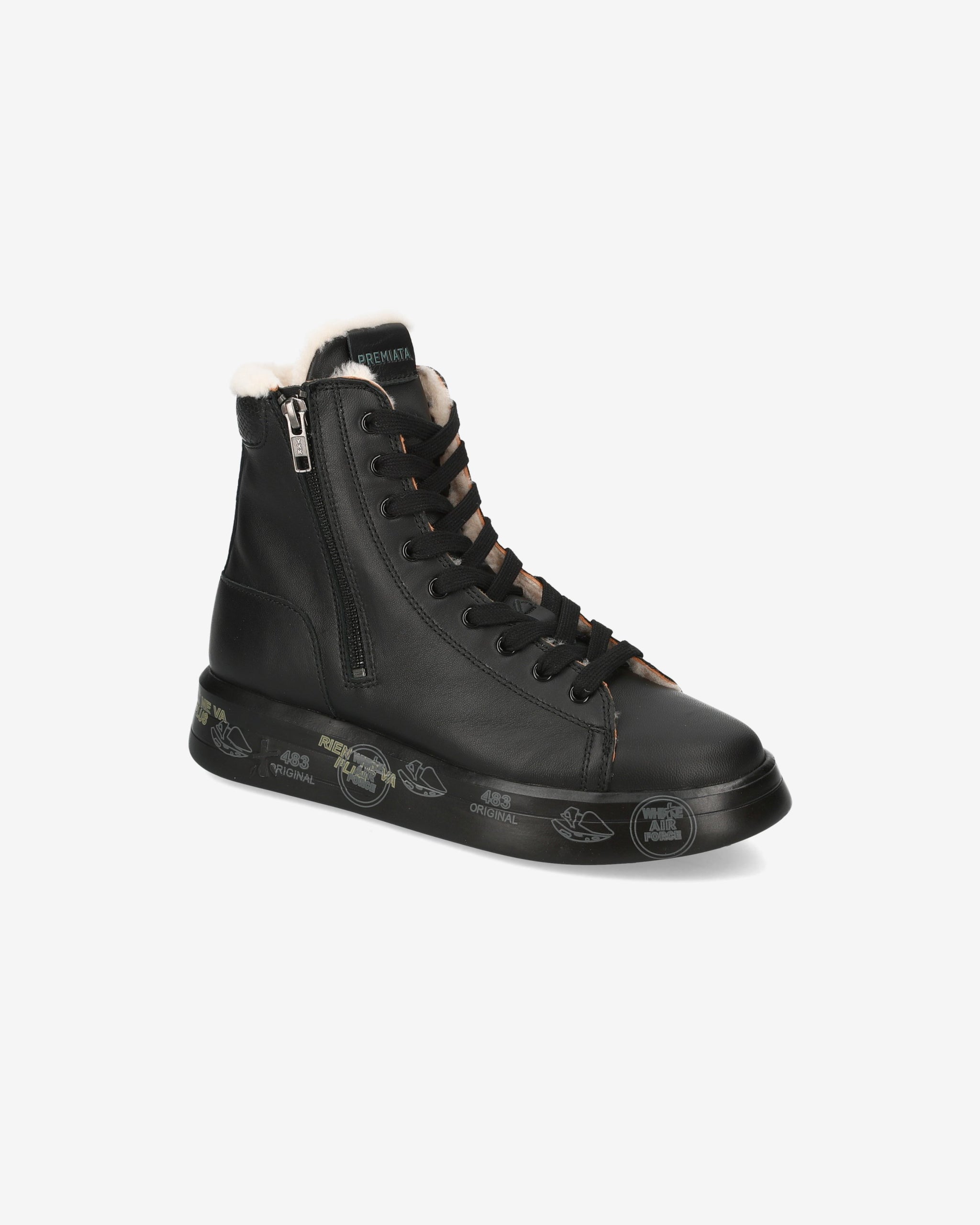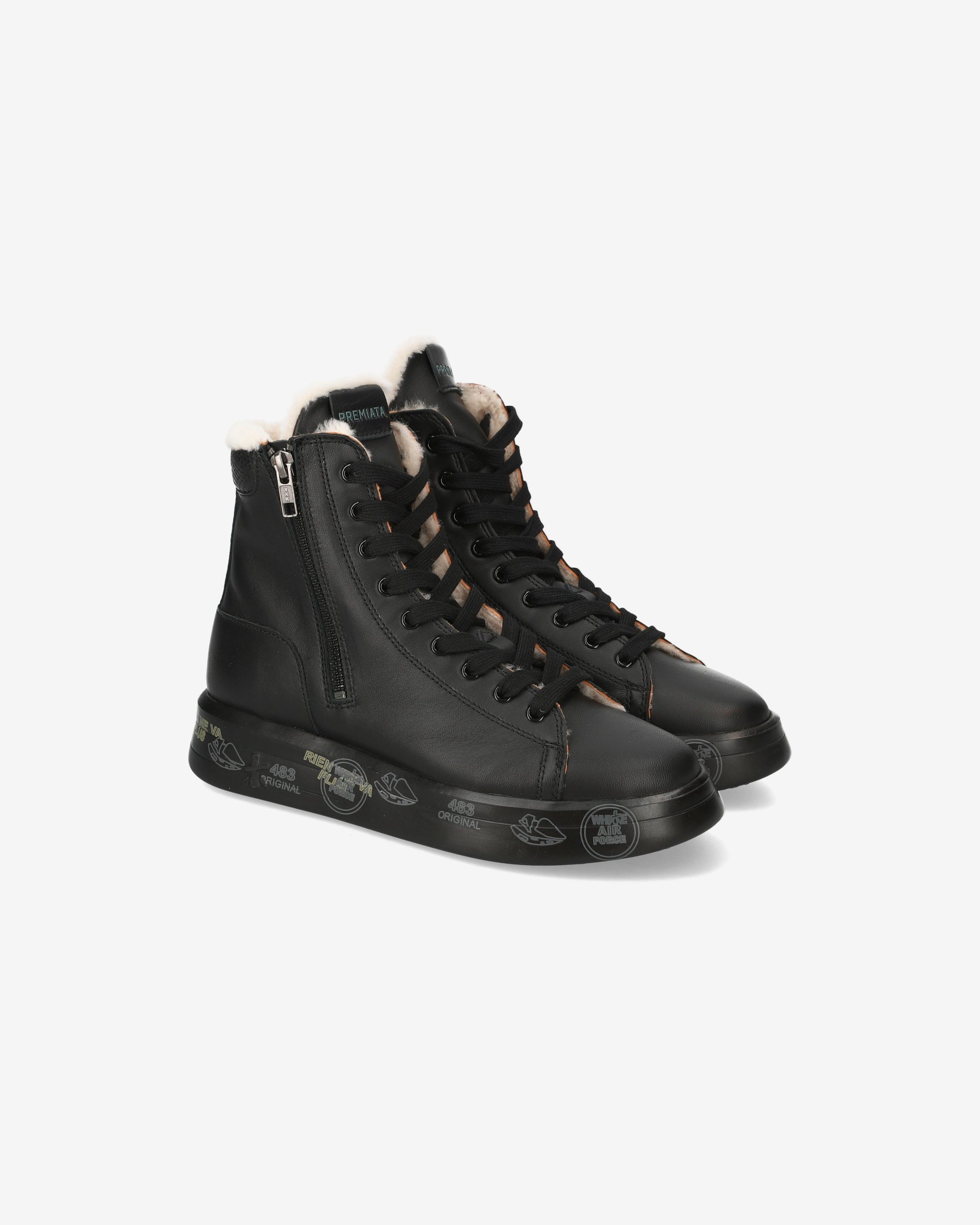 Black leather sneakers with round toe and printed leather detail. Premiata logo on tongue and heel. Zipper on side and sheepskin lining. Oversize rubber sole featuring the legendary stamps that distinguish the uniqueness of the Brand.