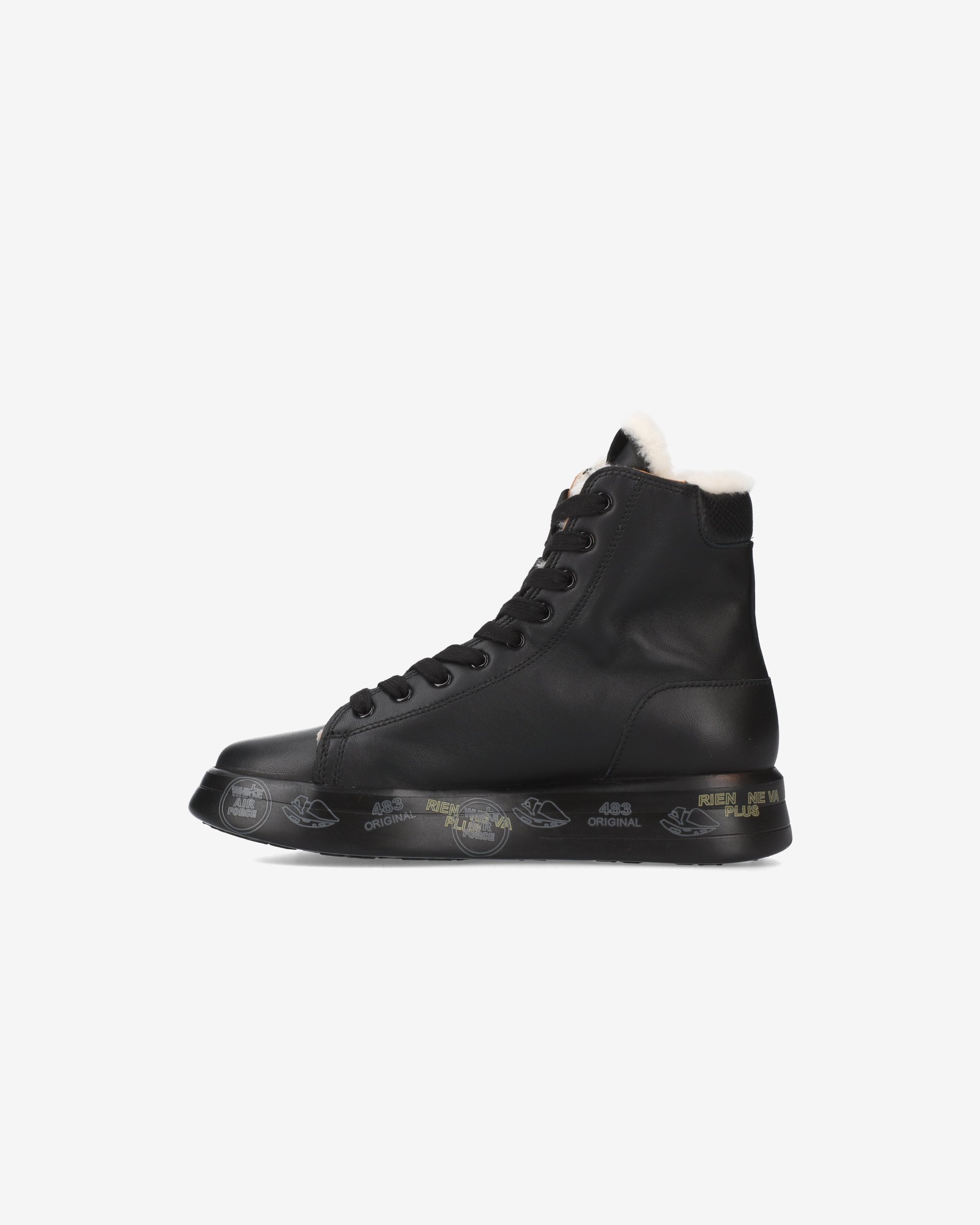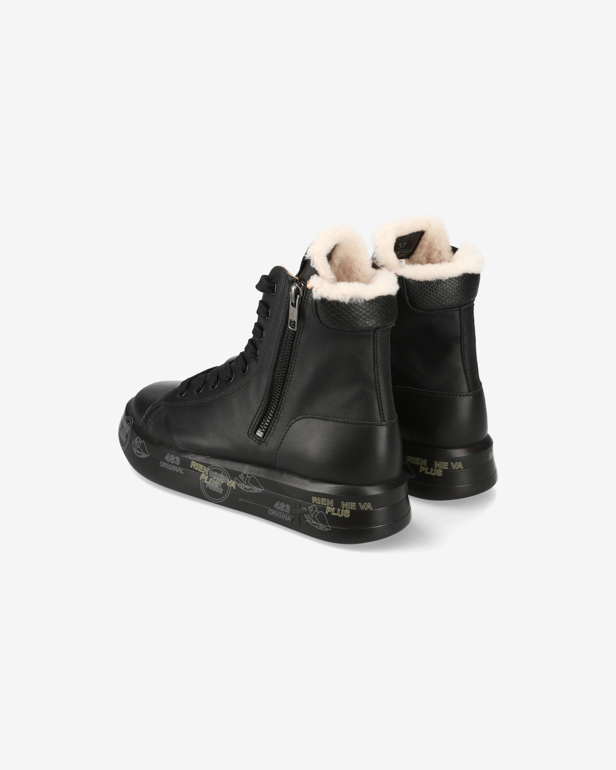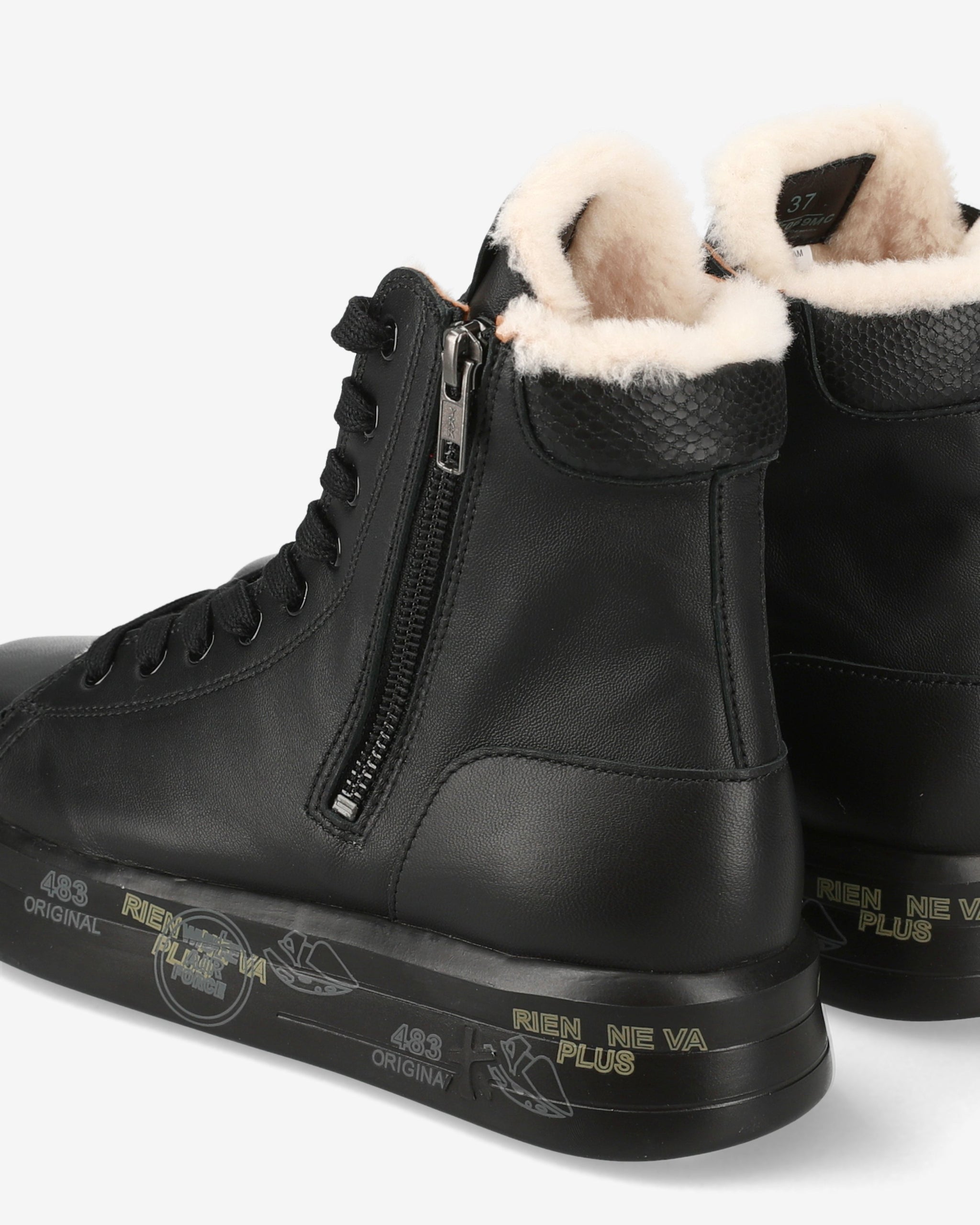 Black leather sneakers with round toe and printed leather detail. Premiata logo on tongue and heel. Zipper on side and sheepskin lining. Oversize rubber sole featuring the legendary stamps that distinguish the uniqueness of the Brand.