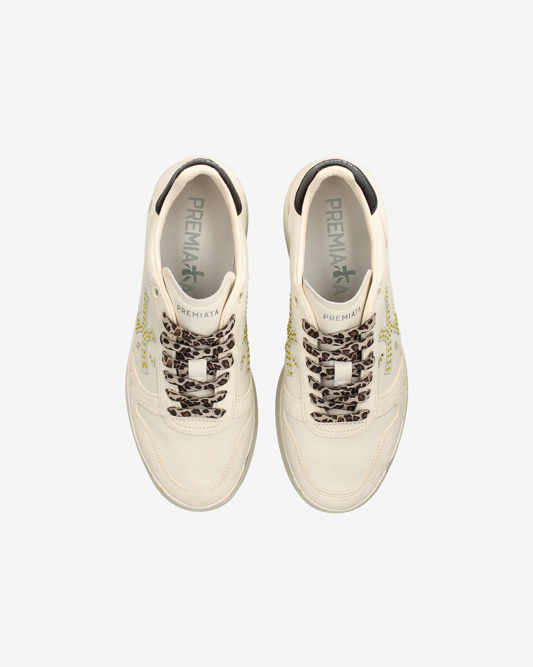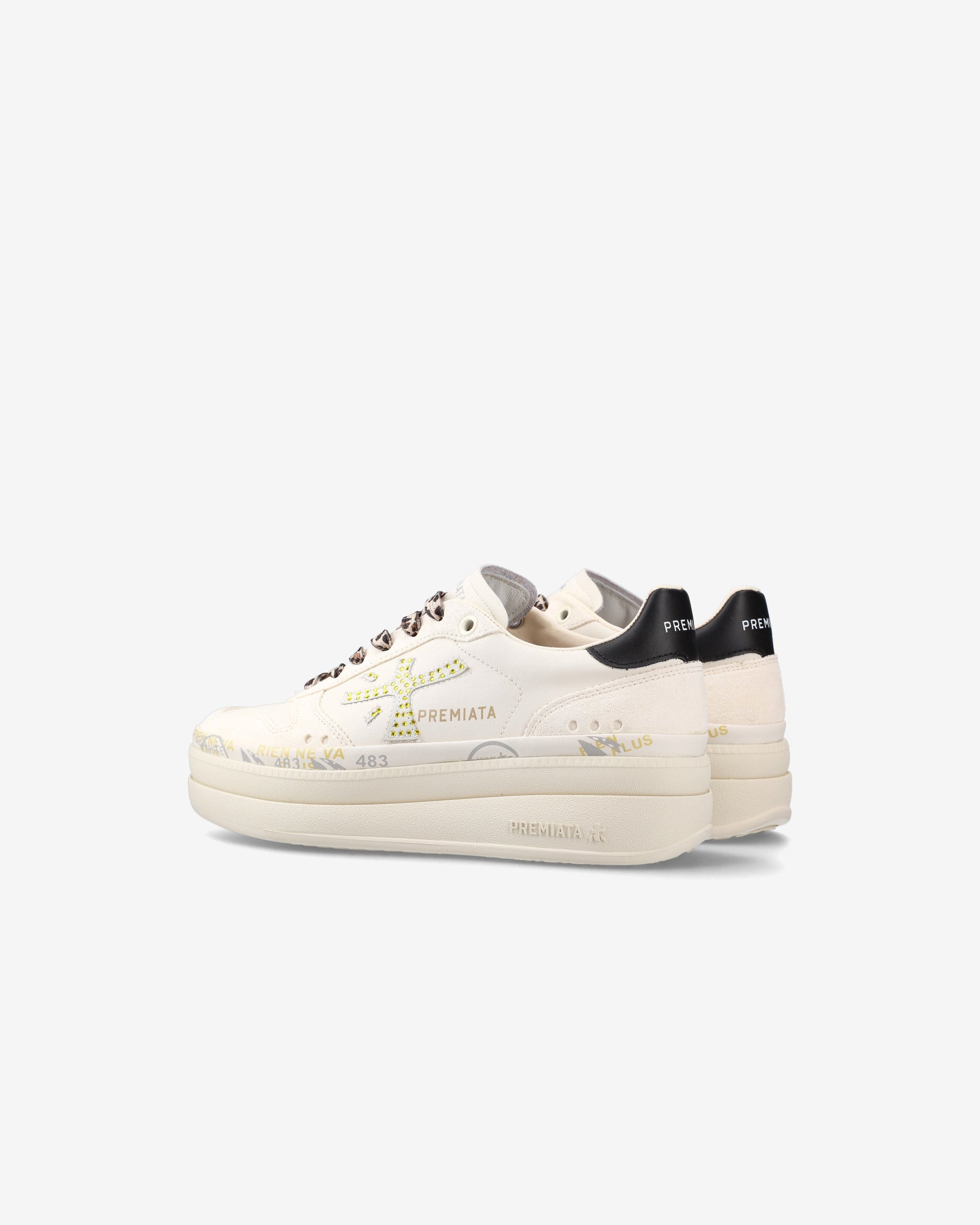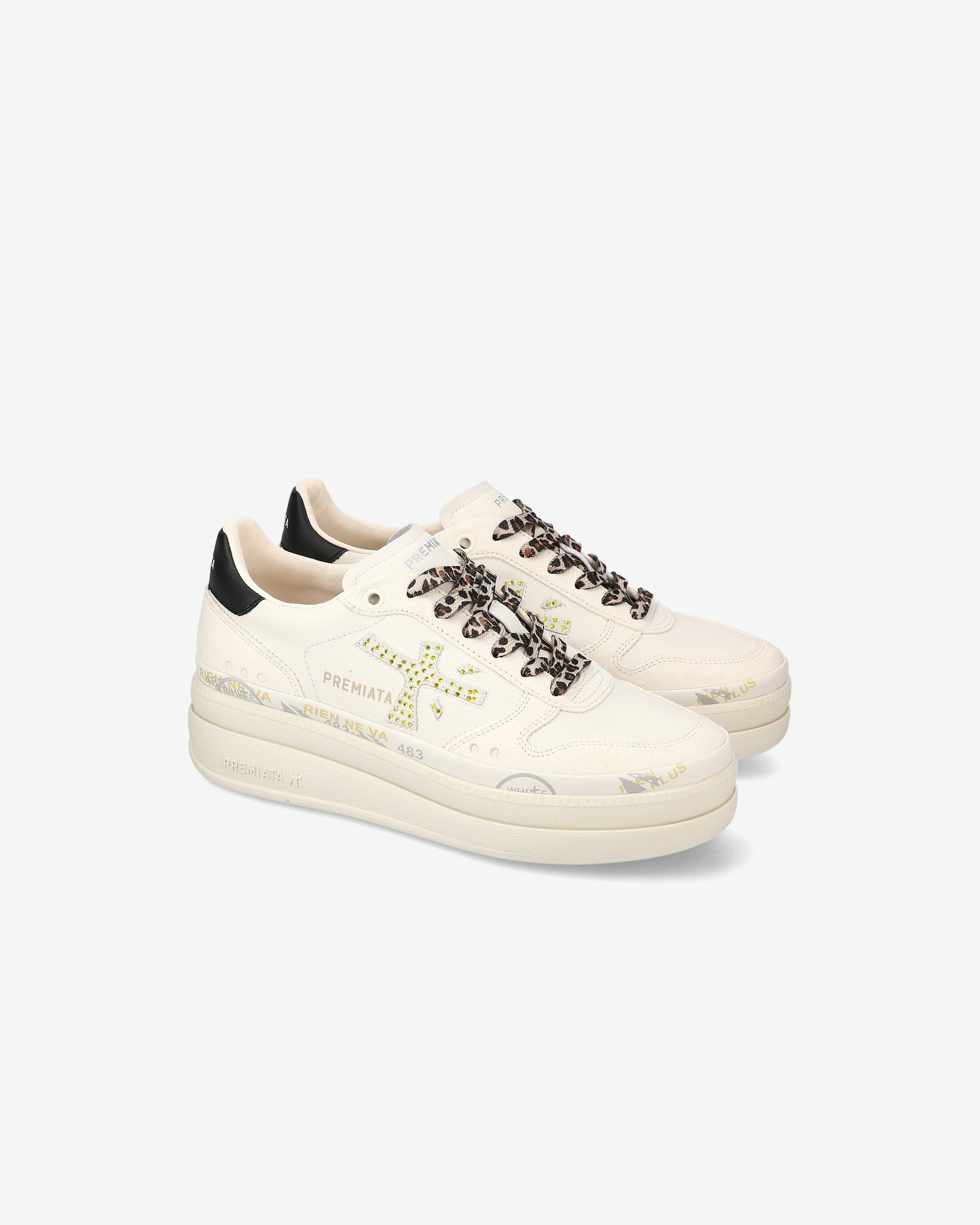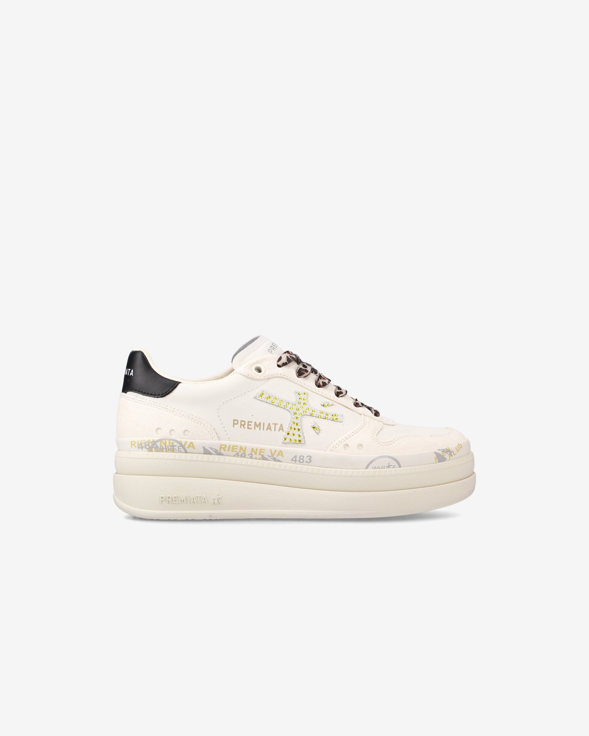 Among Premiata's new must-haves. Style reaches new heights, combining designs such as a double-layered platform sole with a midsole embellished with the brand's iconic stamps.