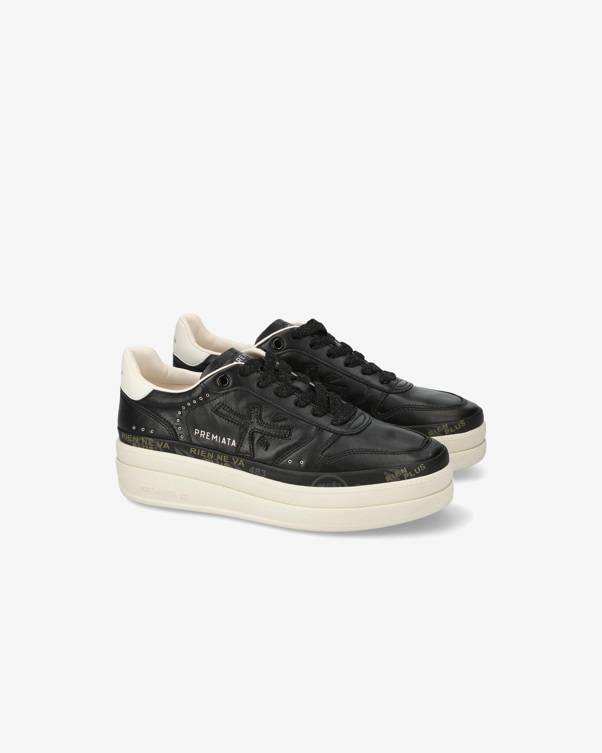 Among Premiata's new must-haves. Style reaches new heights, combining designs such as a double-layered platform sole with a midsole embellished with the brand's iconic stamps.