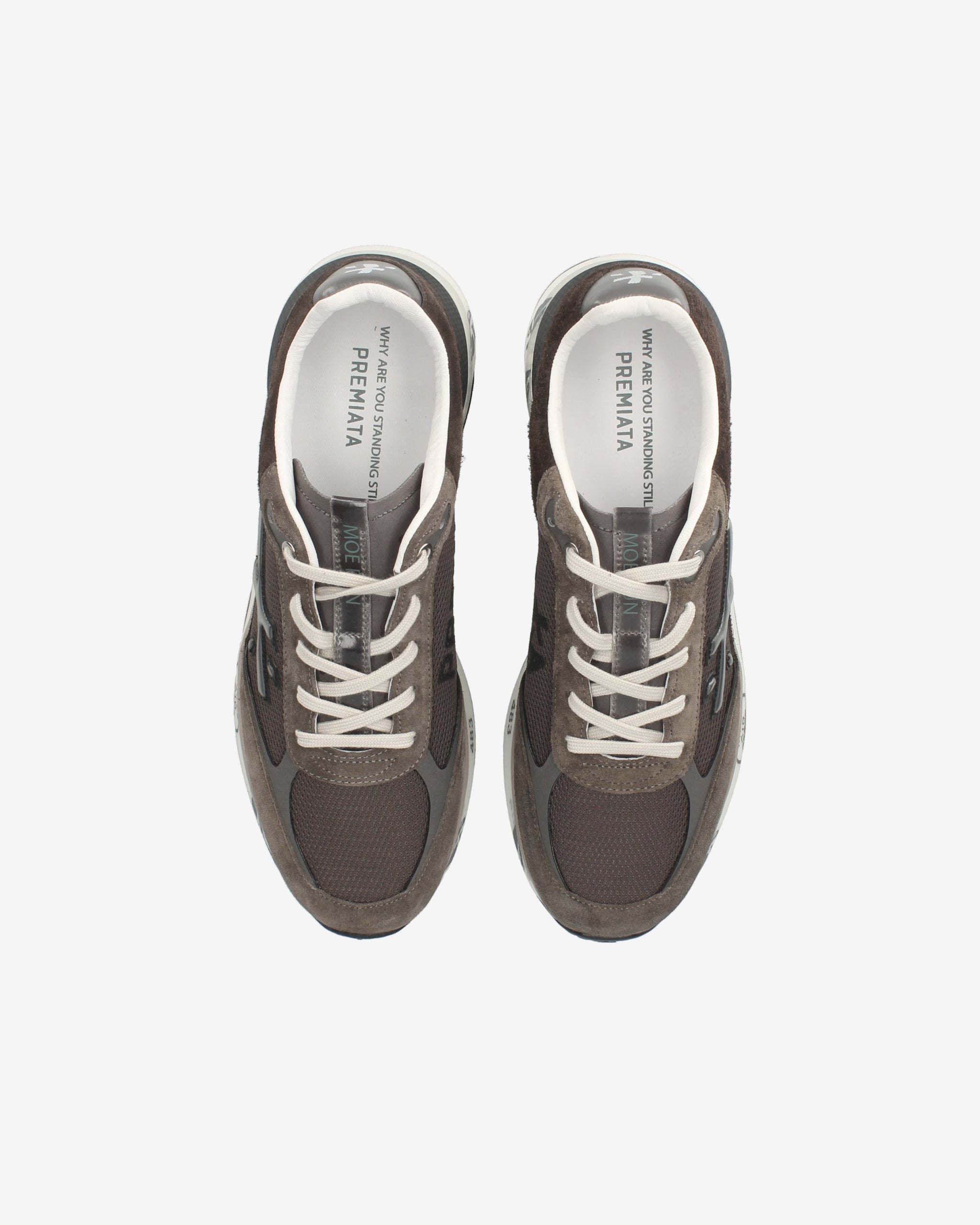 Designed to impress. The Moe run relies on the lightness of movement, stability and cushioning feel provided by the innovation of the bottom. The new silhouette is rich in details: logo on the outer side, PREMIATA lettering on the inner side, and model name on the label.