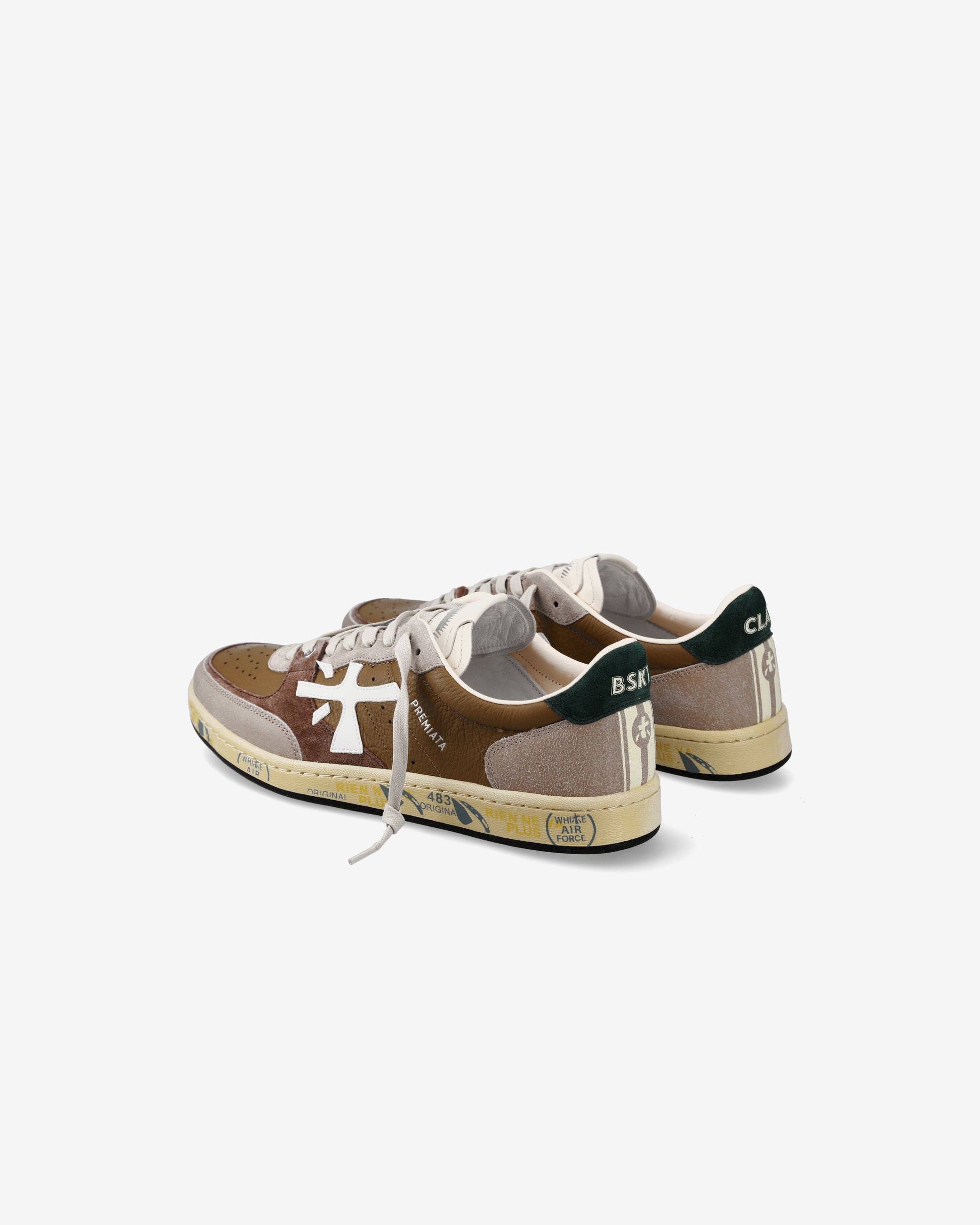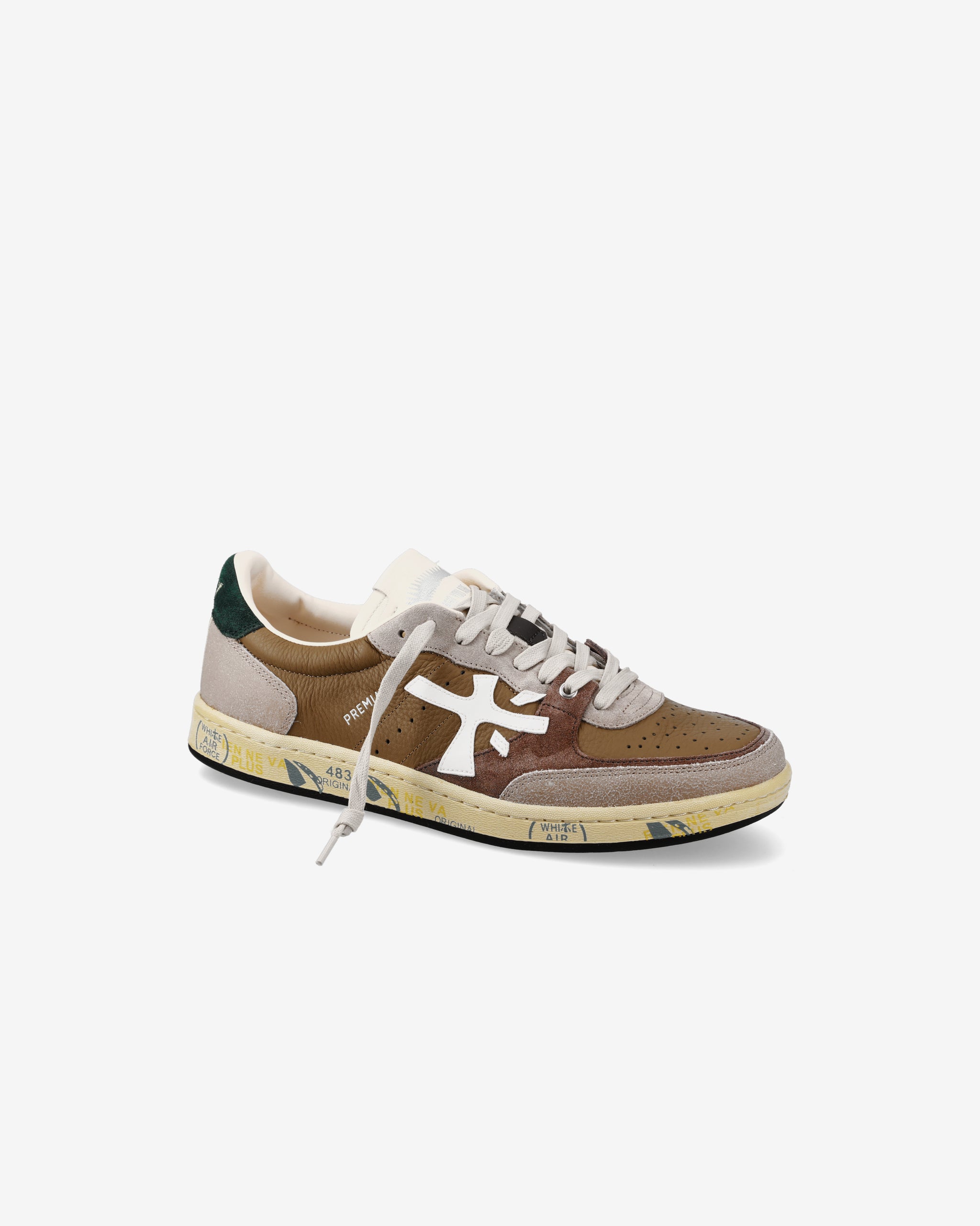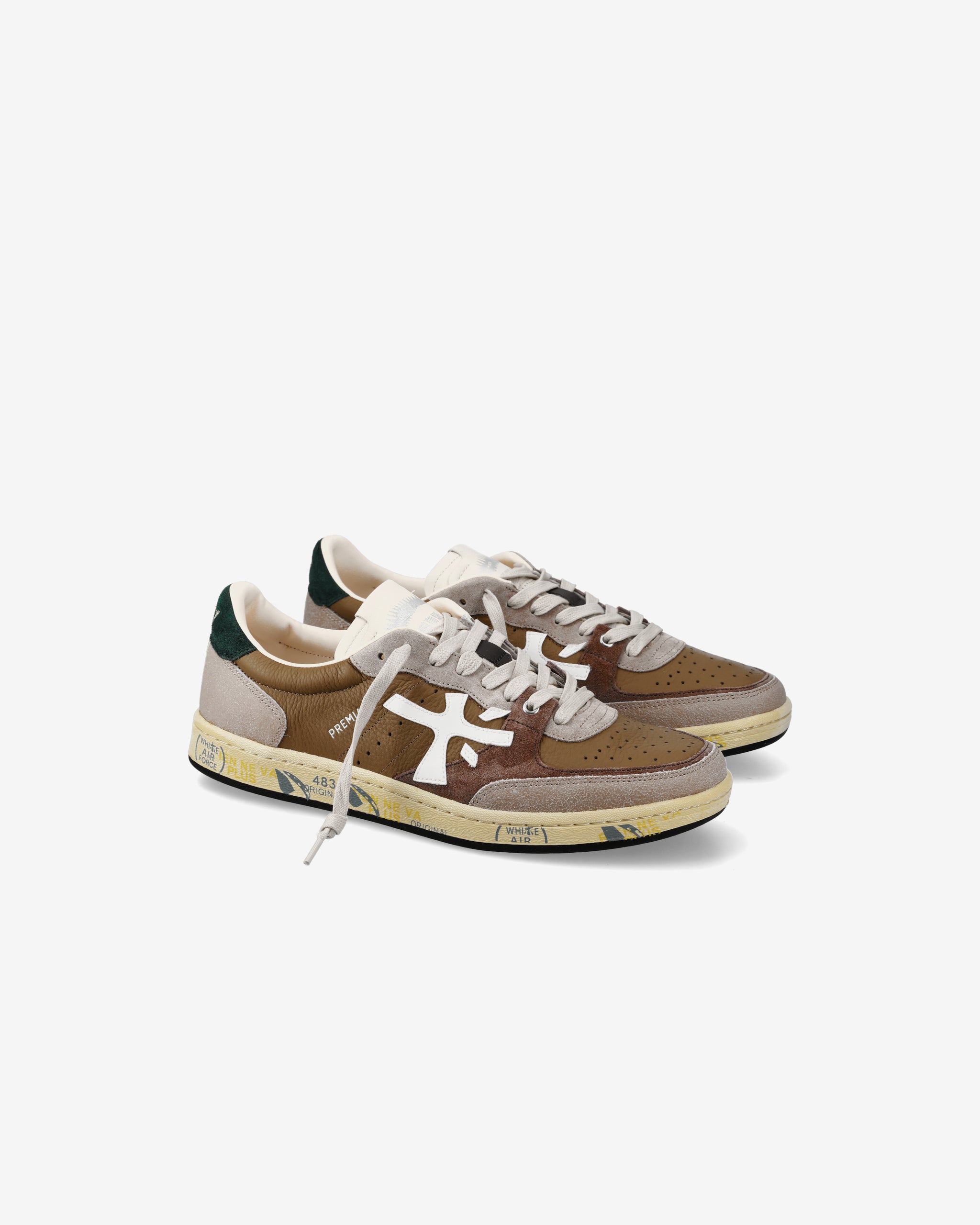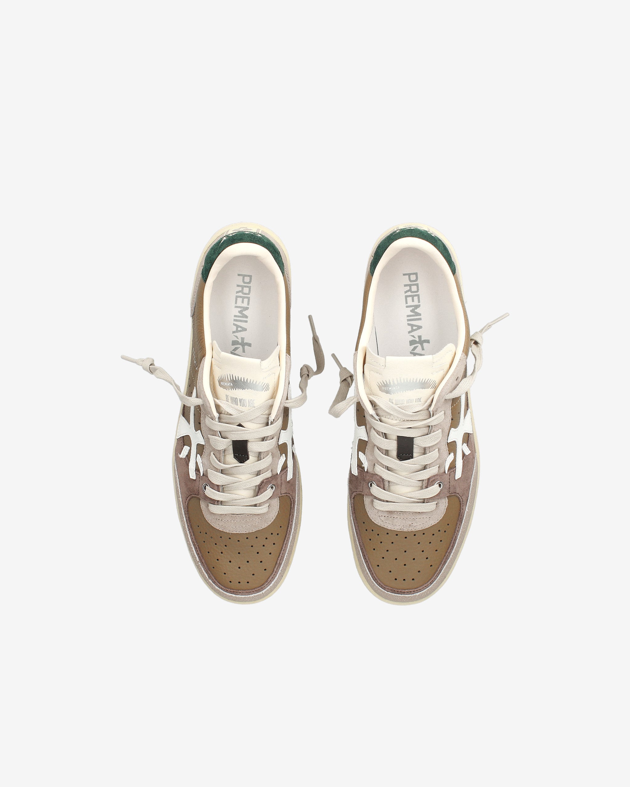 Vintage aesthetic and contemporary spirit. This sneaker combines essential lines and bold details, such as the oversized side logo and the Premiata custom sole. A model designed for those who want to stand out, without sacrificing everyday versatility.
