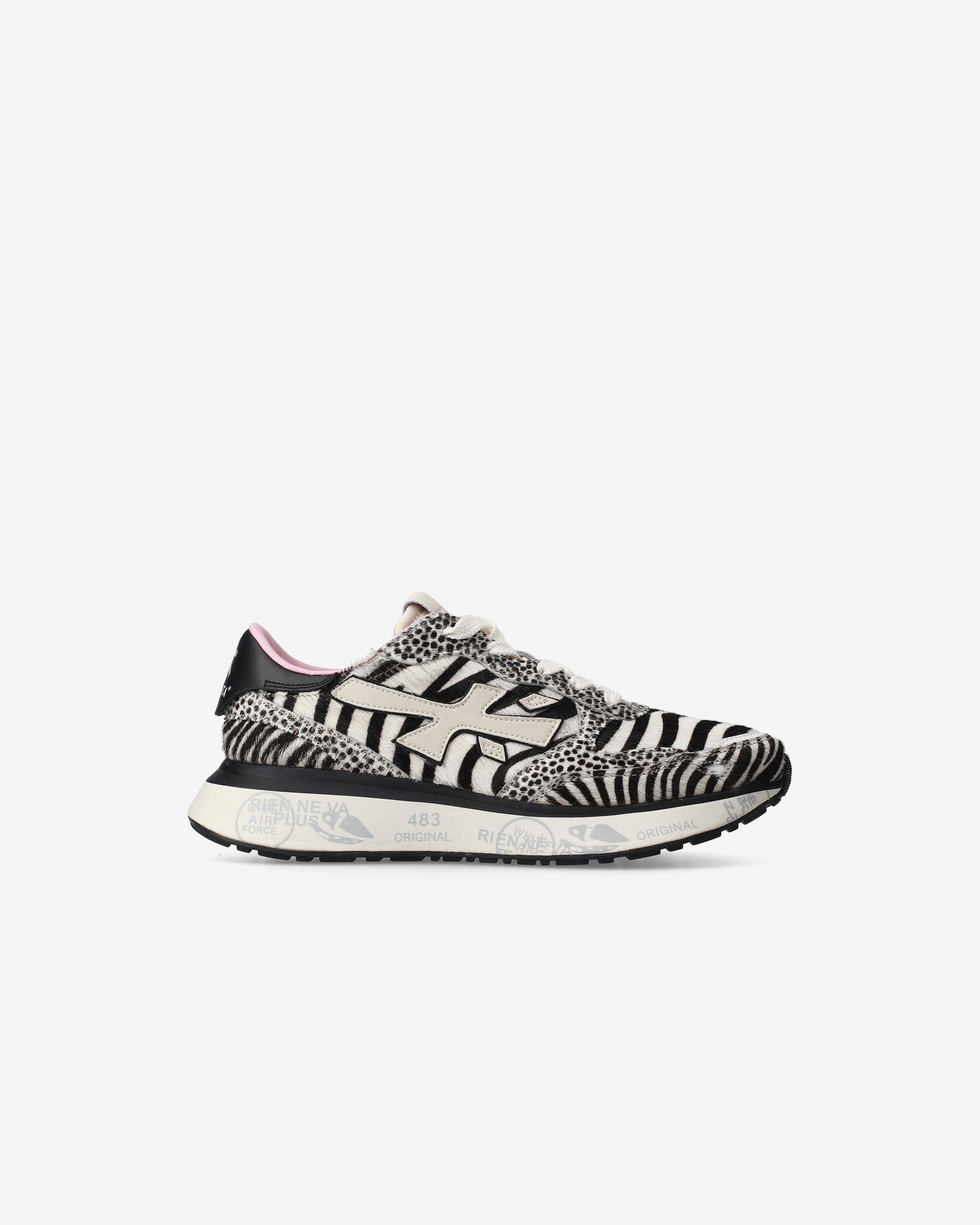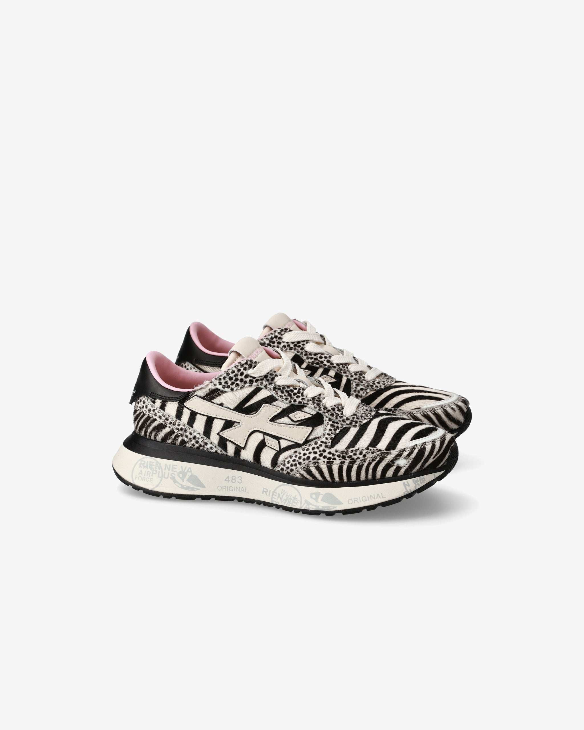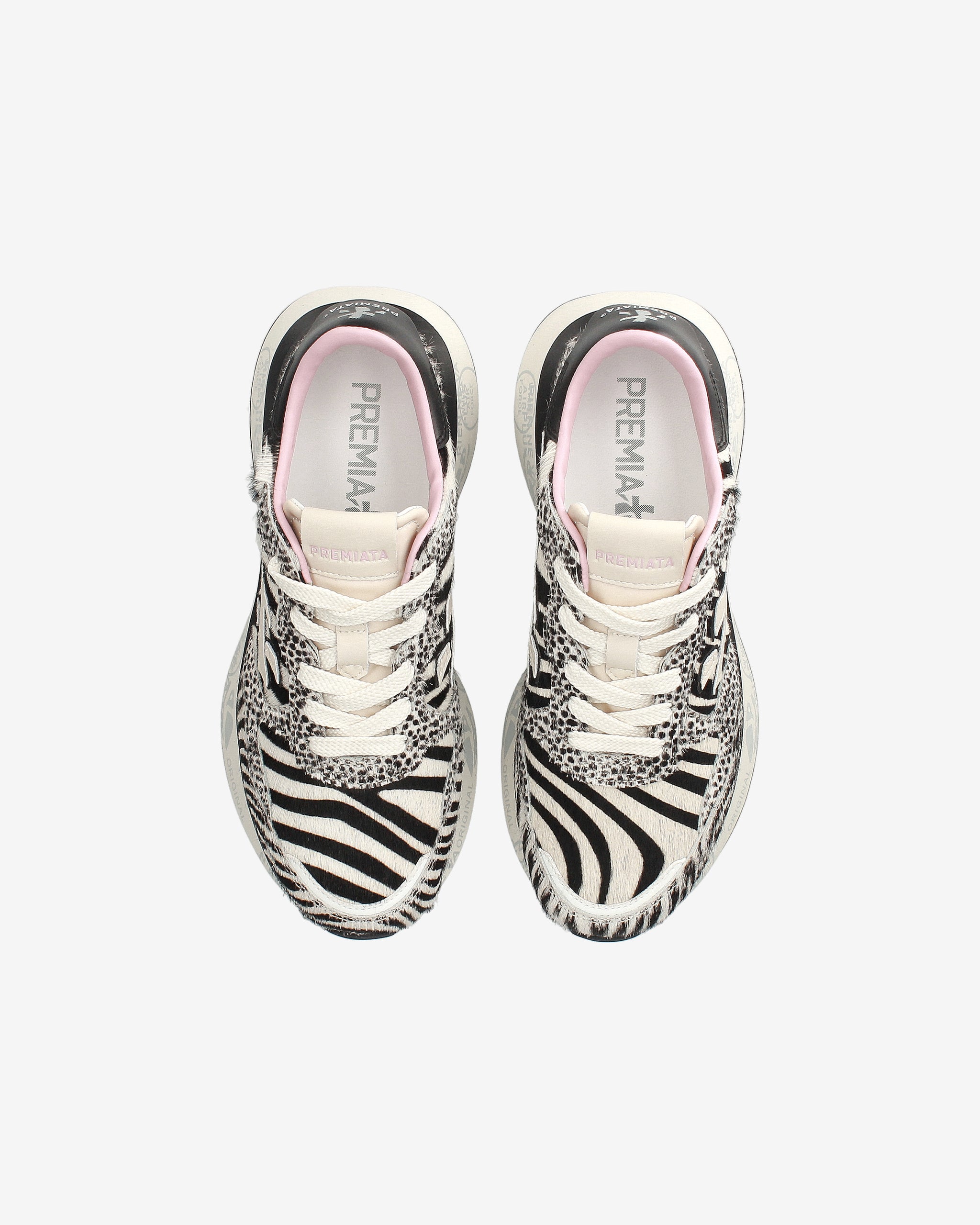 The sole, enhanced by Premiata's iconic style details, enhances the urban and casual-chic identity.