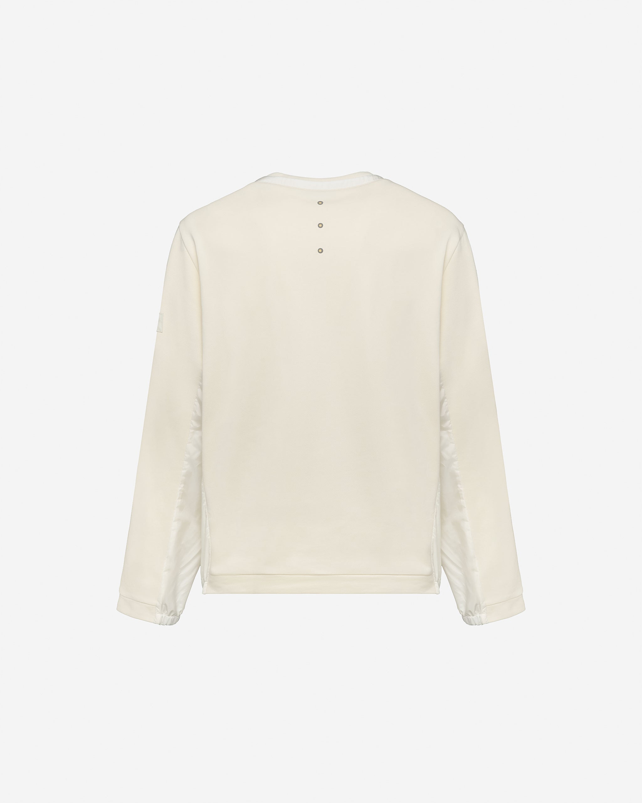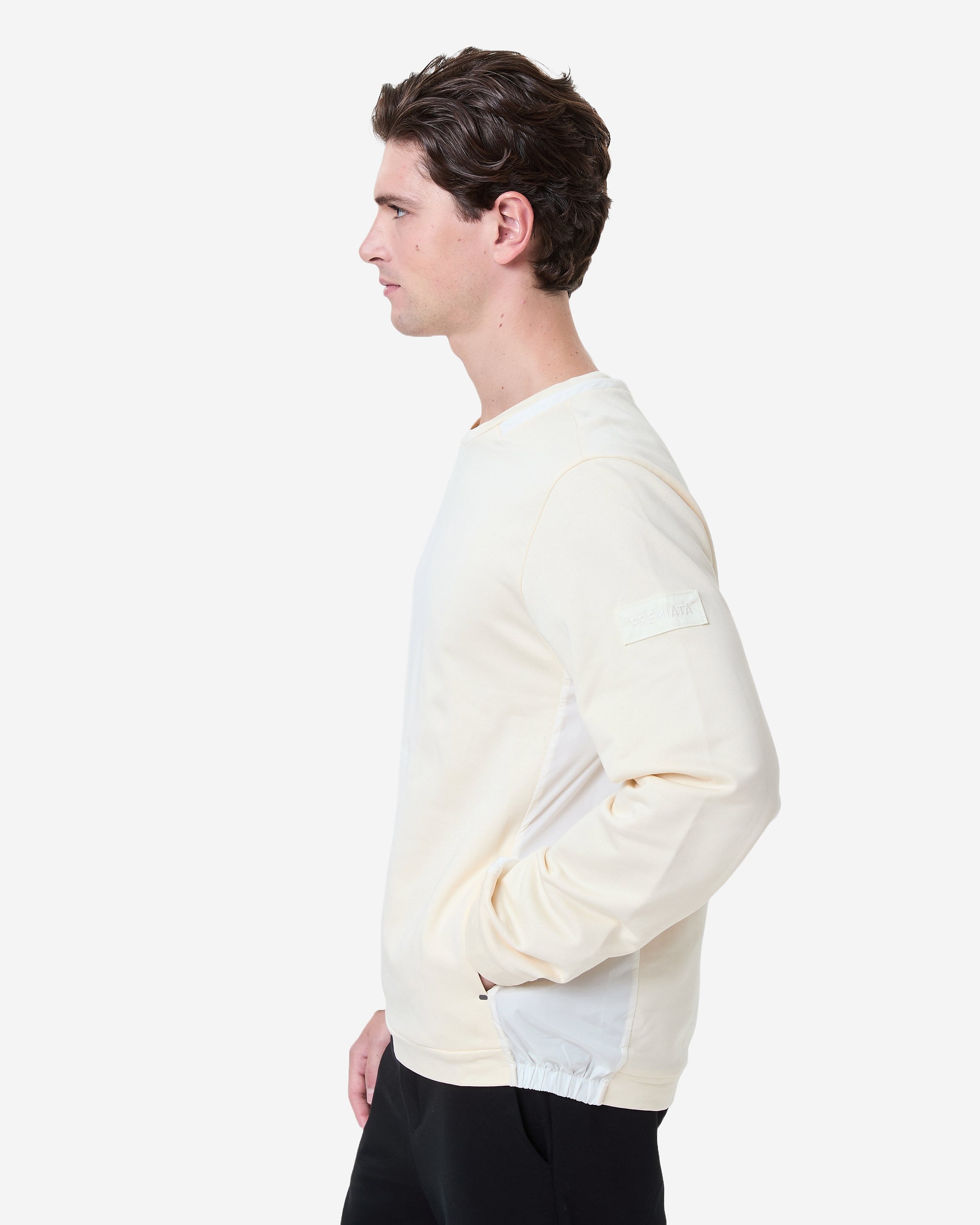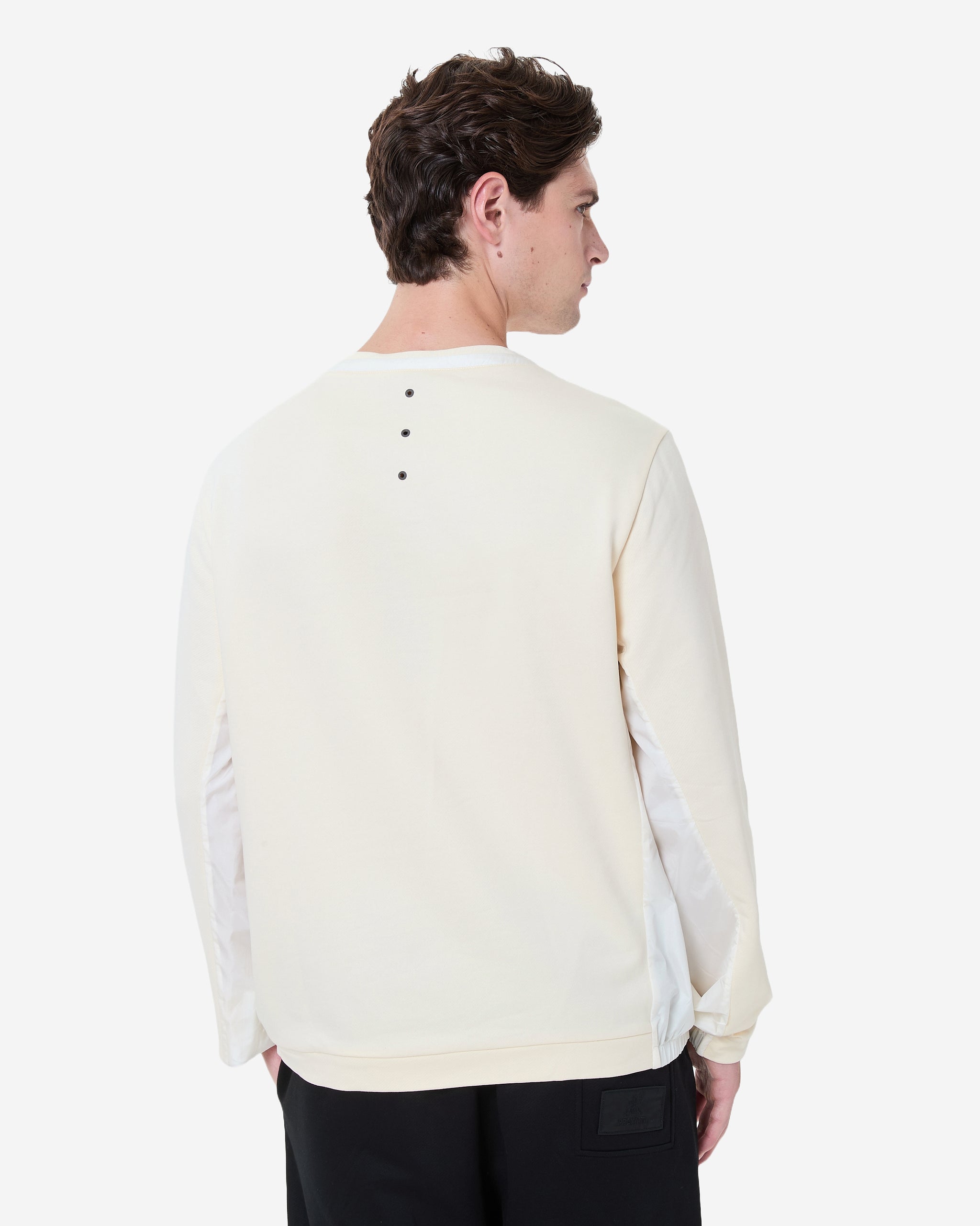 • Cotton crewneck sweatshirt with "paneled" detail in our lightweight nylon: nylon panels along the sides and in the undersleeve.