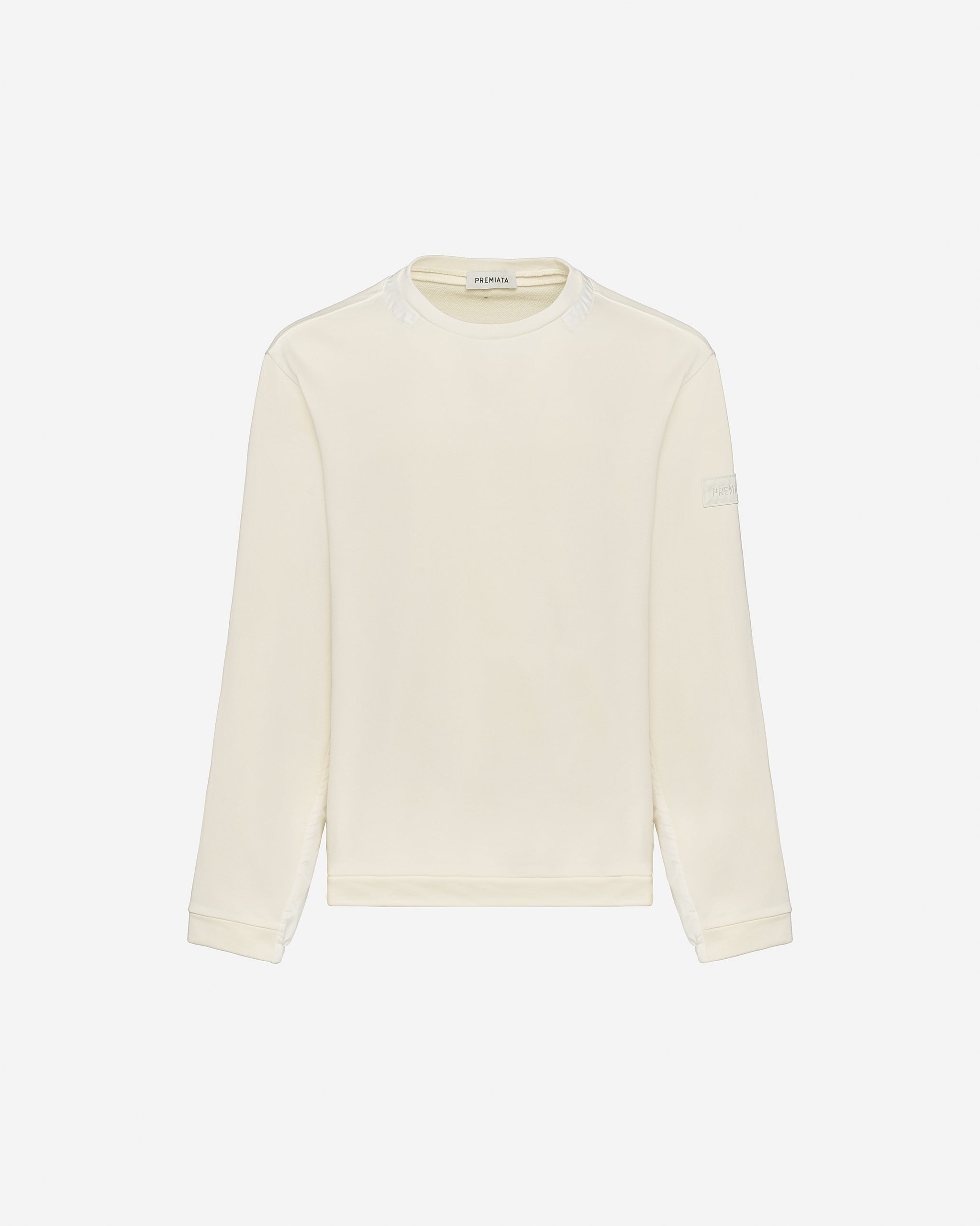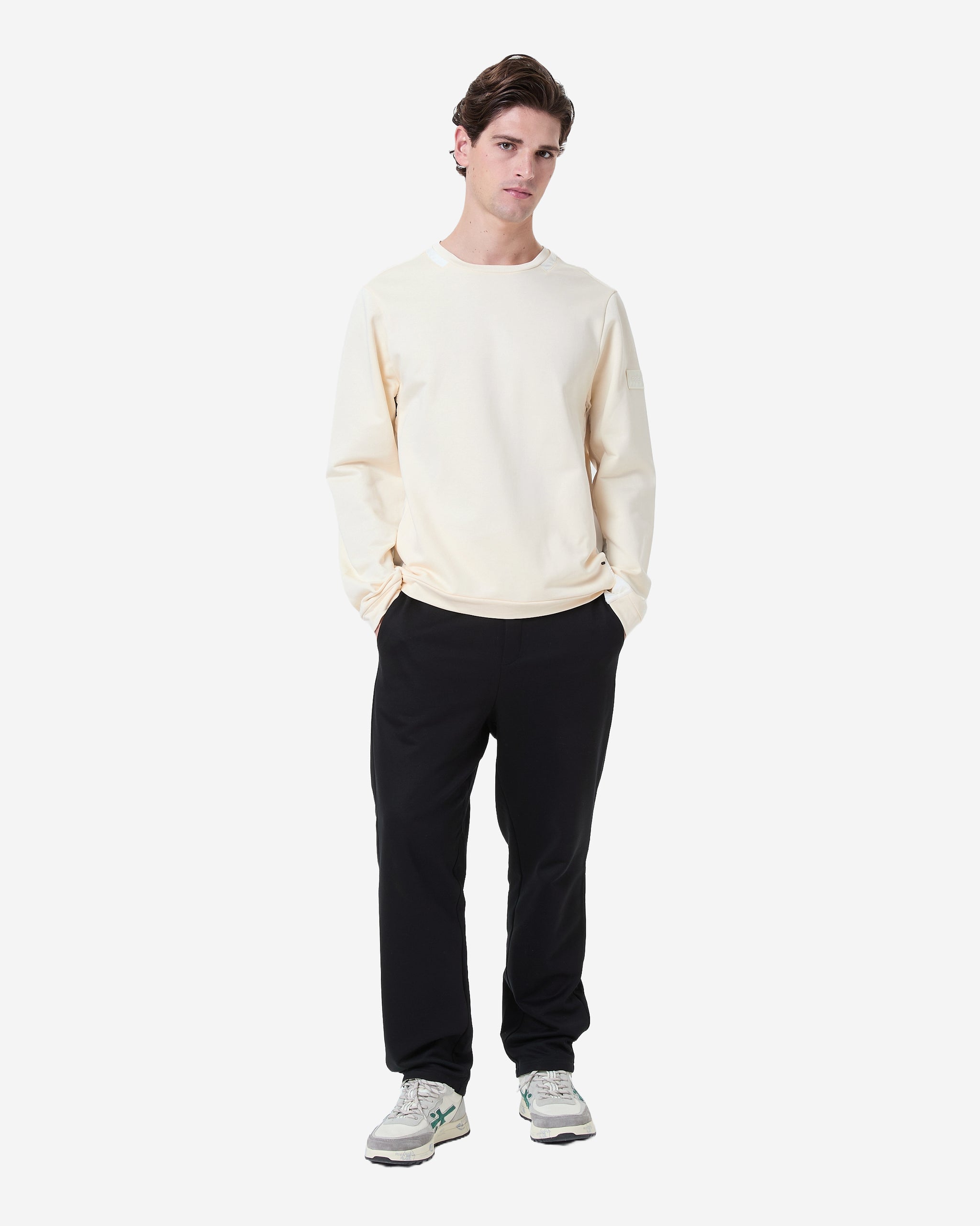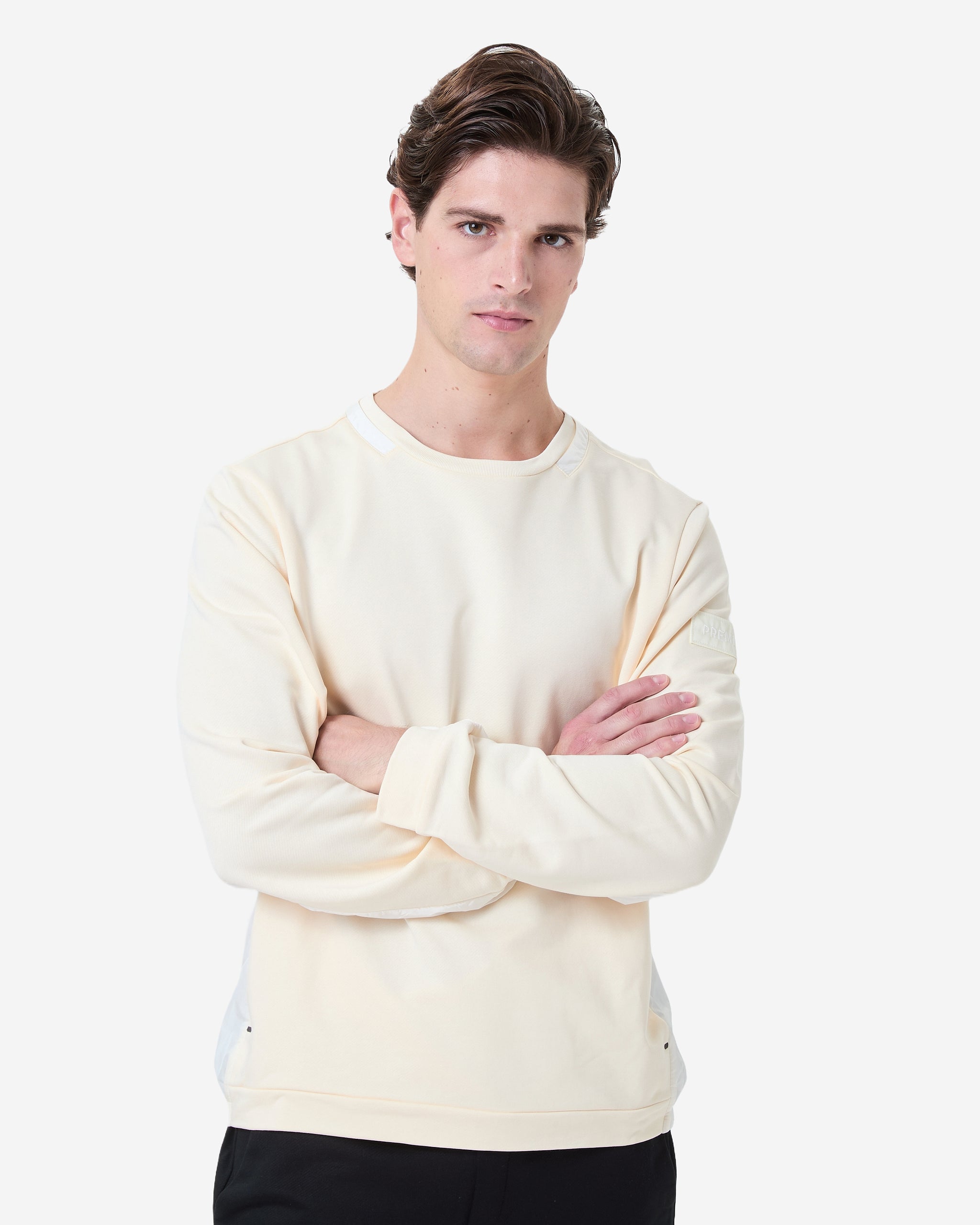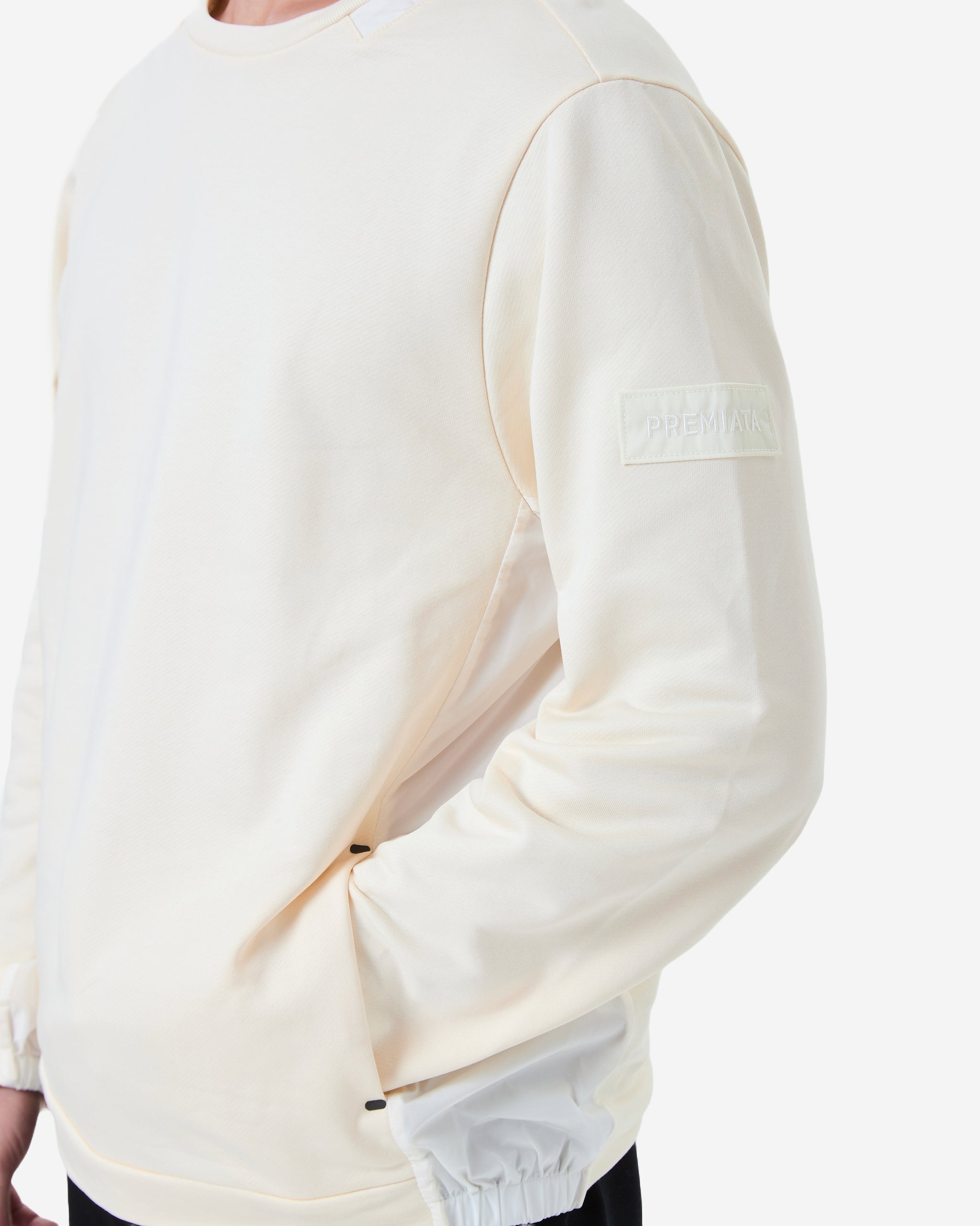 • Cotton crewneck sweatshirt with "paneled" detail in our lightweight nylon: nylon panels along the sides and in the undersleeve.