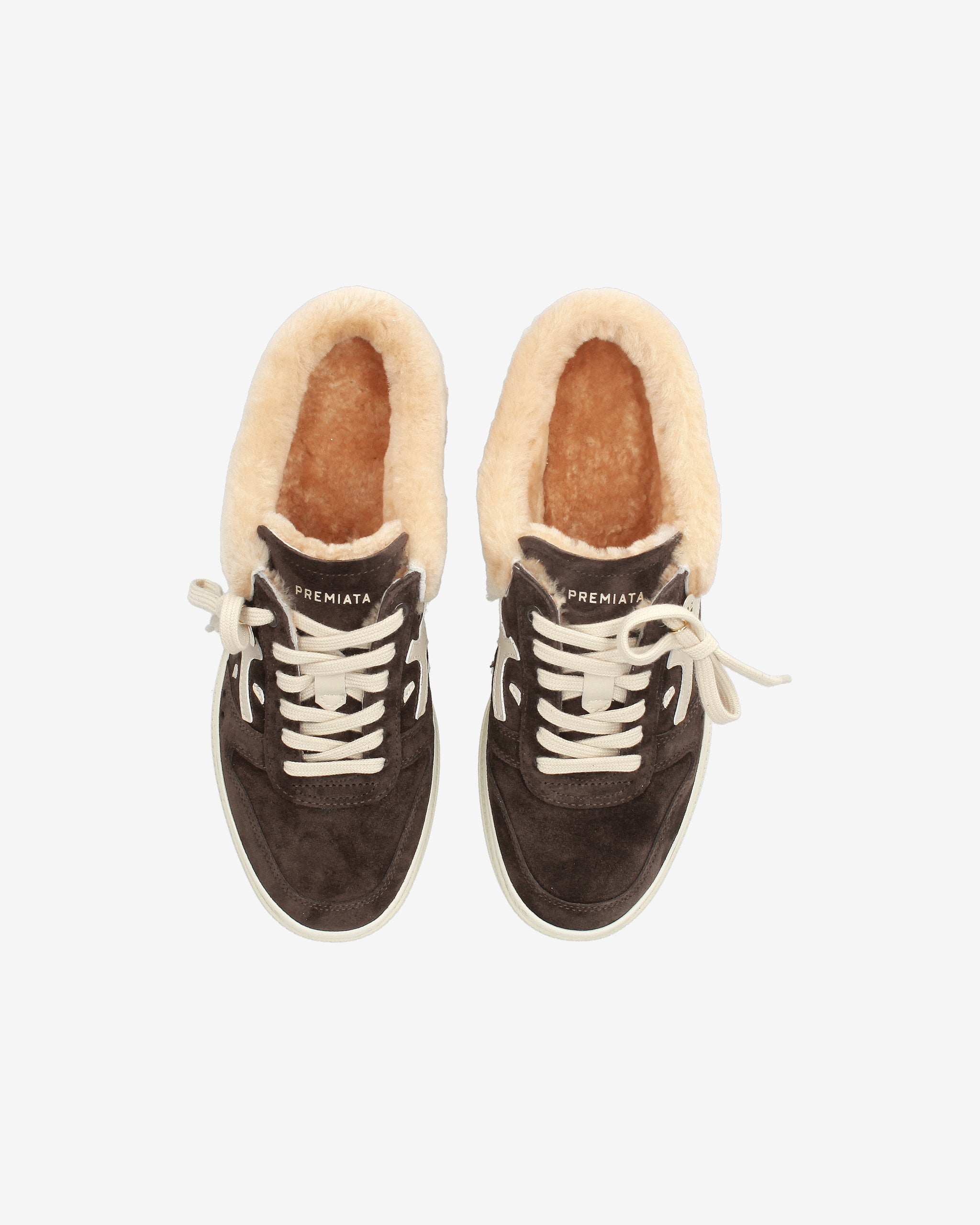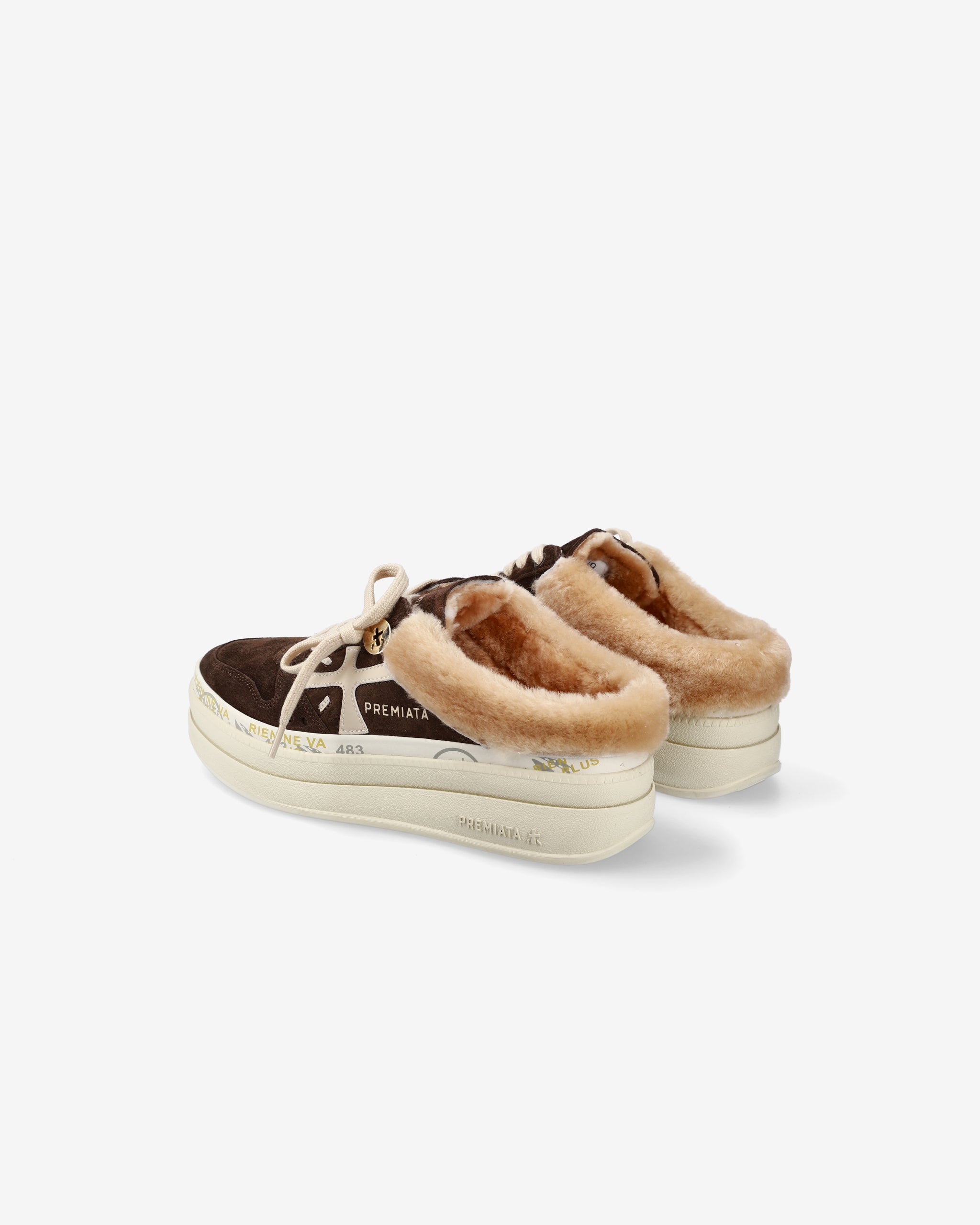 Among Premiata's new must-haves. Style reaches new heights, combining designs such as a double-layered platform sole with a midsole embellished with the brand's iconic stamps and a sheepskin-lined interior.