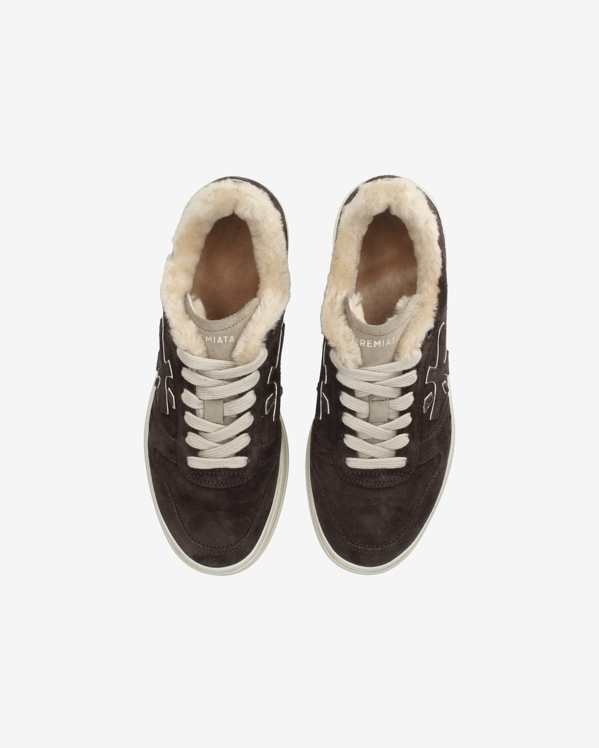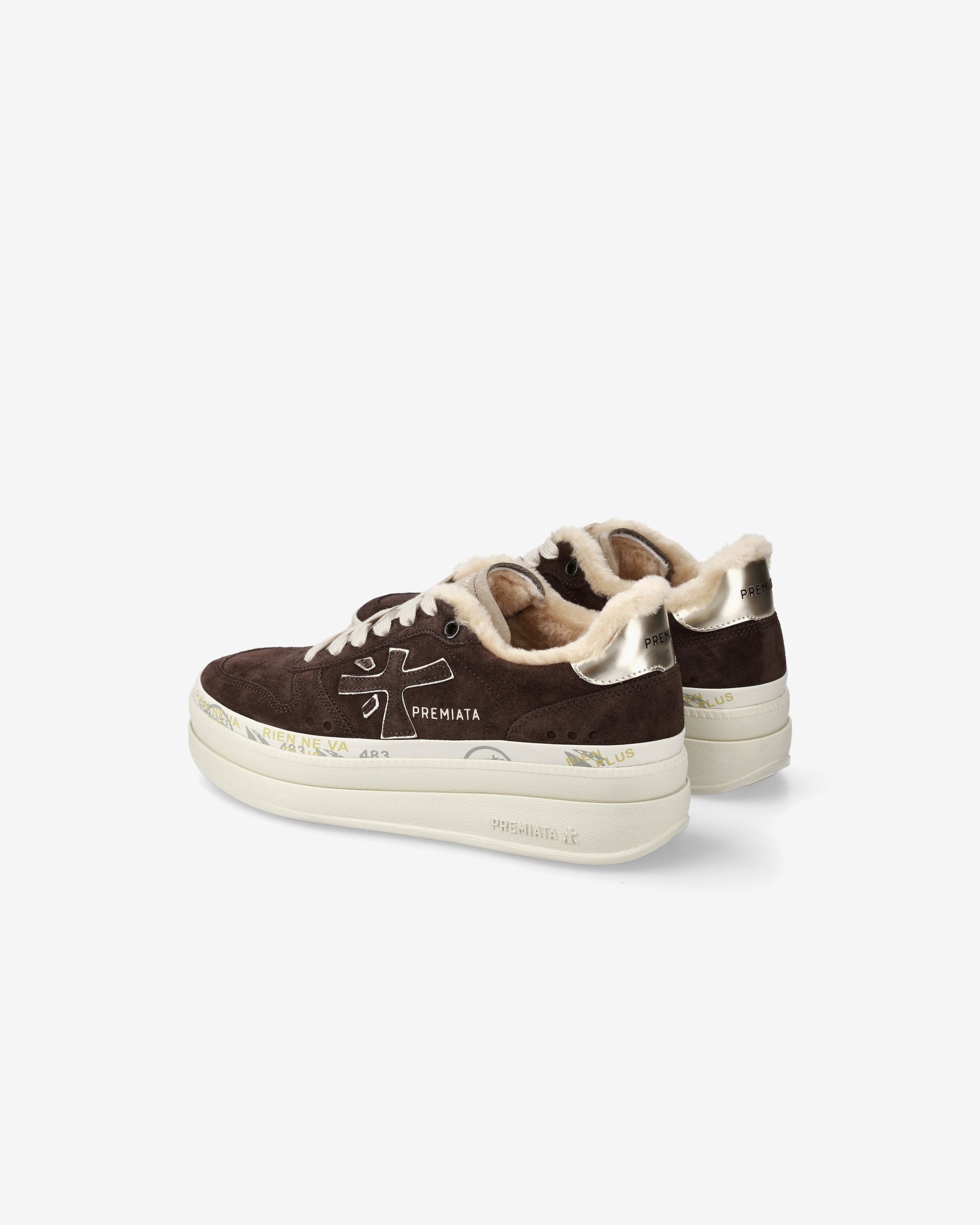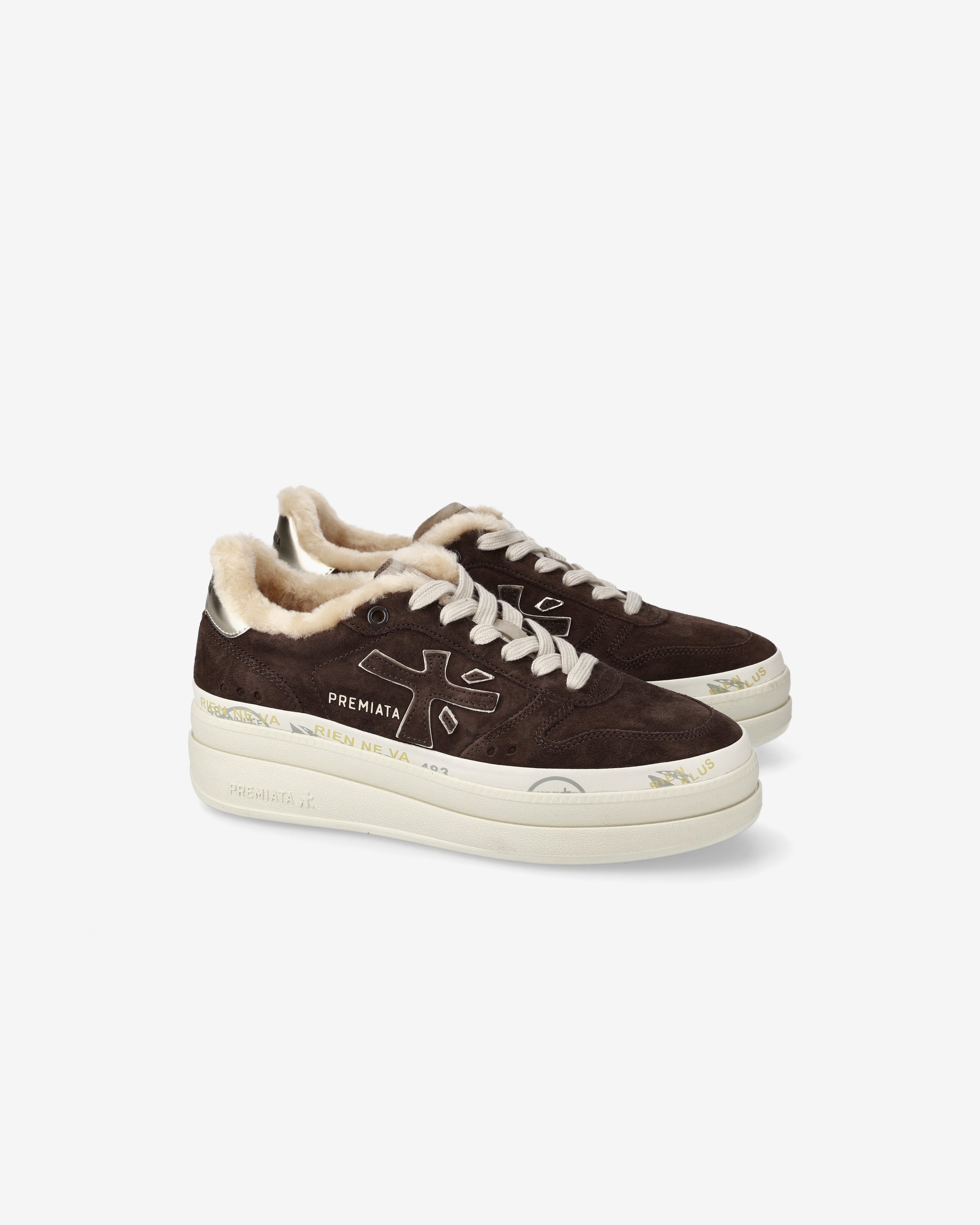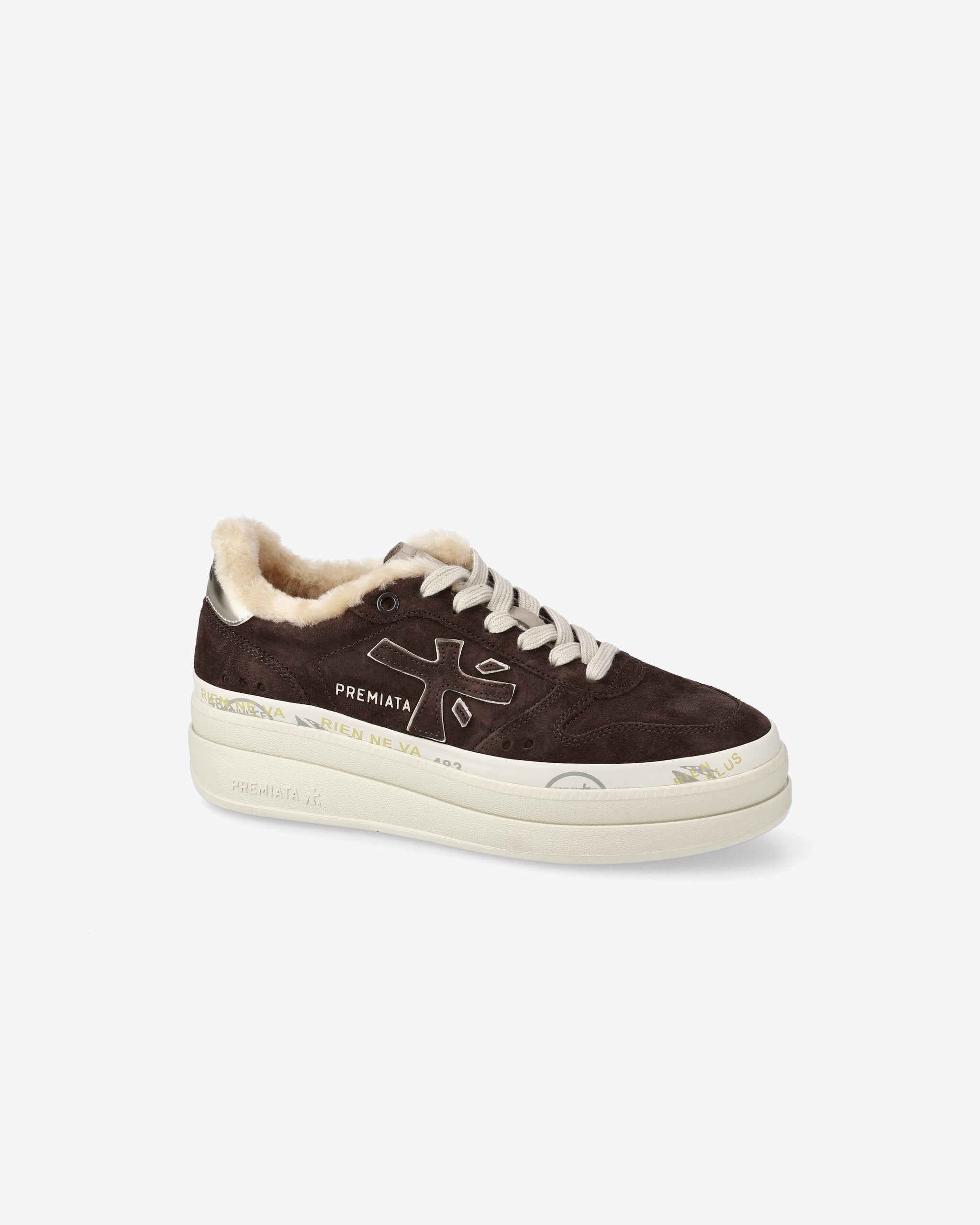 Among Premiata's new must-haves. Style reaches new heights, combining designs such as a double-layered platform sole with a midsole embellished with the brand's iconic stamps and a sheepskin-lined interior.