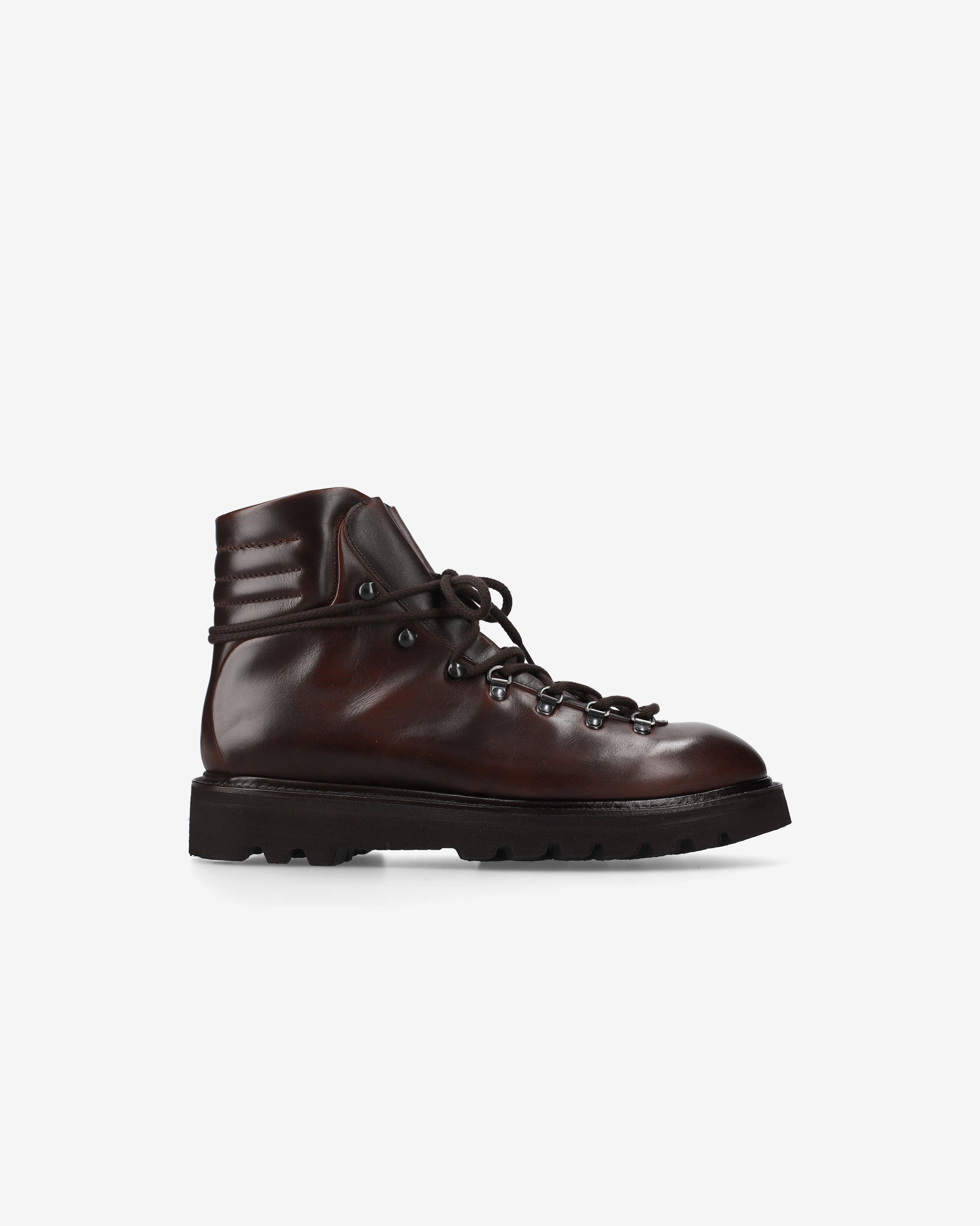 Inspired by classic mountaineering boots, these footwear combine sturdiness and elegance. Made of dark brown calf leather, they feature waxed cotton laces and a leather insole for natural, long-lasting comfort. The Evalux fusbet provides lightness and cushioning, while the Goodyear workmanship and 40mm heel emphasize craftsmanship and solidity. Perfect for tackling even the most dynamic days in style.