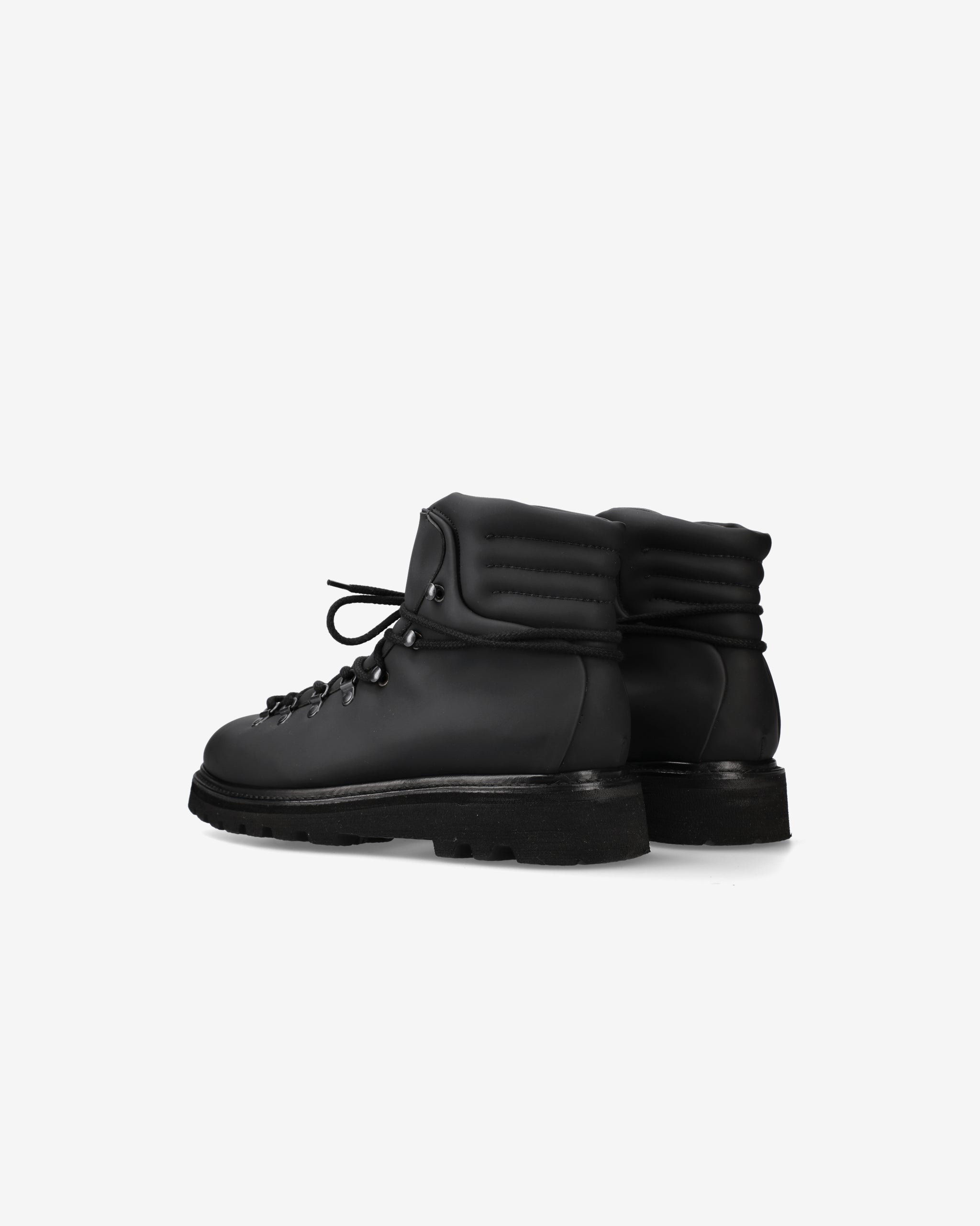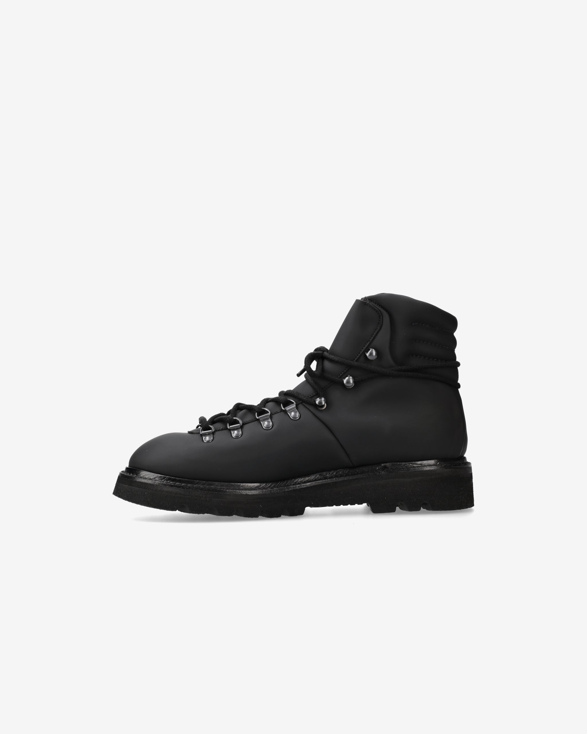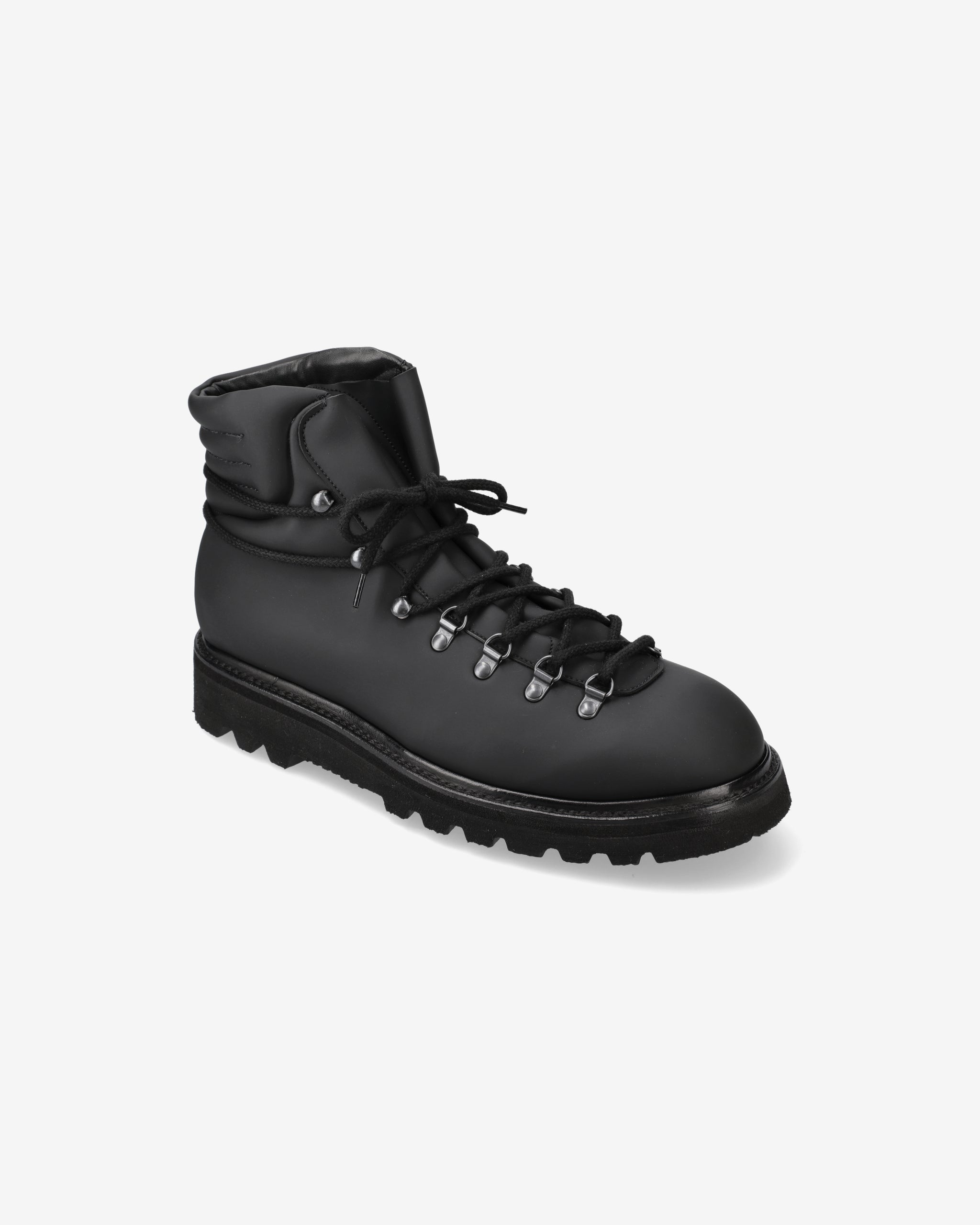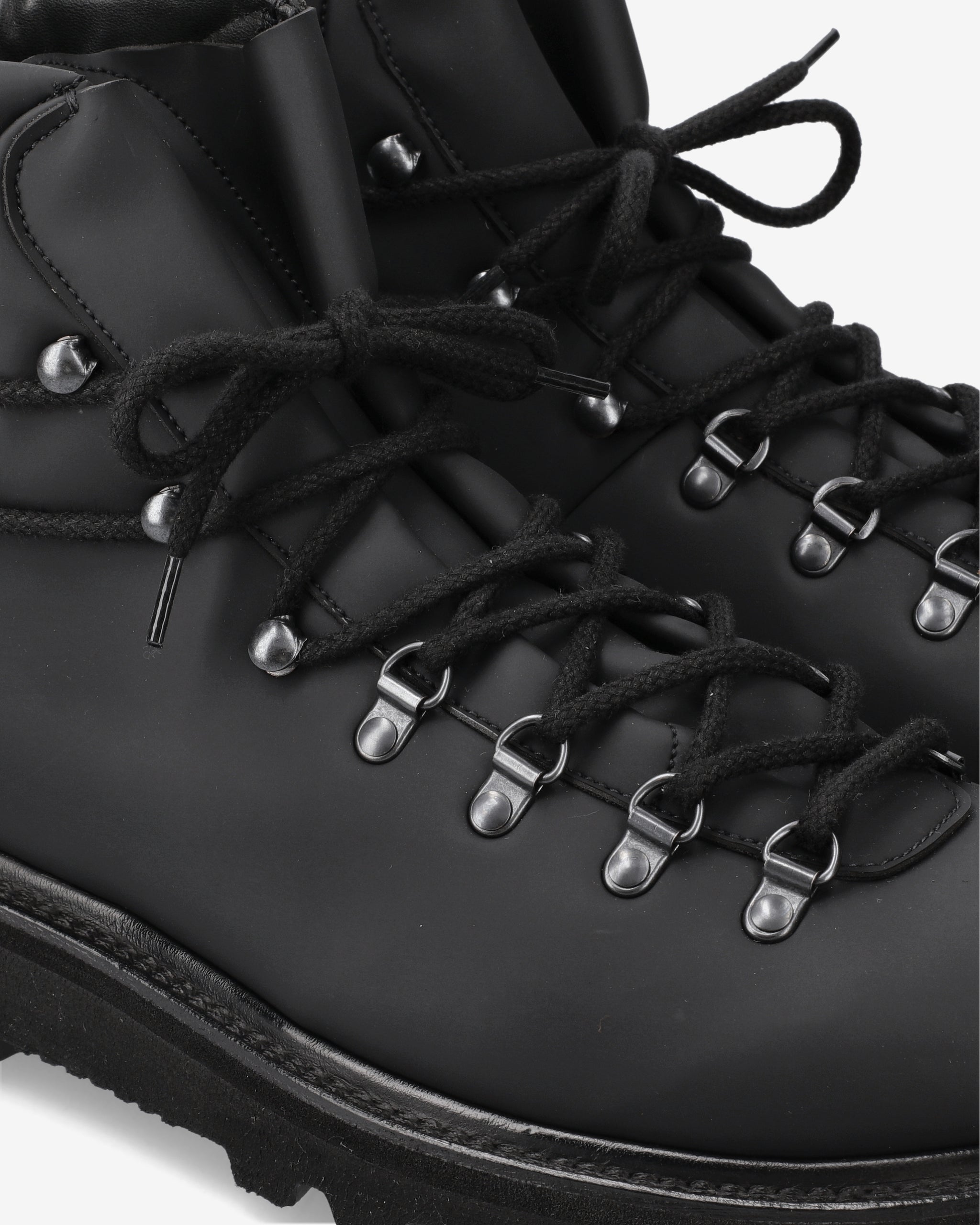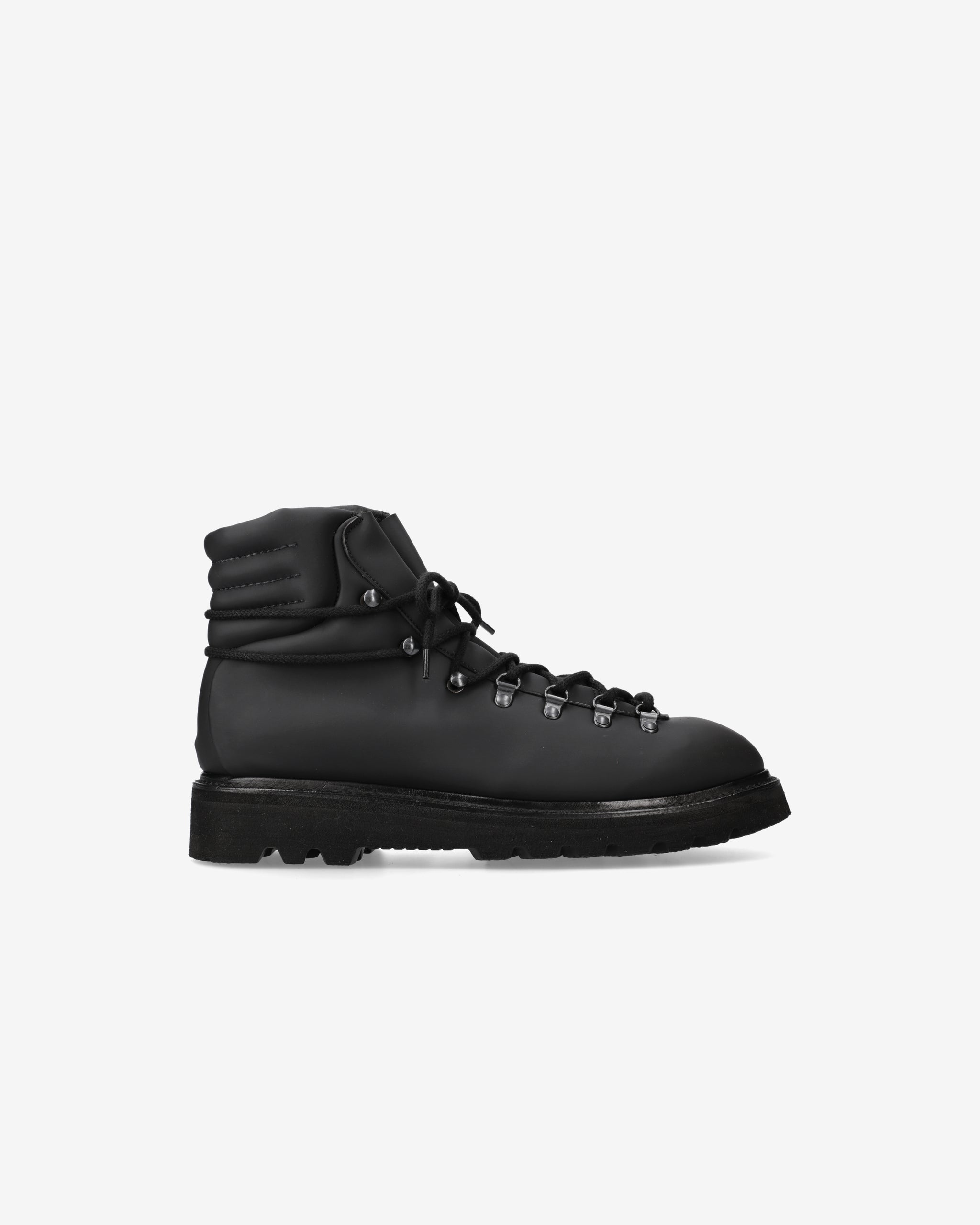 These ankle boots embody Premiata's hybrid soul. Made of custo, an industrial fabric long associated with the brand, they feature a mix of materials, style, and a design reminiscent of a hiking boot with a Vibram bottom.