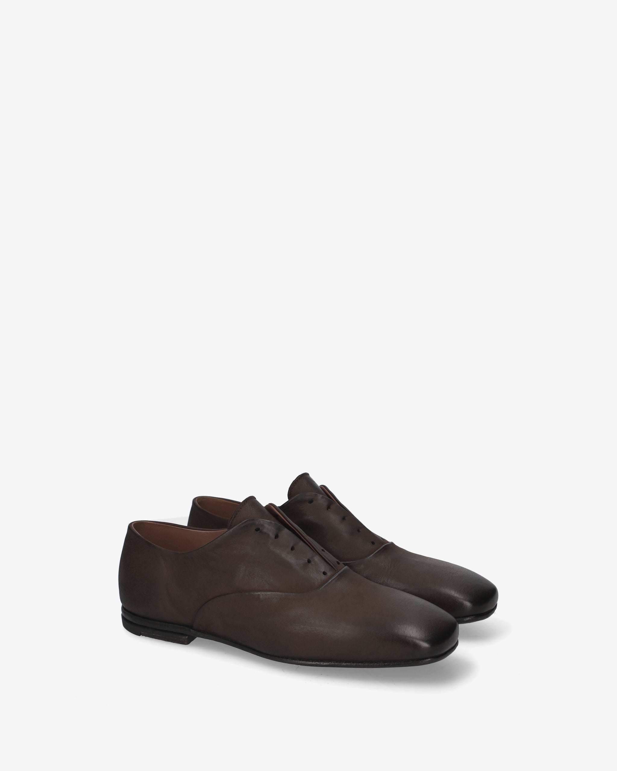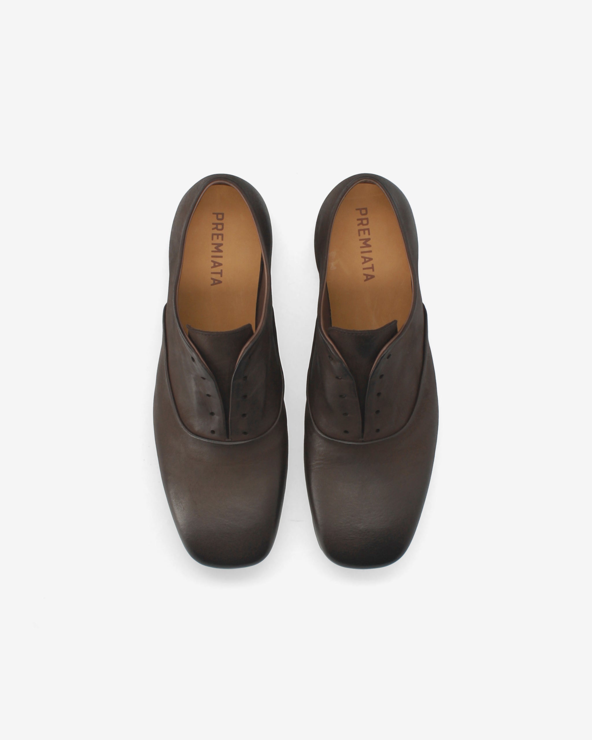 • Simplified Oxford model with 5-hole lacing and minimal stitching to emphasize the continuity of the leather