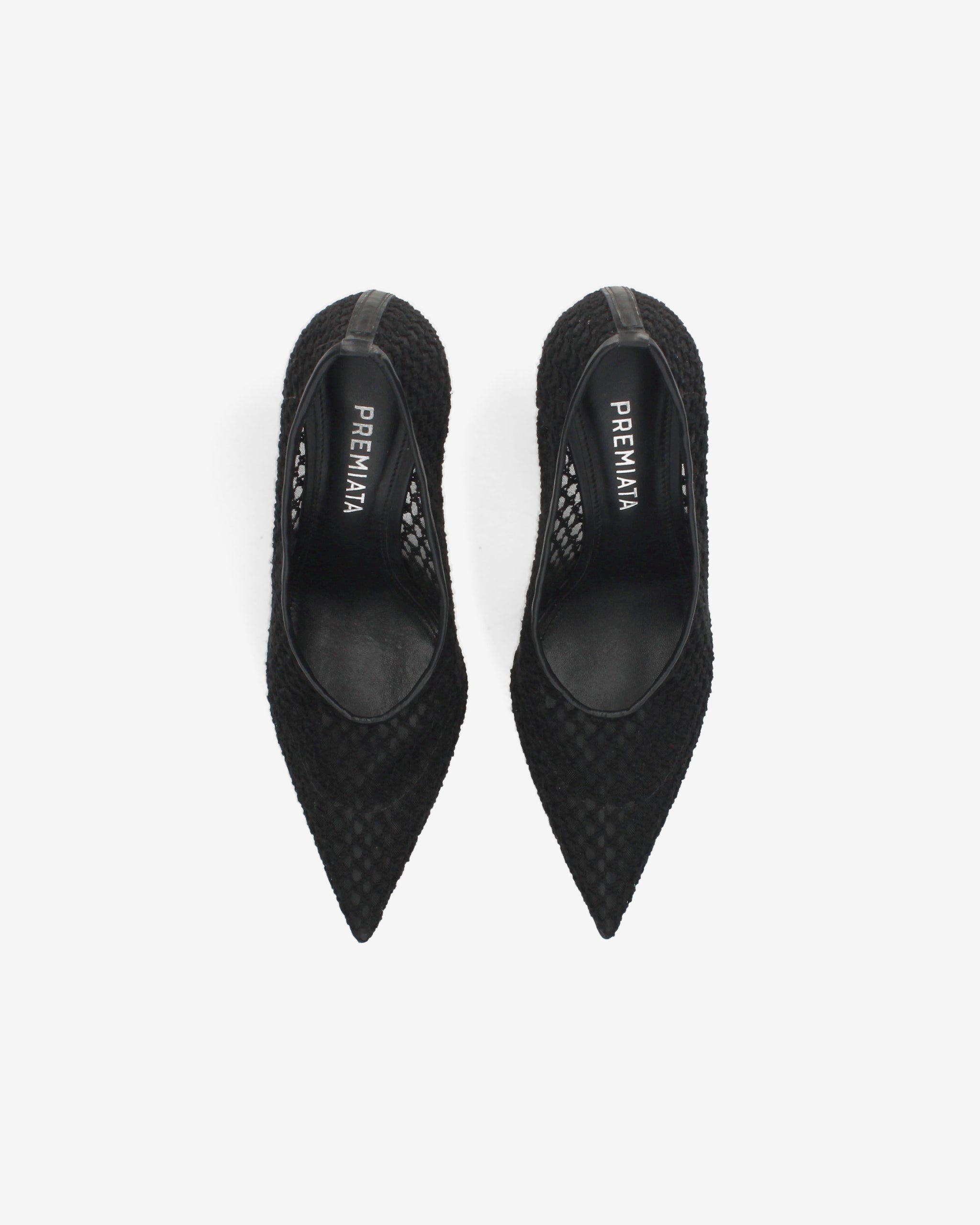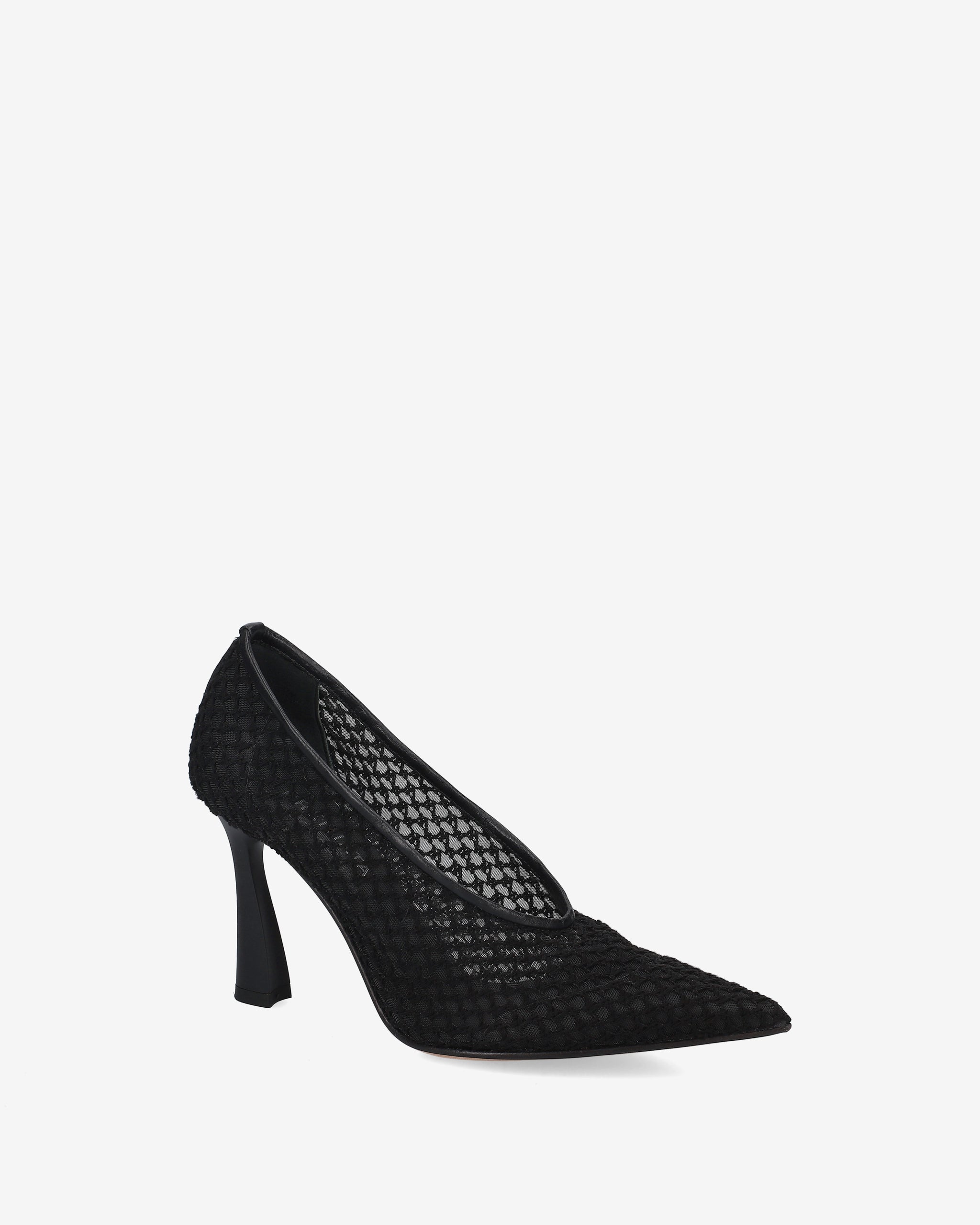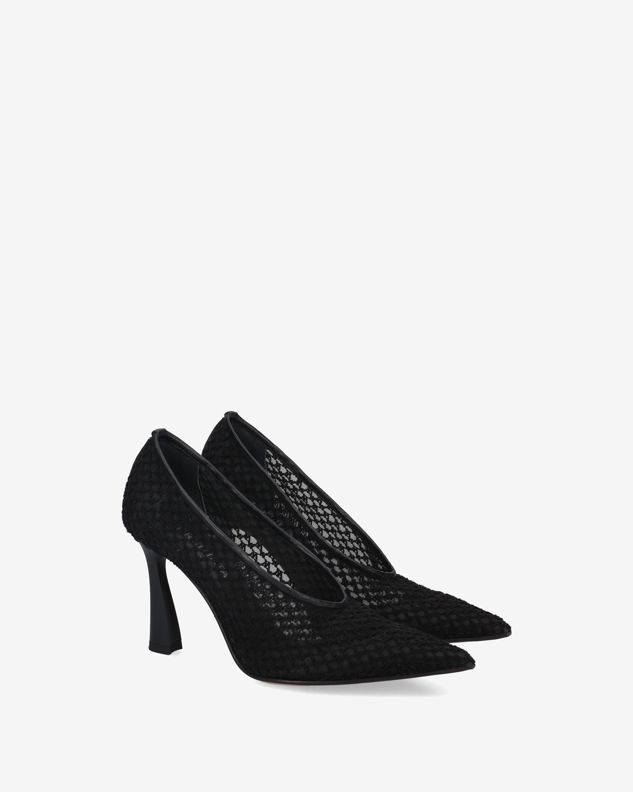 Refined pumps made with embroidered mesh on lightweight netting for a sophisticated and delicate effect. The leather trim adds a touch of elegance, while the 90mm heel in matte ABS completes the design with a slender and modern silhouette.