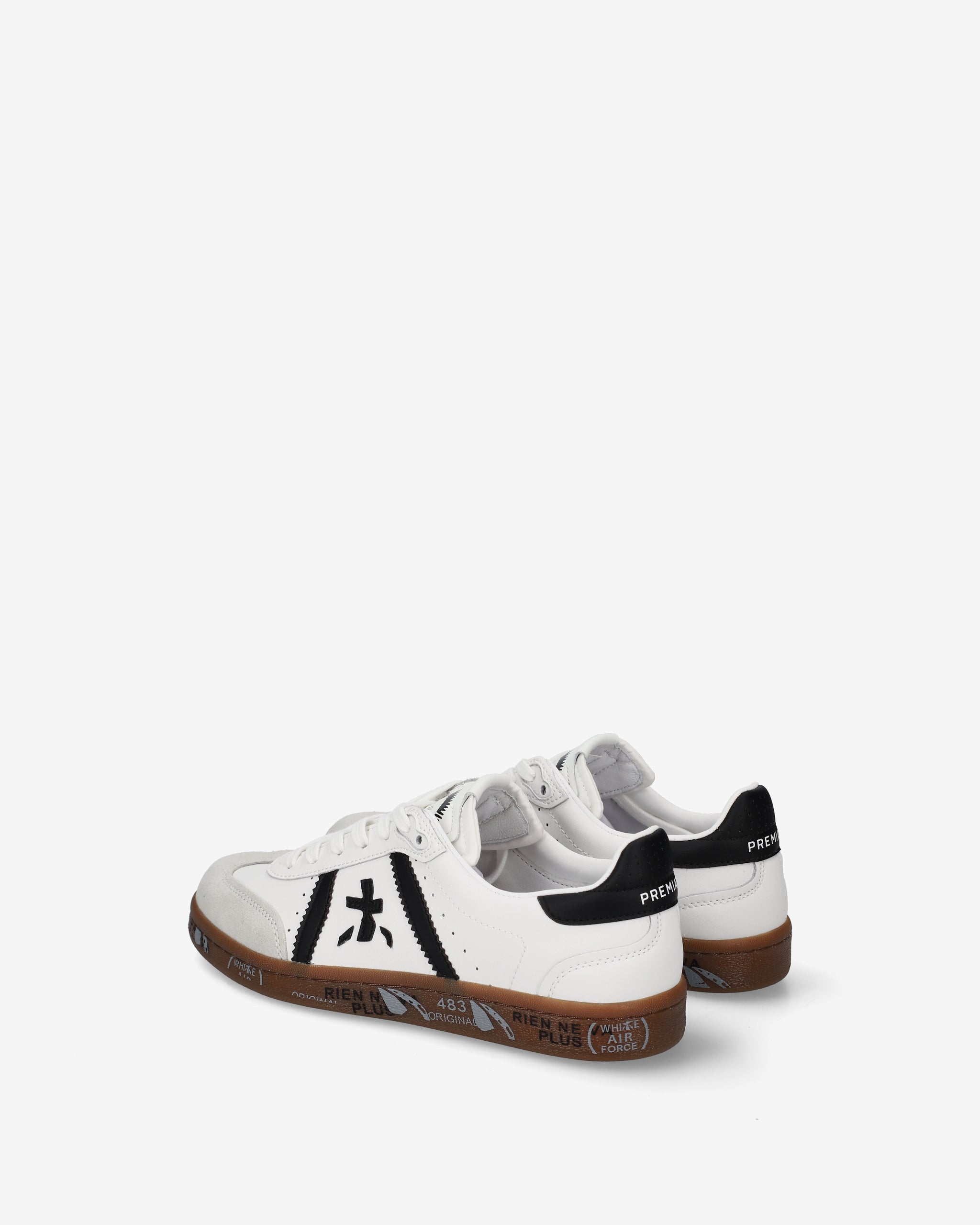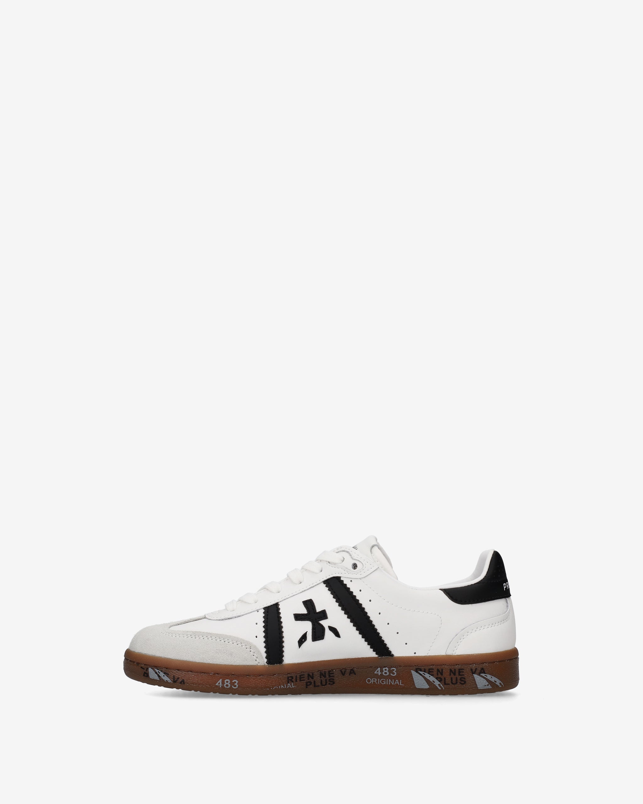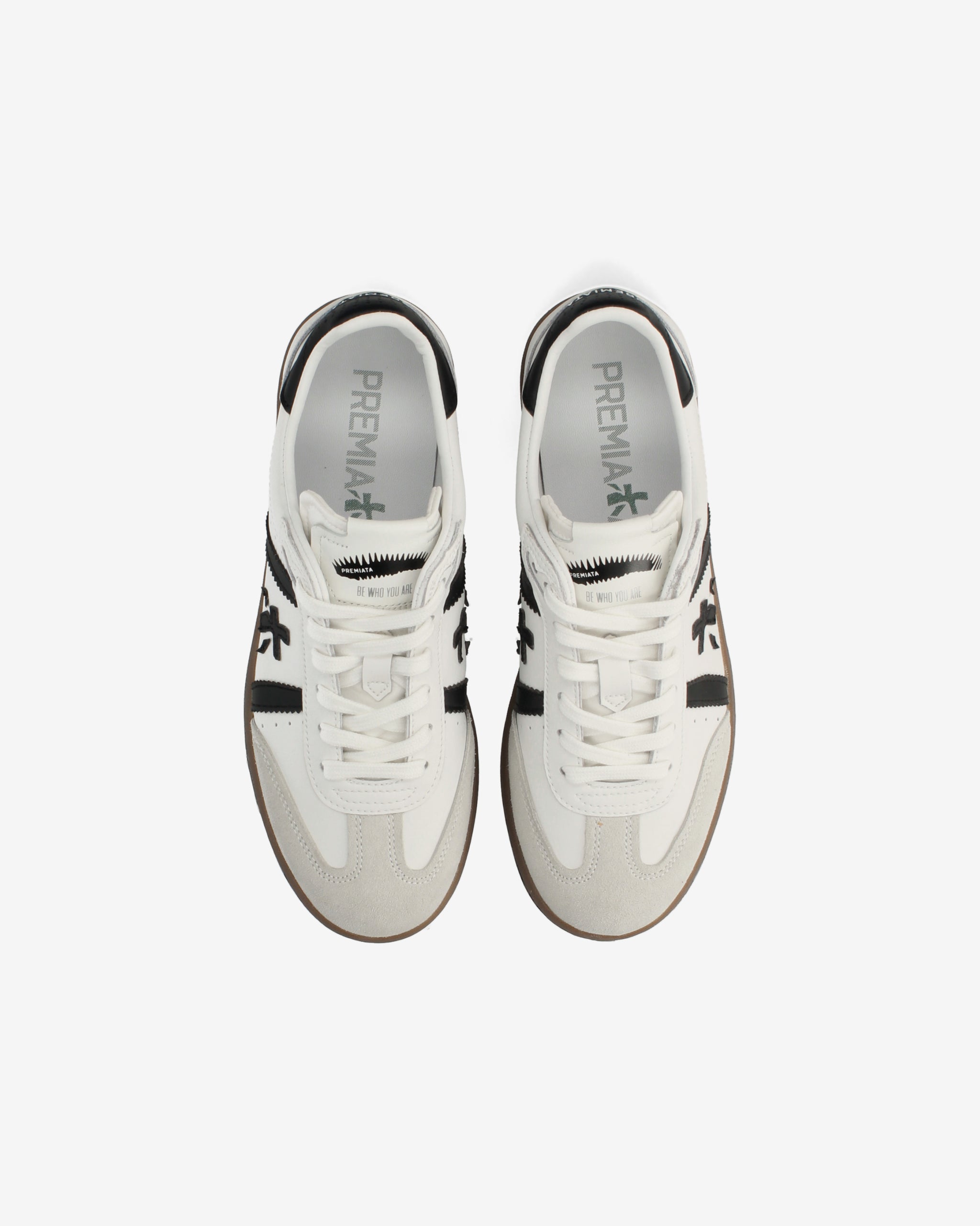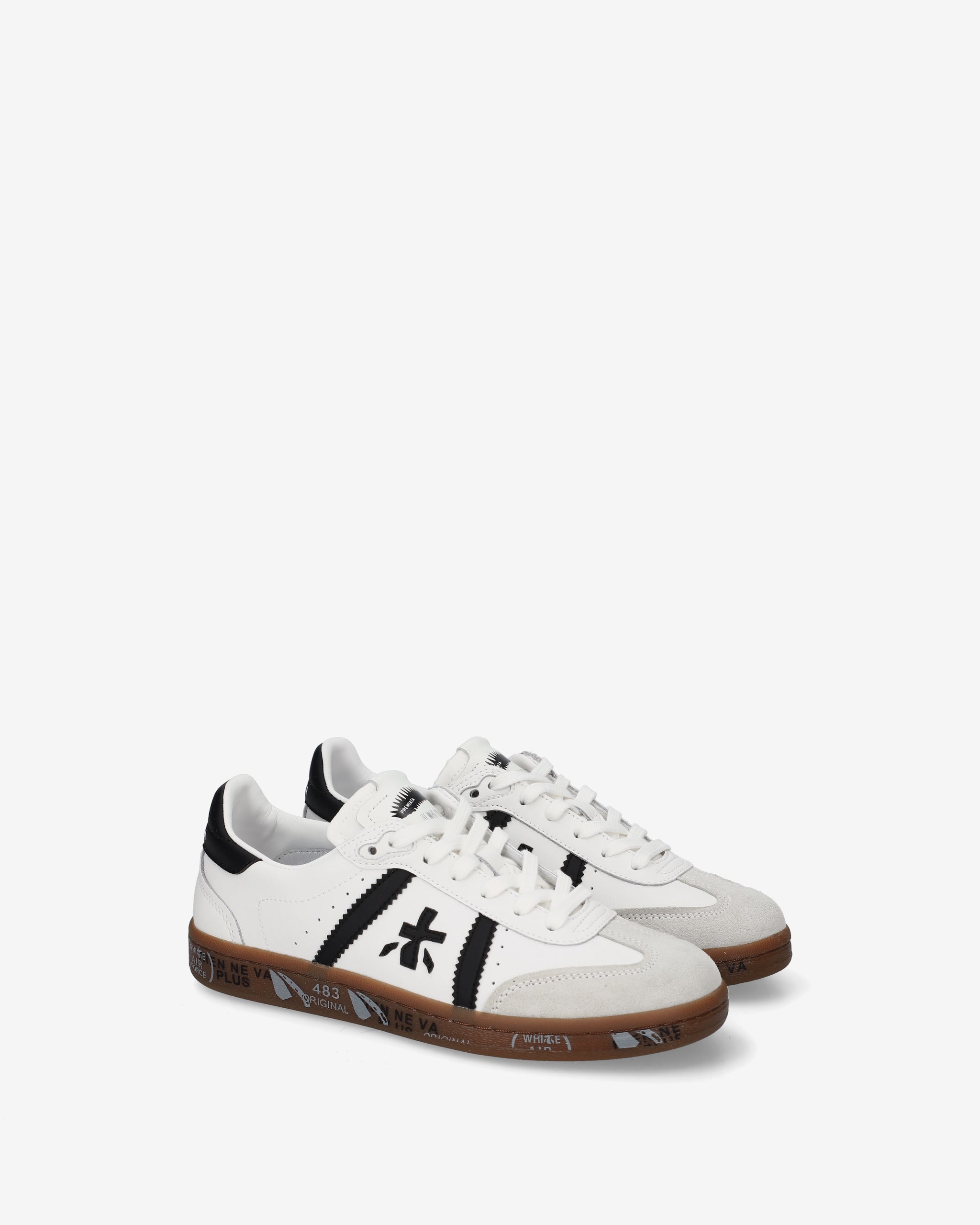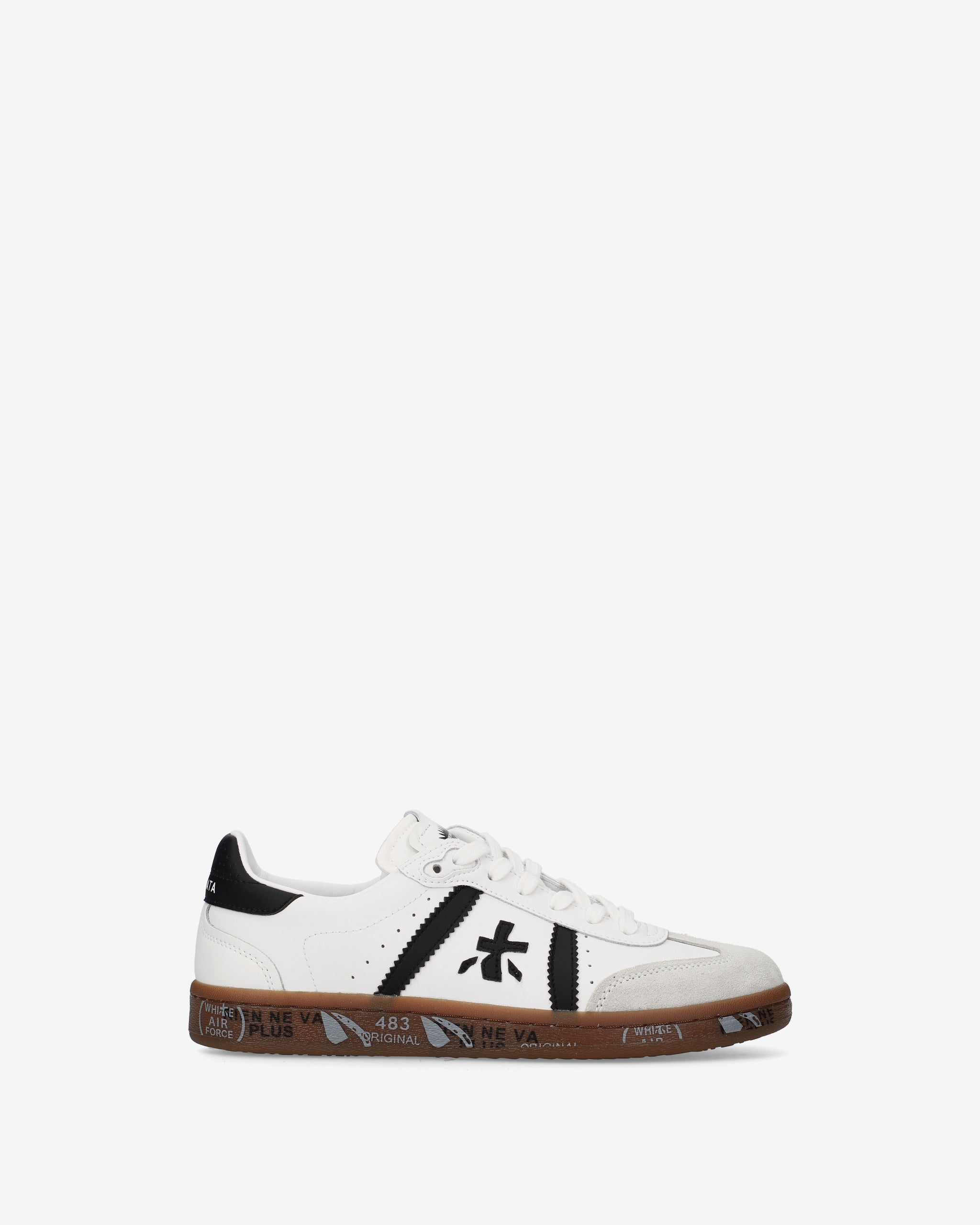 Bonnie with white leather upper, contrasting black details, and gum sole. A mix of classic colors for a clean and sophisticated look.