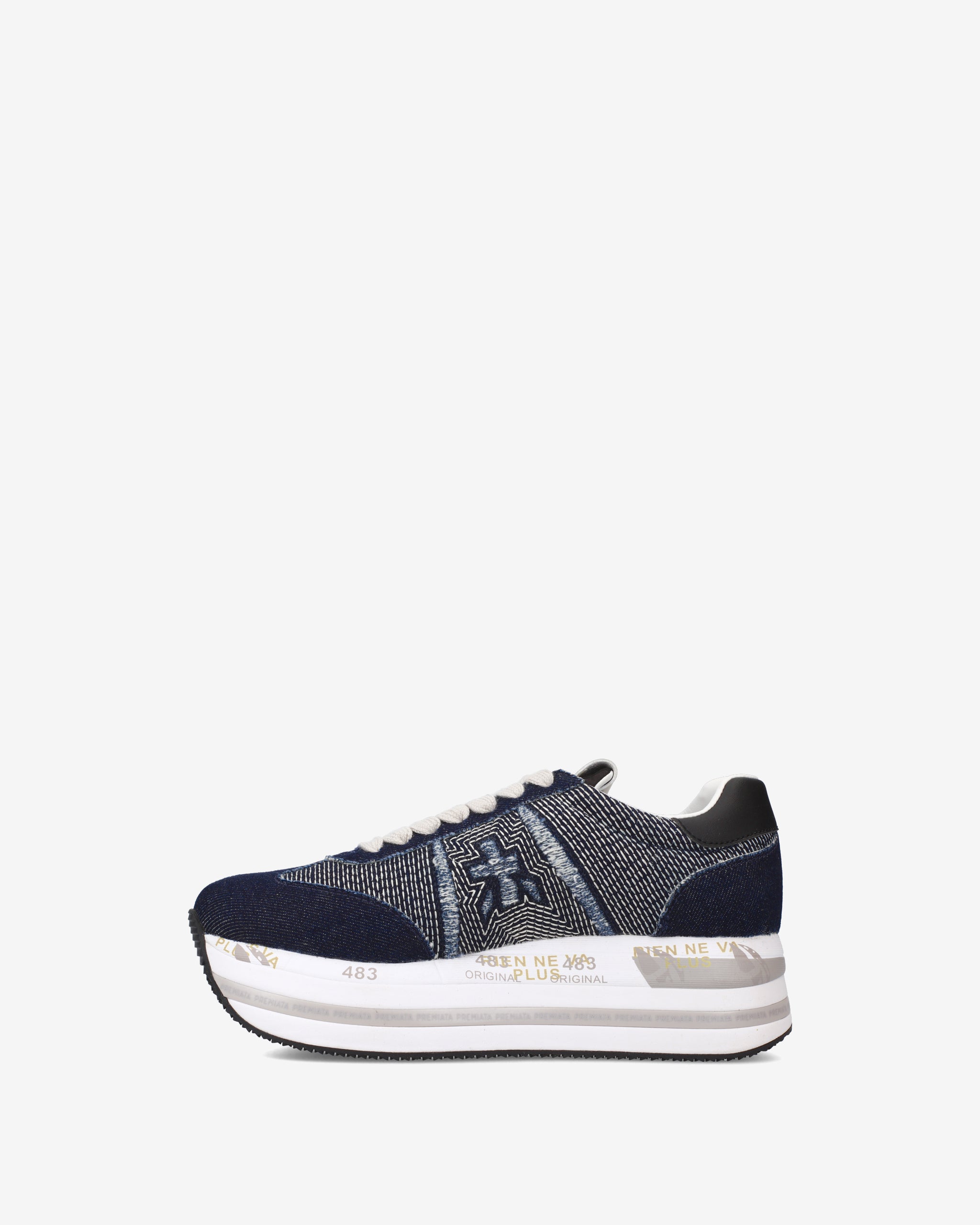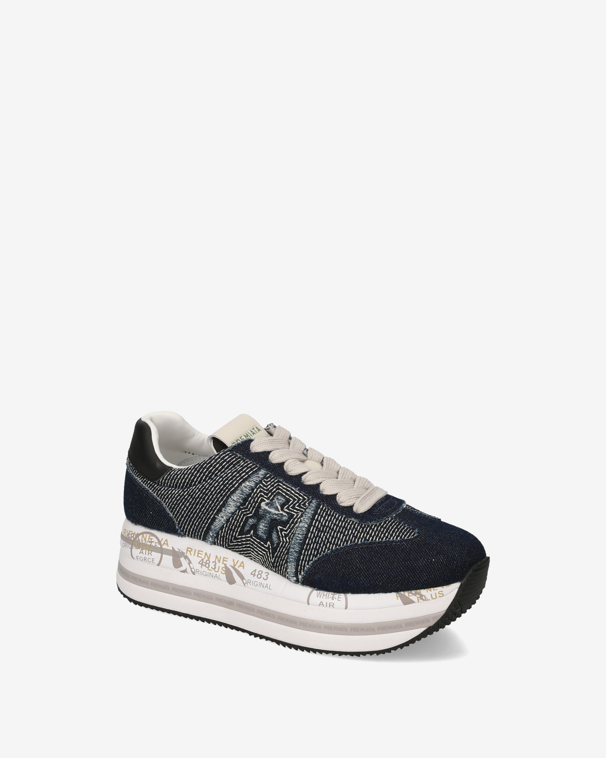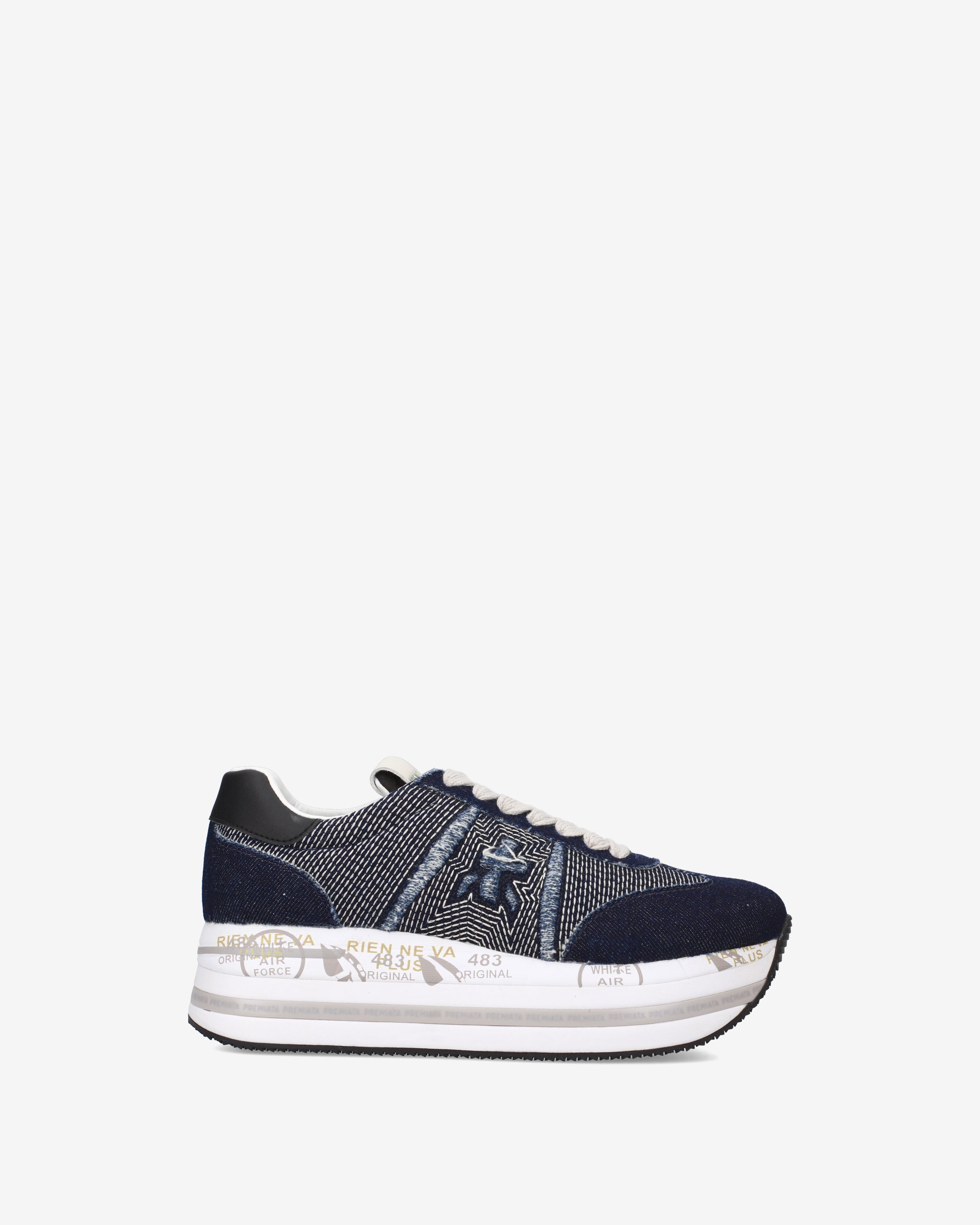 Sneakers Beth con tomaia realizzata in denim. Fondo platform personalizzato dalla serigrafia logata Premiata.