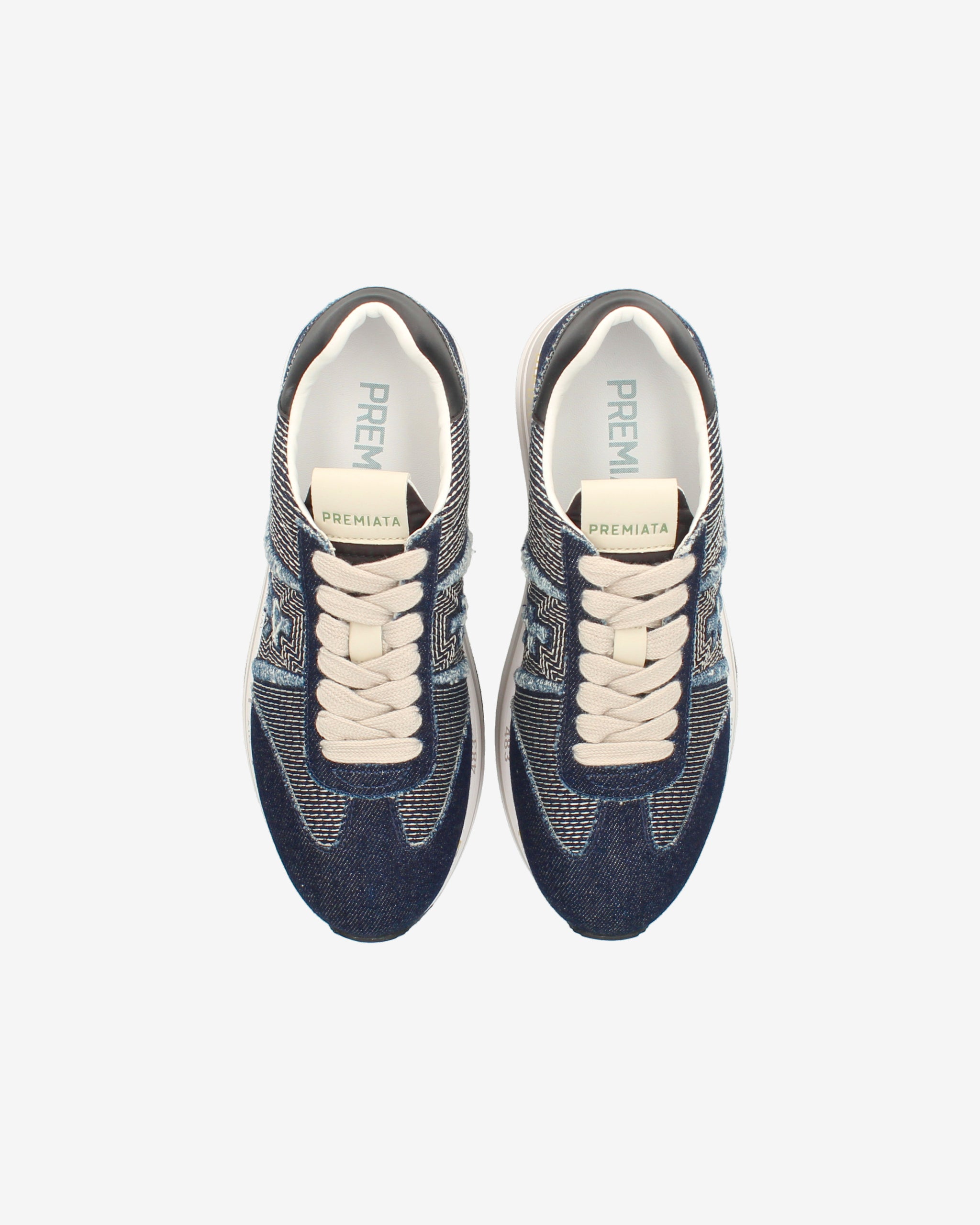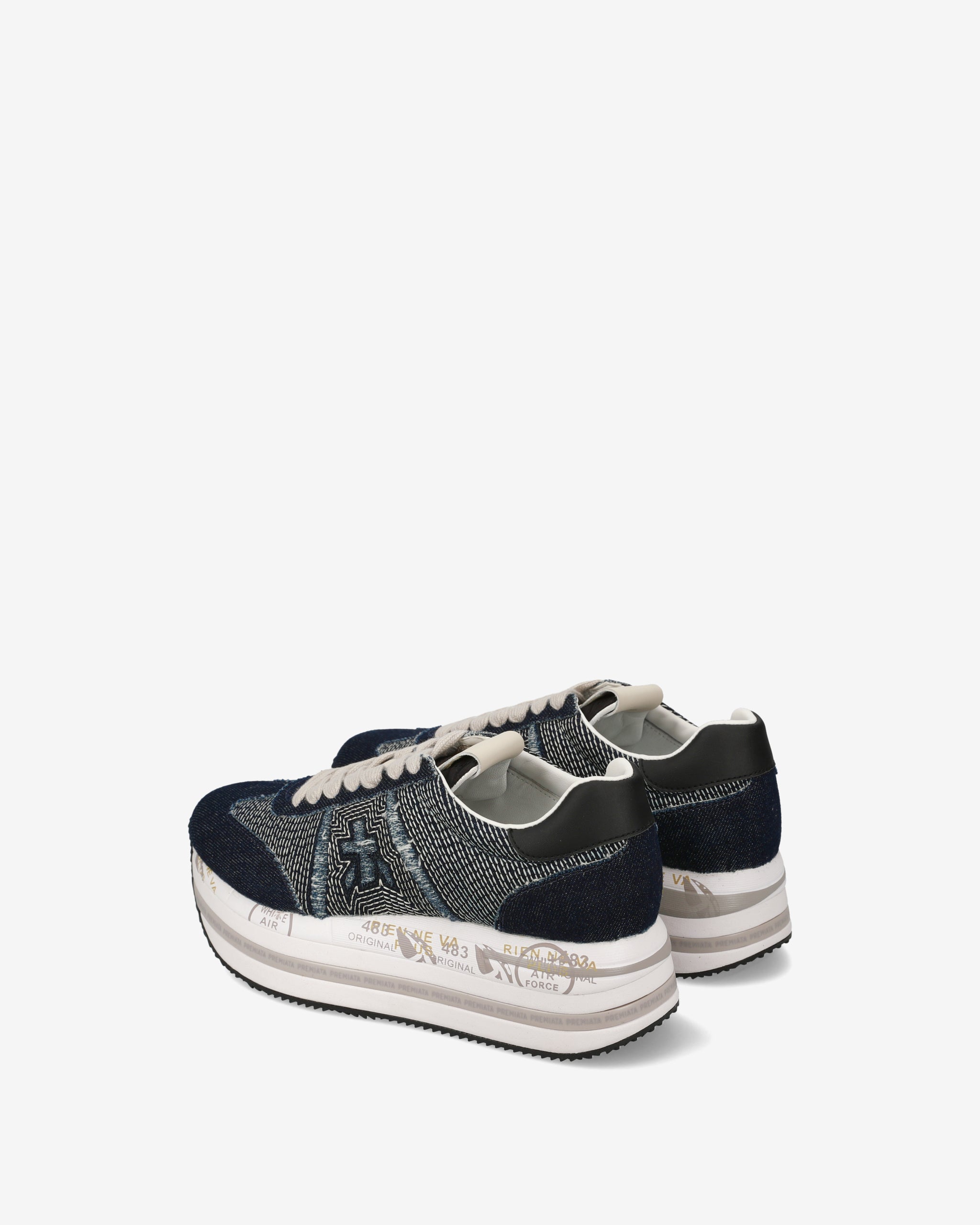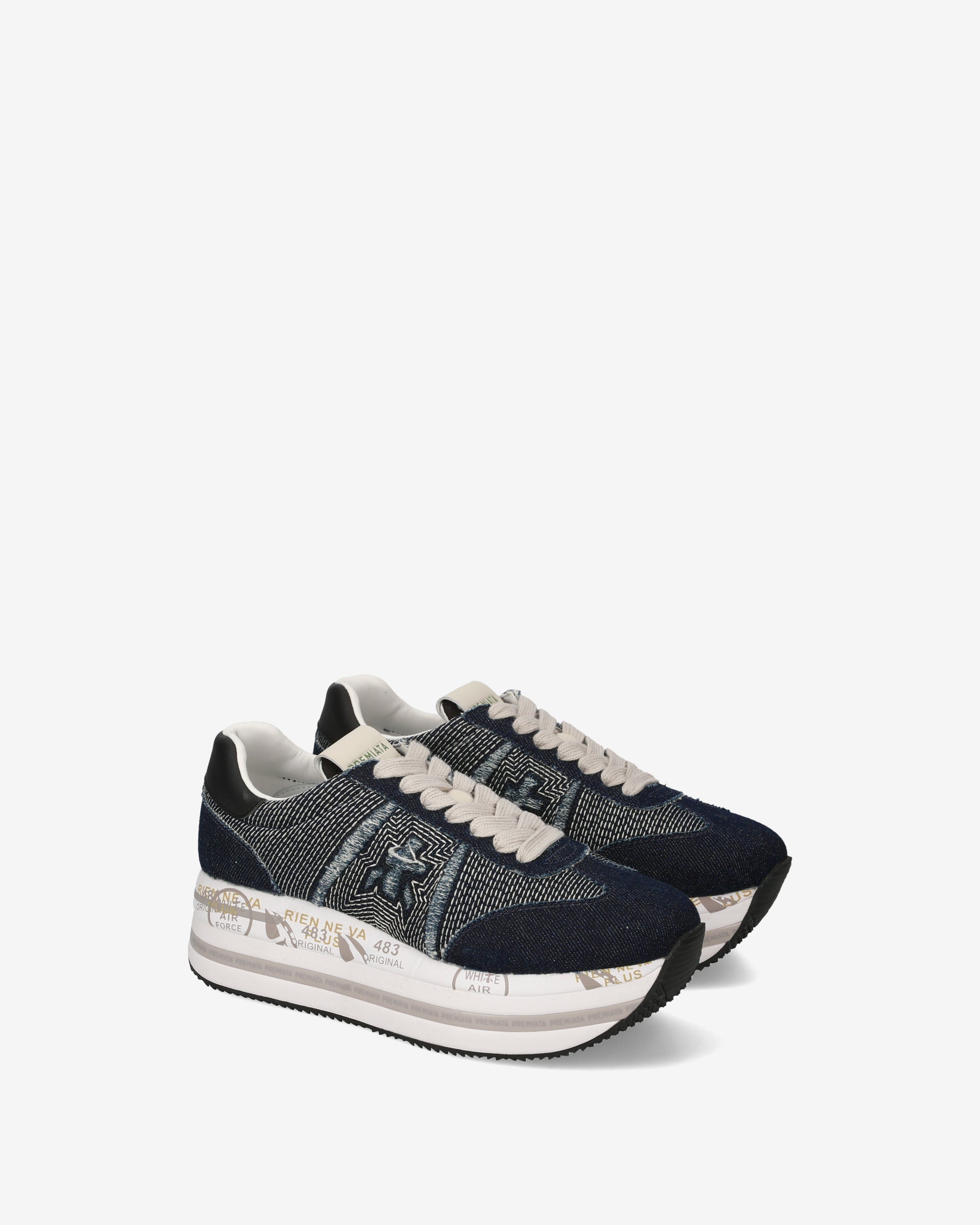Sneakers Beth con tomaia realizzata in denim. Fondo platform personalizzato dalla serigrafia logata Premiata.