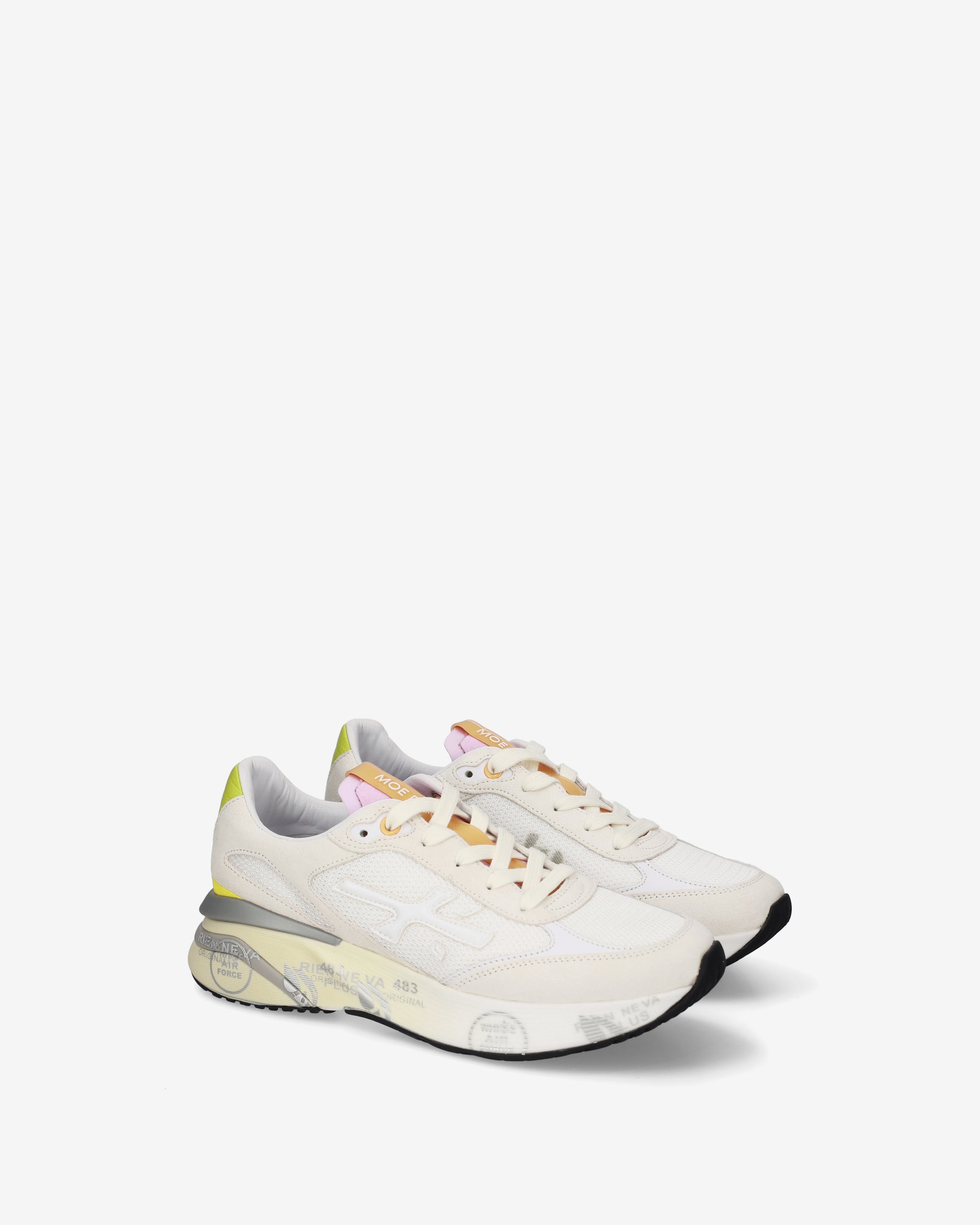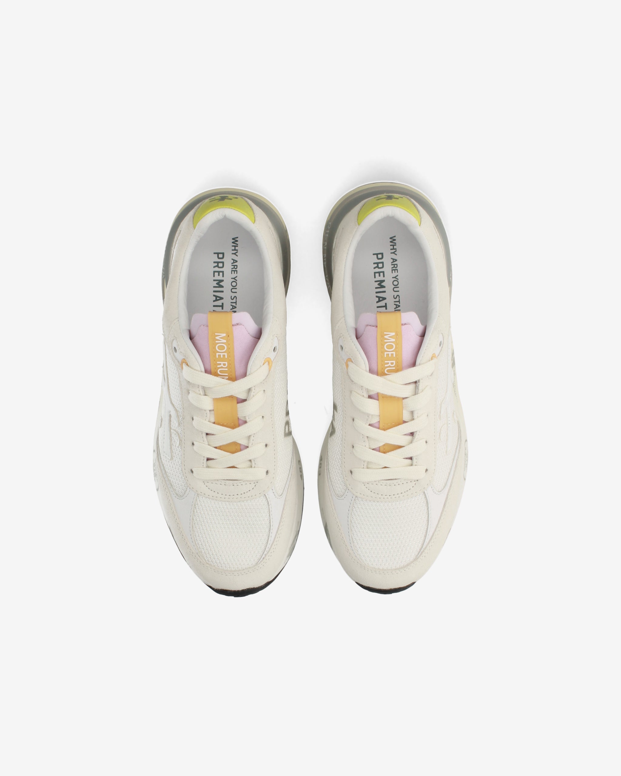 Ideate per stupire. La Moerun si basa sulla leggerezza del movimento, la stabilità e la sensazione ammortizzante data dall'innovazione del fondo. La nuova silhouette è ricca di dettagli: logo sul laterale esterno, scritta PREMIATA sul laterale interno e nome del modello sull'etichetta.