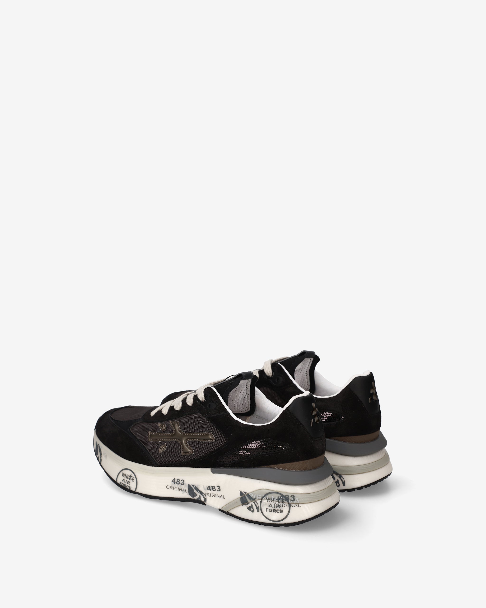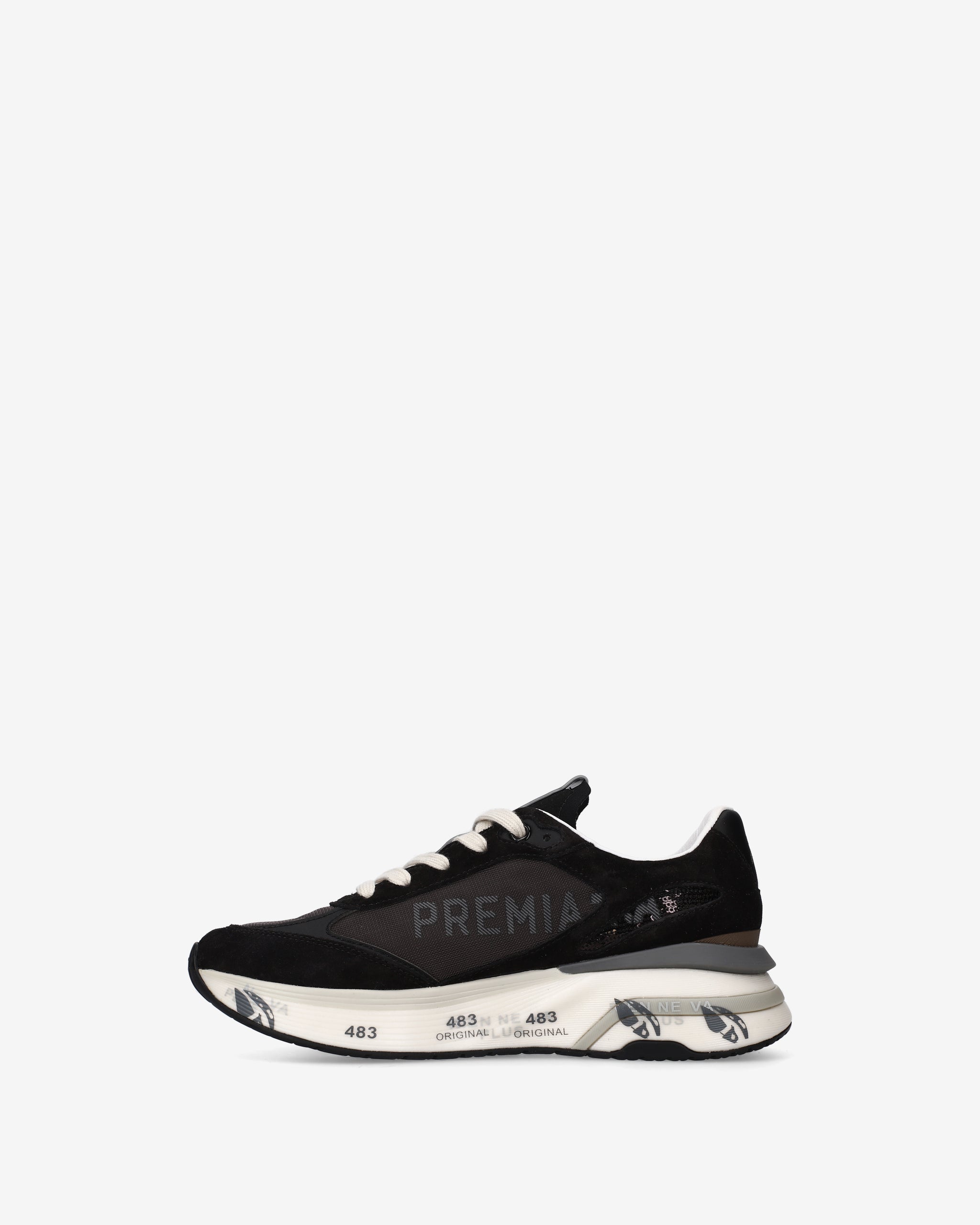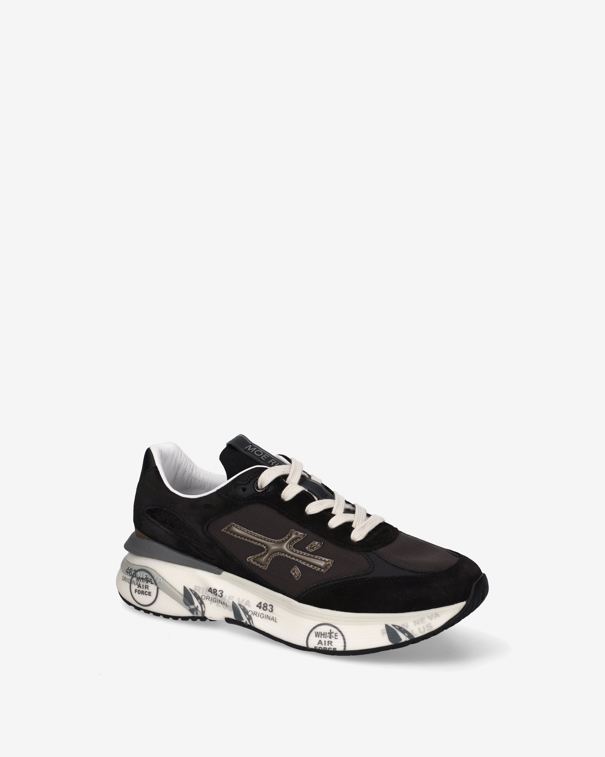Ideate per stupire. La Moerun si basa sulla leggerezza del movimento, la stabilità e la sensazione ammortizzante data dall'innovazione del fondo. La nuova silhouette è ricca di dettagli: logo sul laterale esterno, scritta PREMIATA sul laterale interno e nome del modello sull'etichetta.