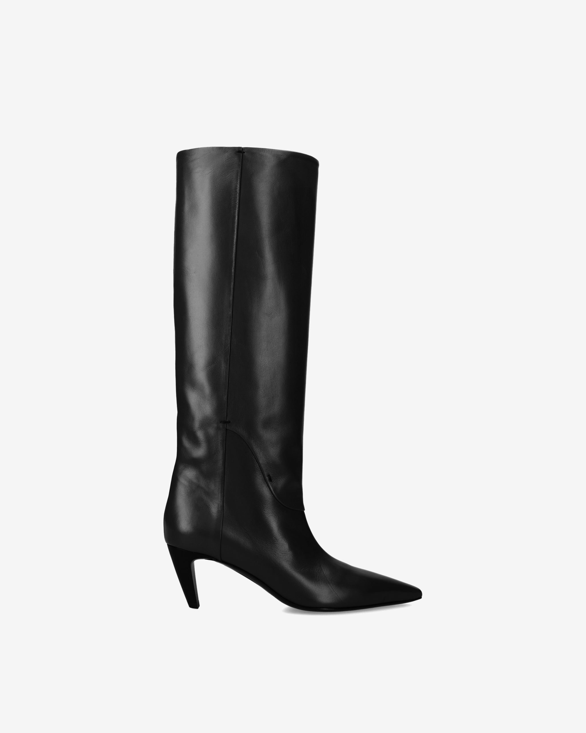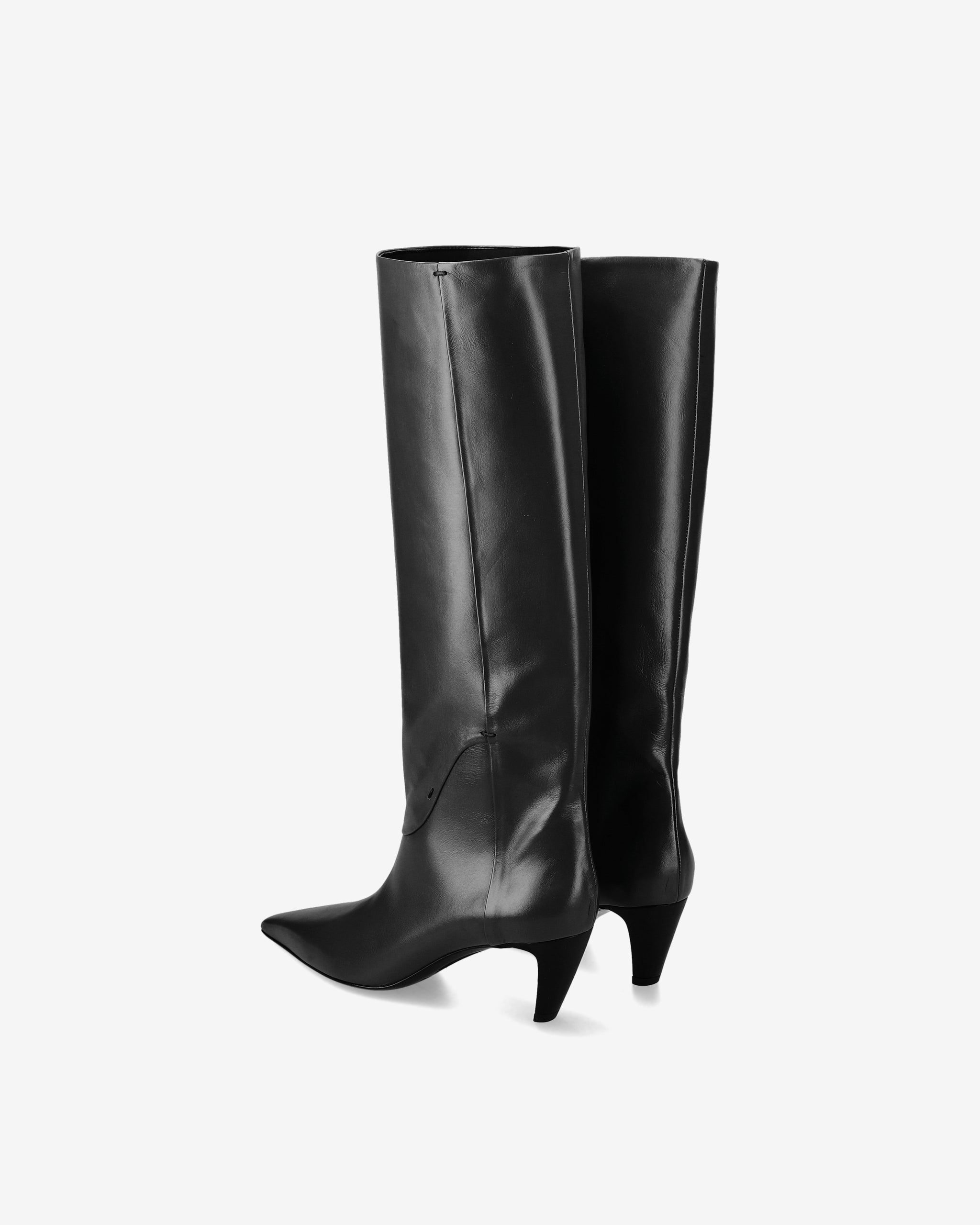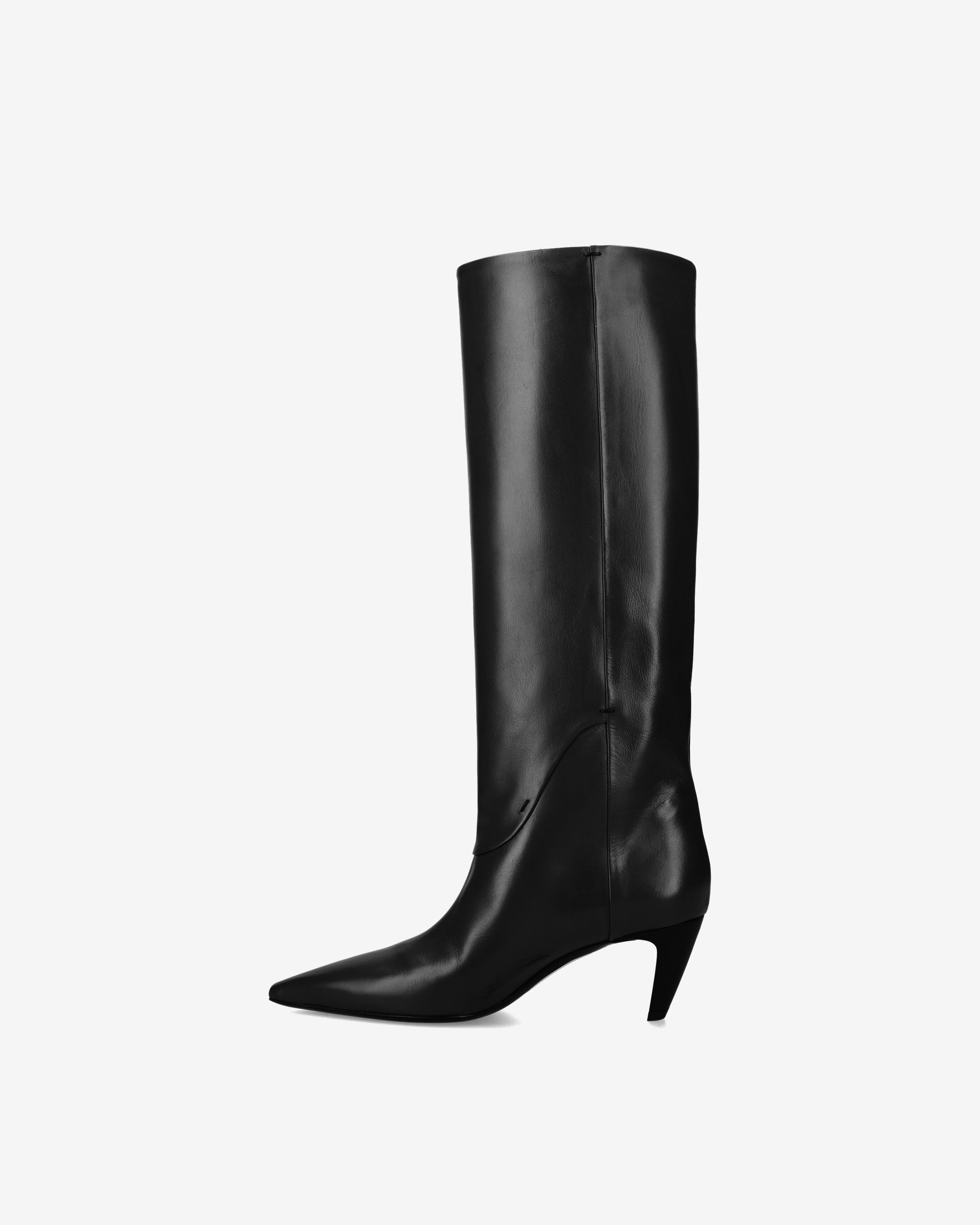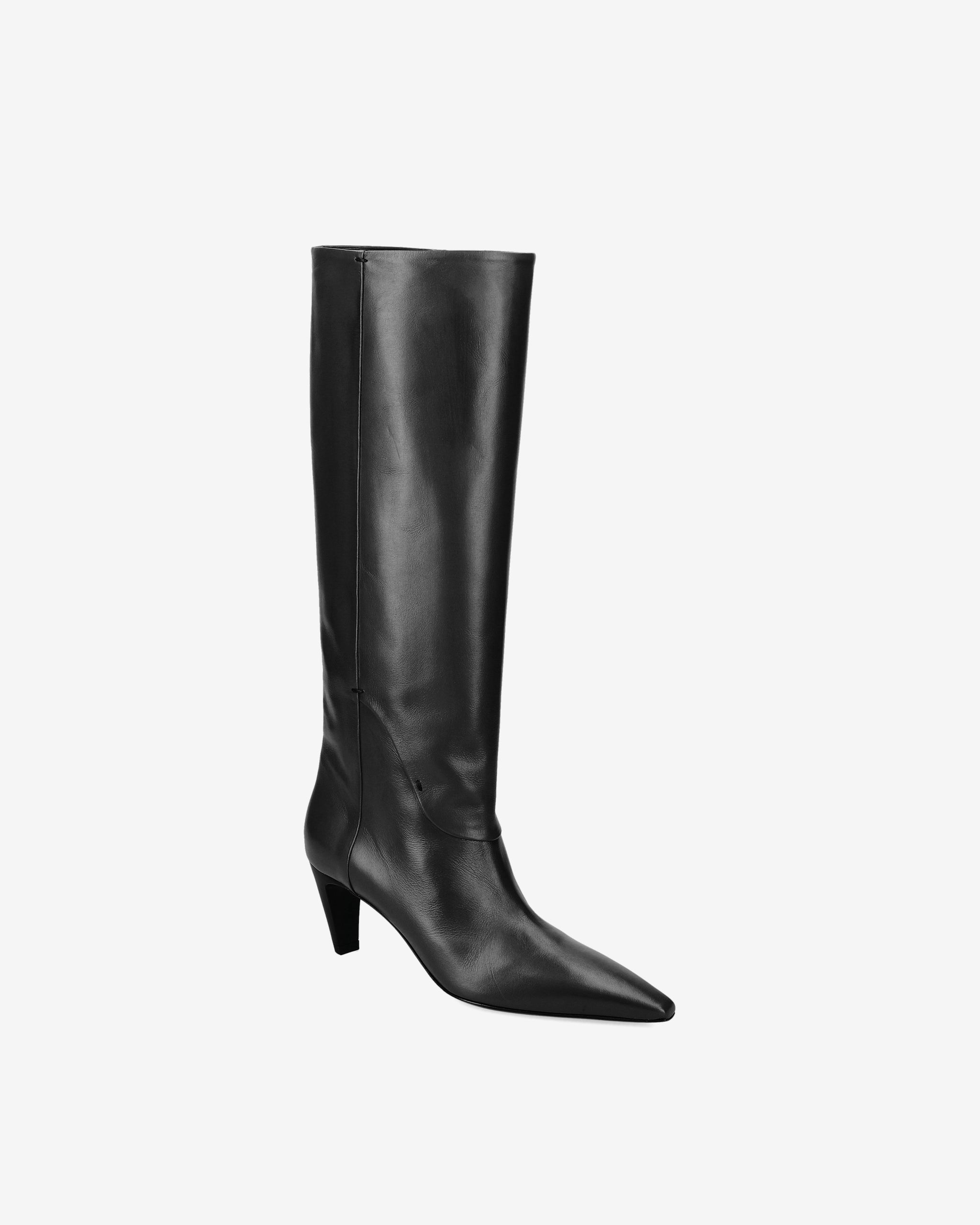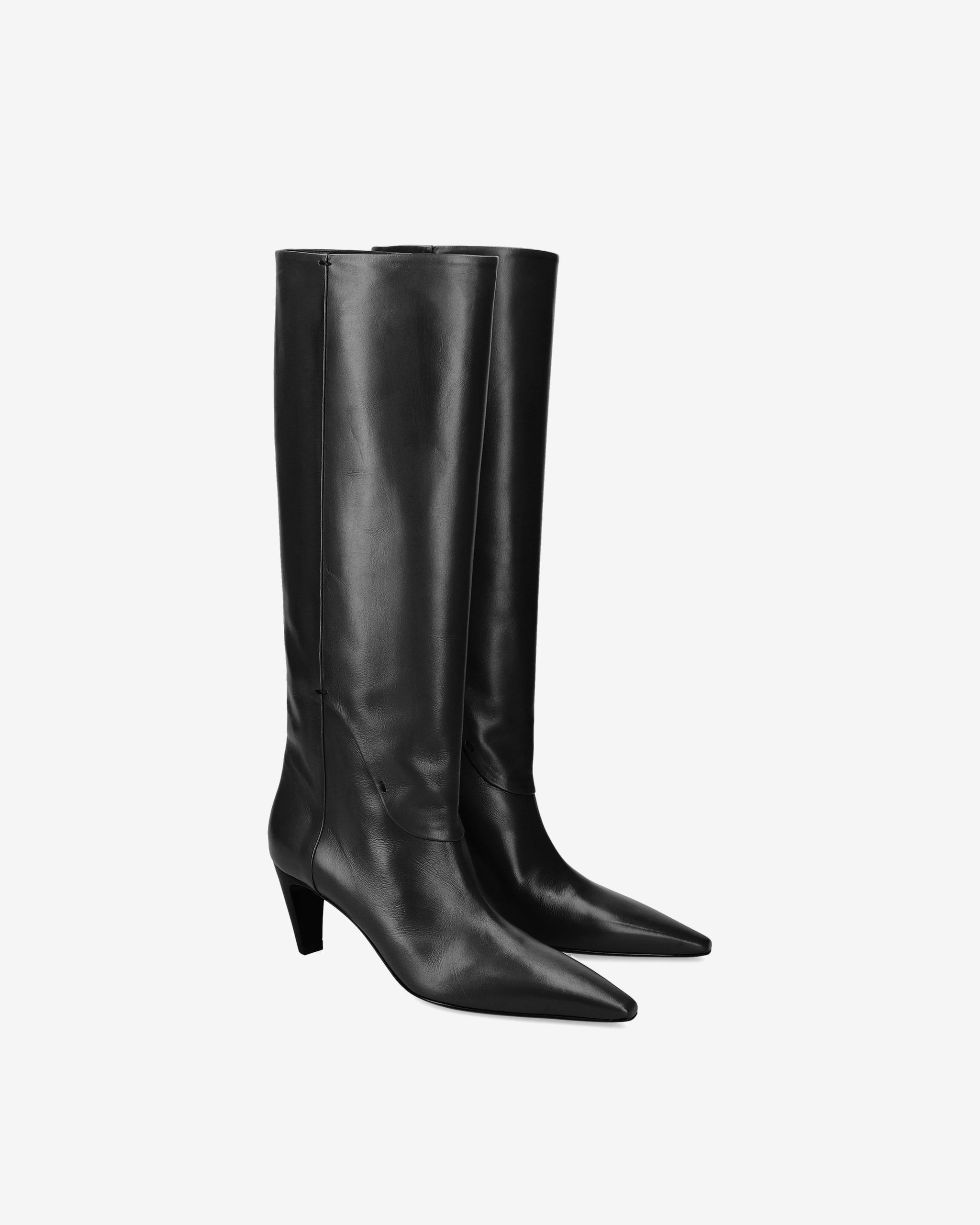 Eleganti e femminili. Gli stivali in nappa sono caratterizzati dalla punta pronunciata e dal tacco a banana. La suola in cuoio è arricchita dal logo lettering inciso.