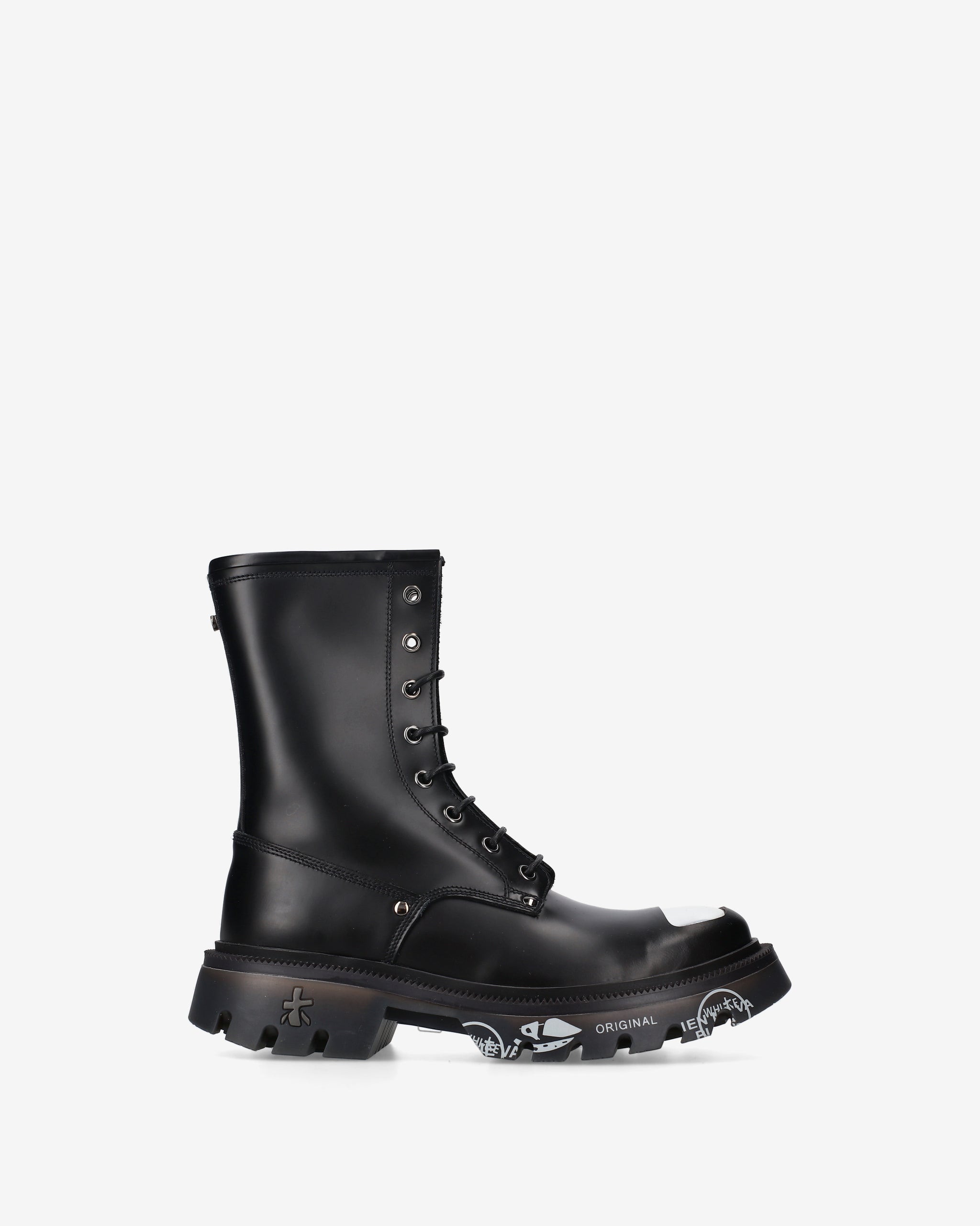 Anfibio in vitello spazzolato nero con puntale e accessori cromati nickel. Un mix di eleganza lucida e dettagli metallici per un look deciso, ispirato all’estetica underground londinese.