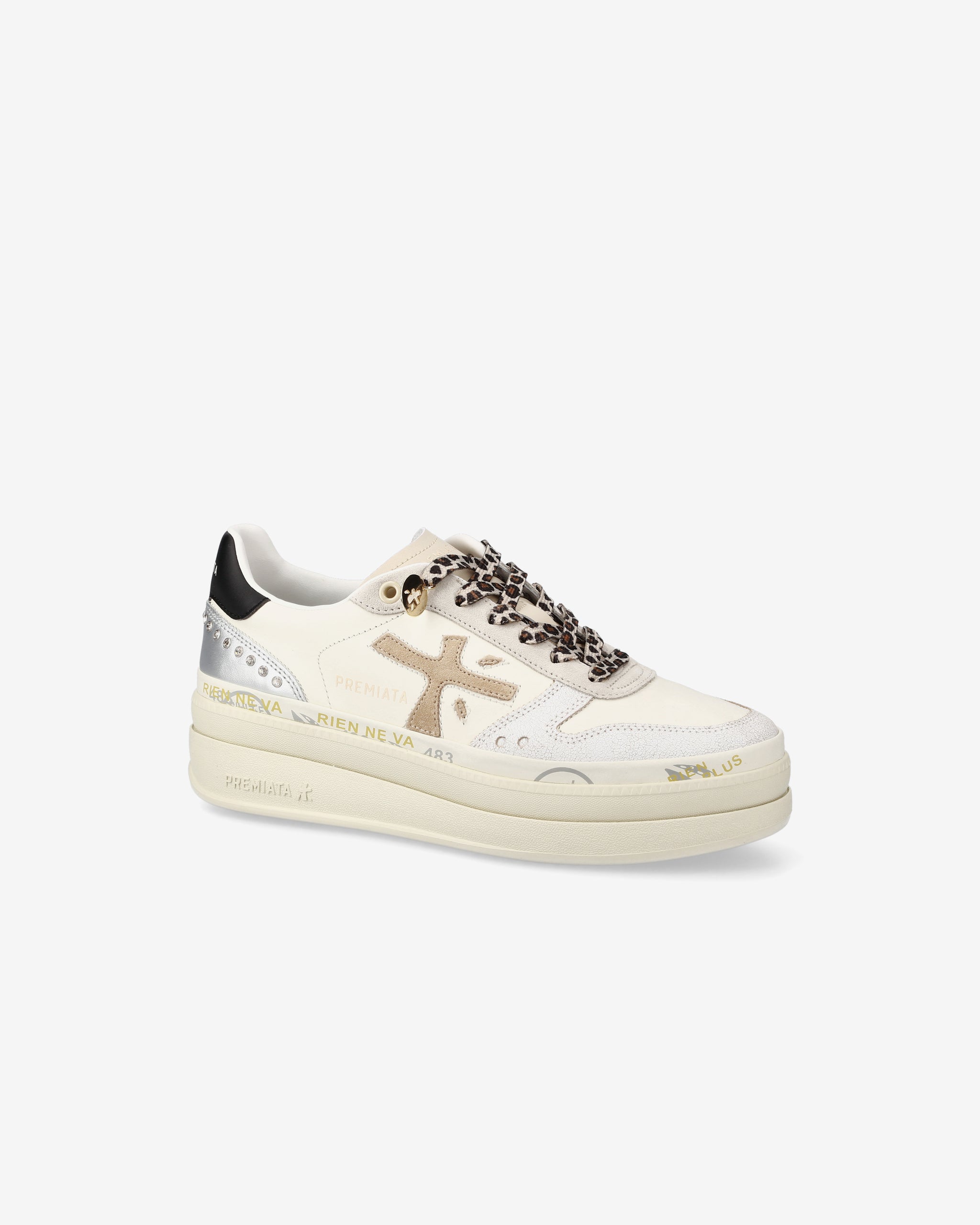 Tra i nuovi must have di Premiata. Lo stile raggiunge nuove vette, unendo design come la suola platform doppio strato con un’intersuola impreziosita dagli iconici timbri del brand.