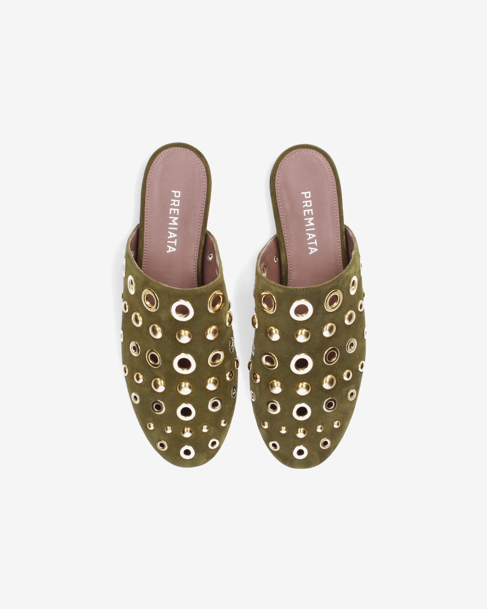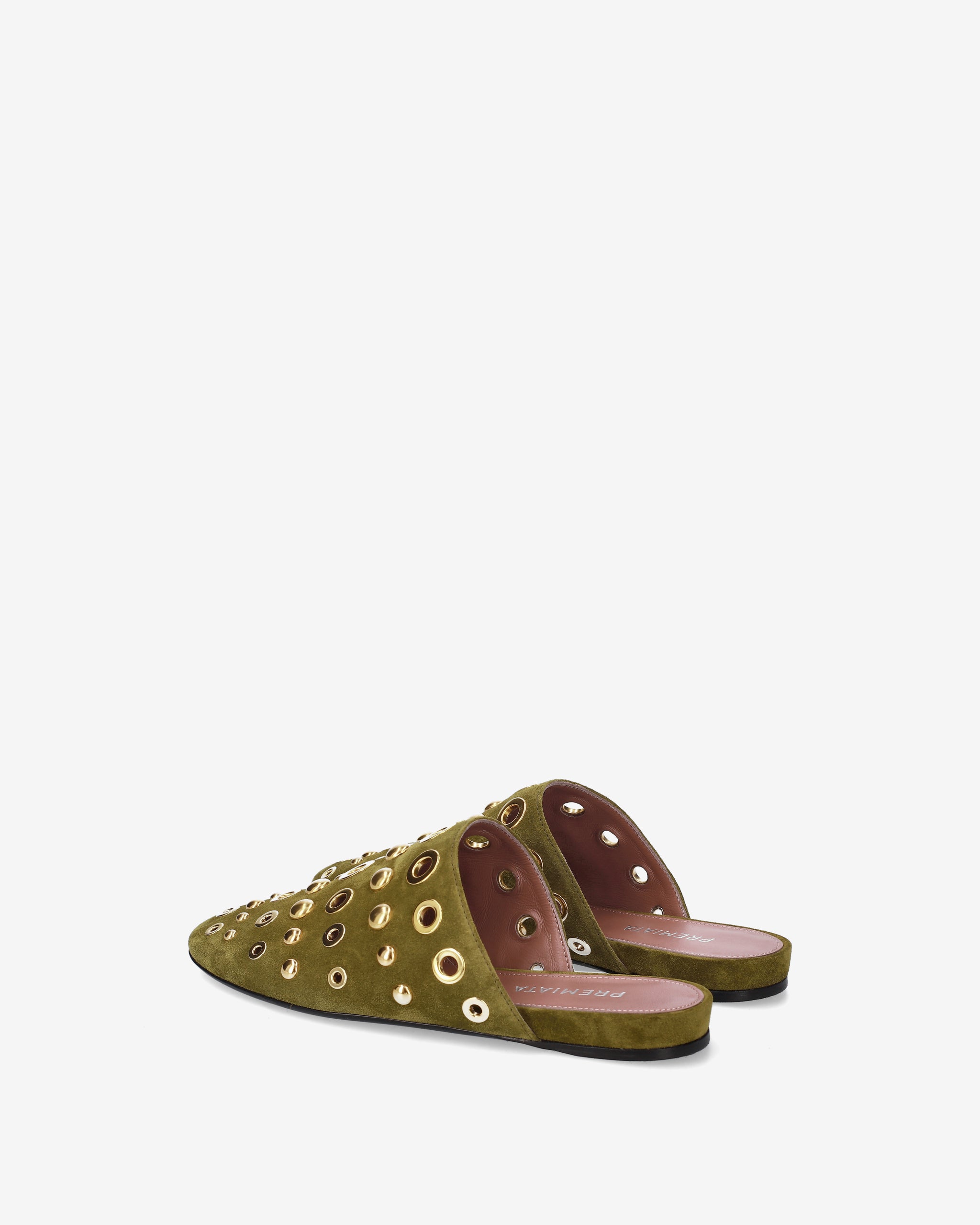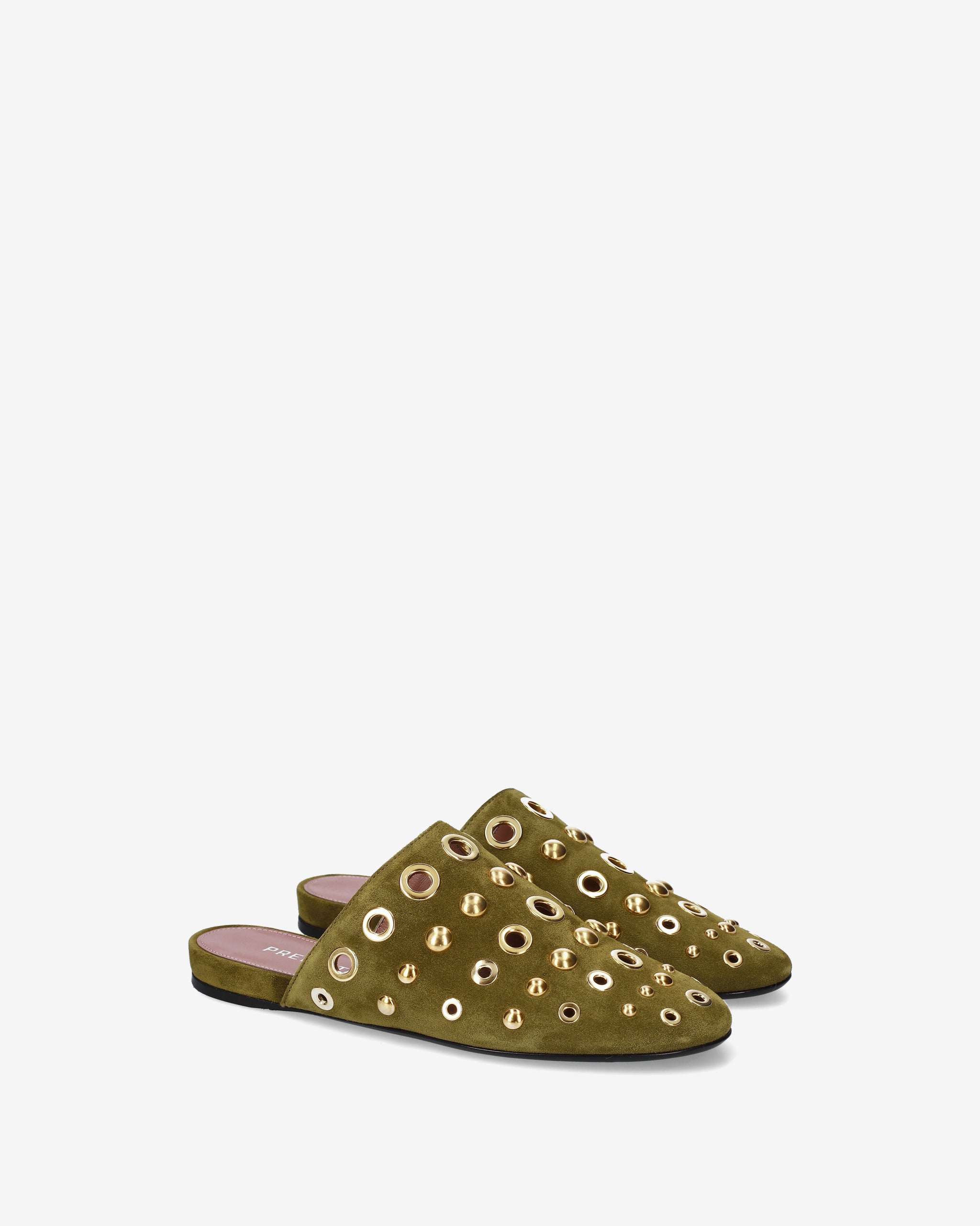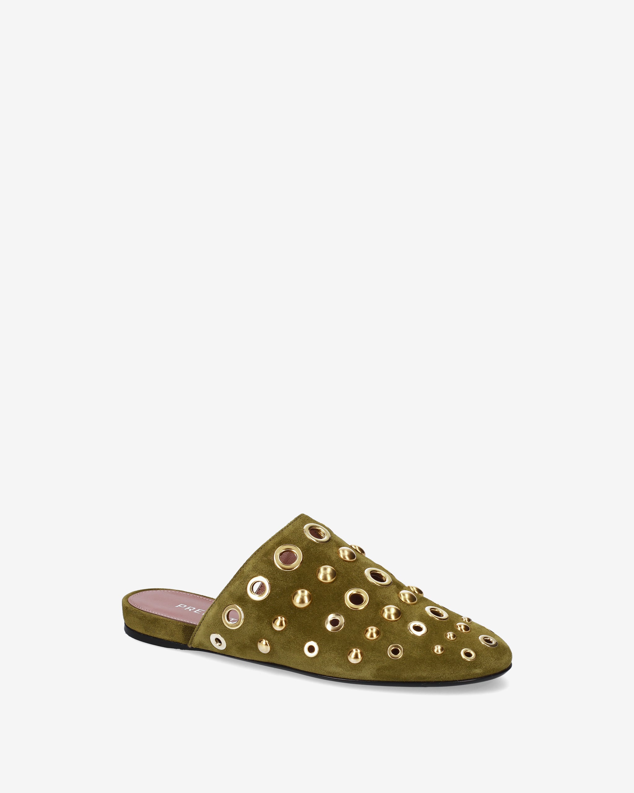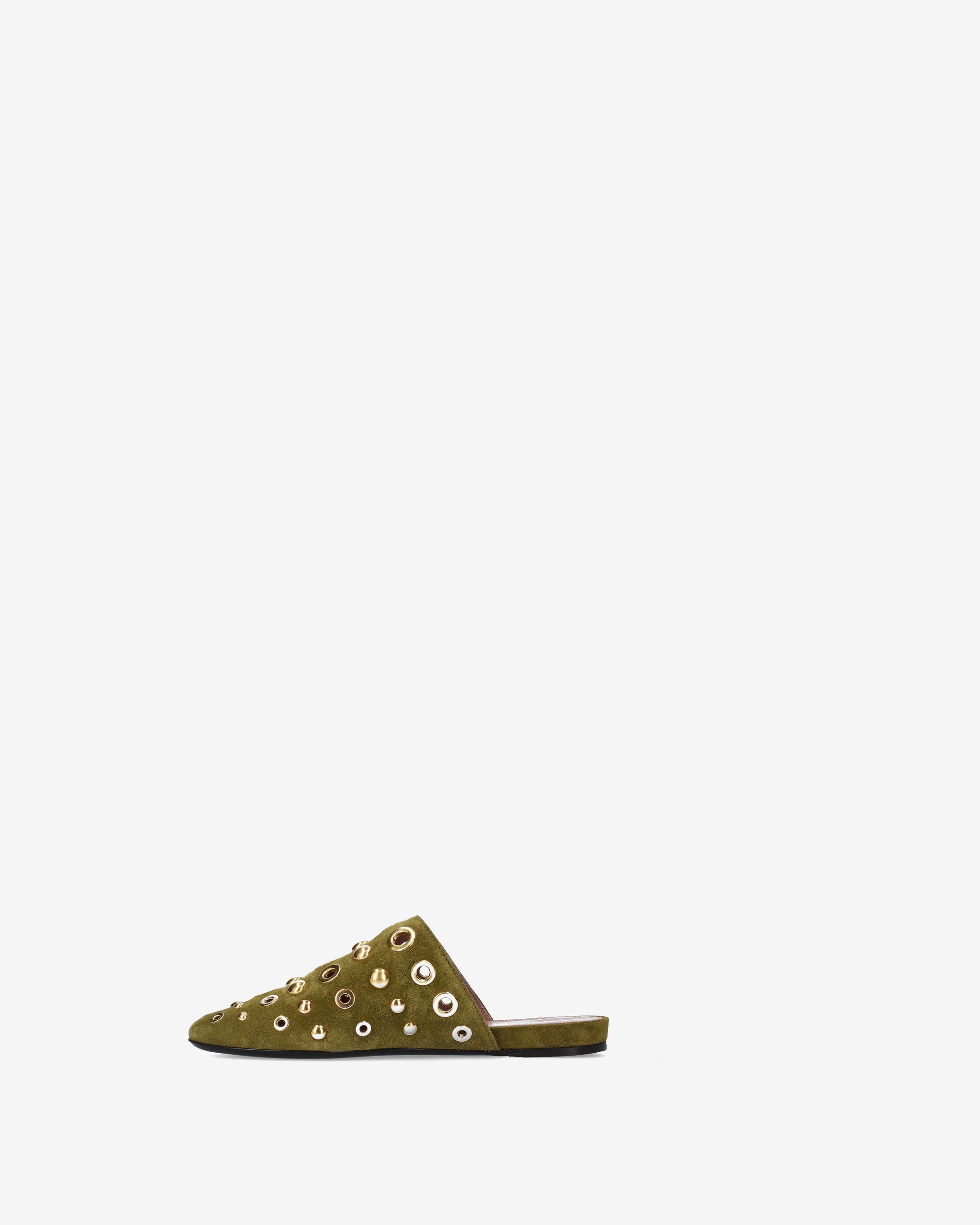 Elegante e di carattere, questo sabot flat combina la morbidezza della pelle scamosciata con un decoro metallico audace. La silhouette essenziale e la tonalità olive lo rendono l'accessorio ideale per completare look boho-chic o outfit urban quotidiani