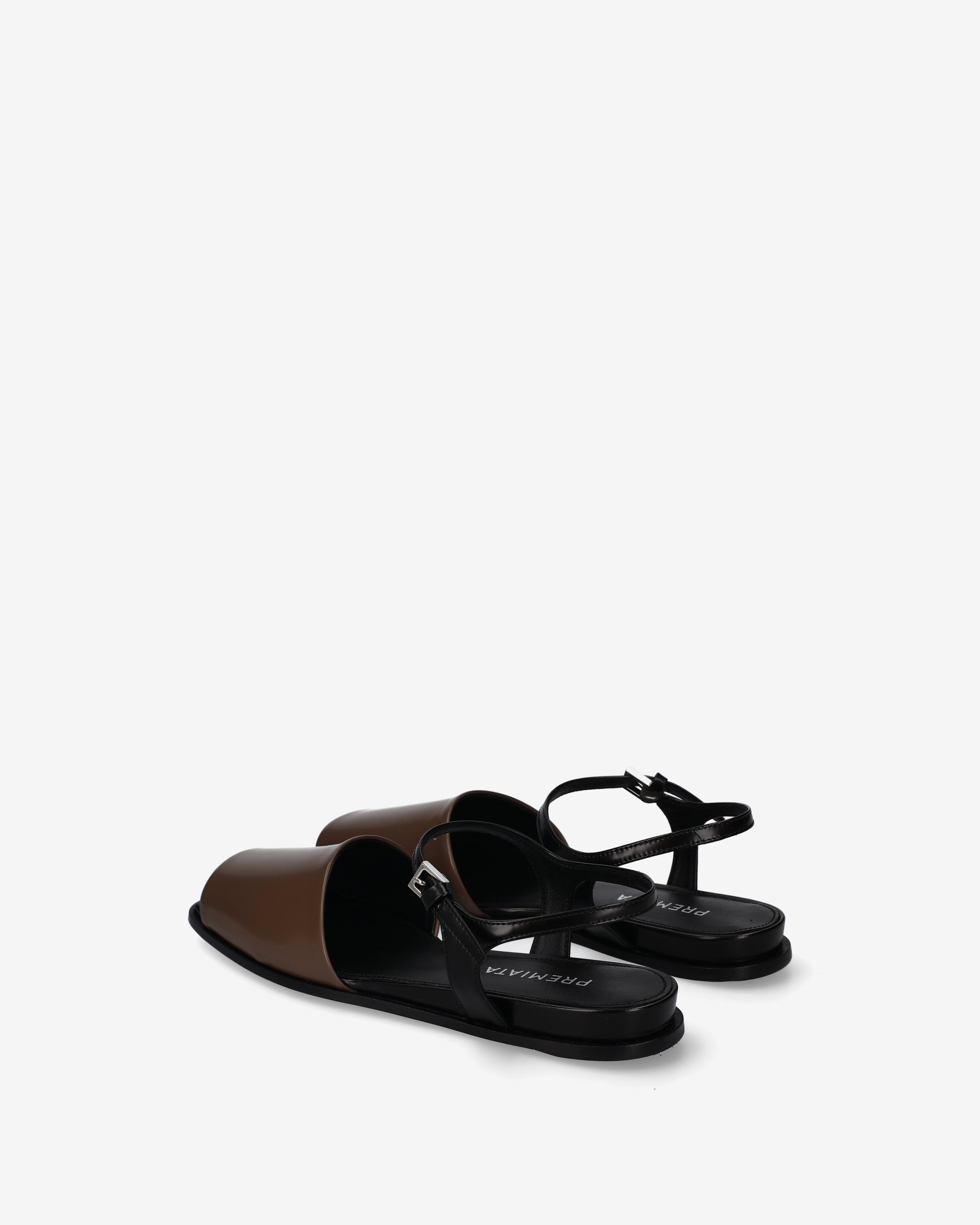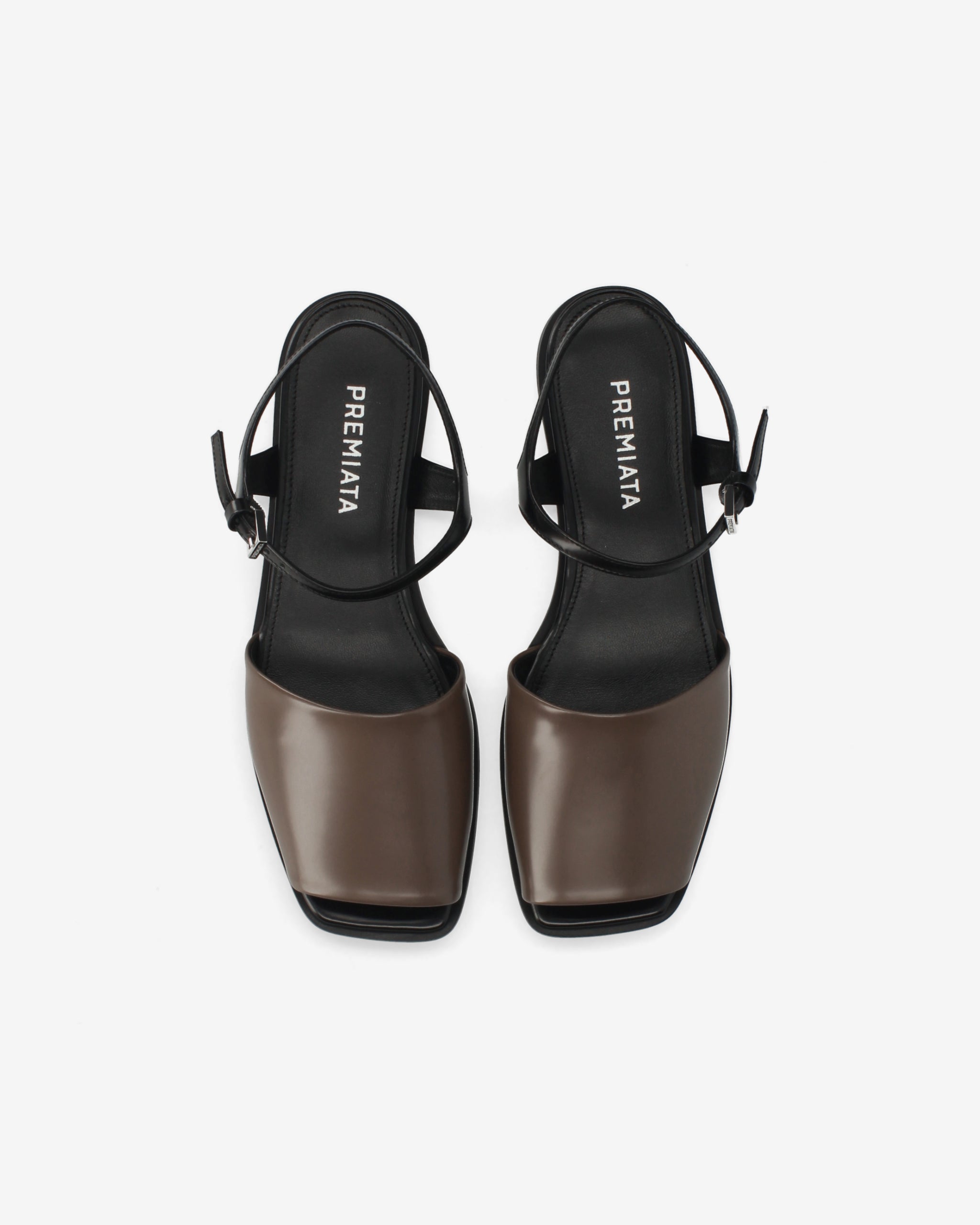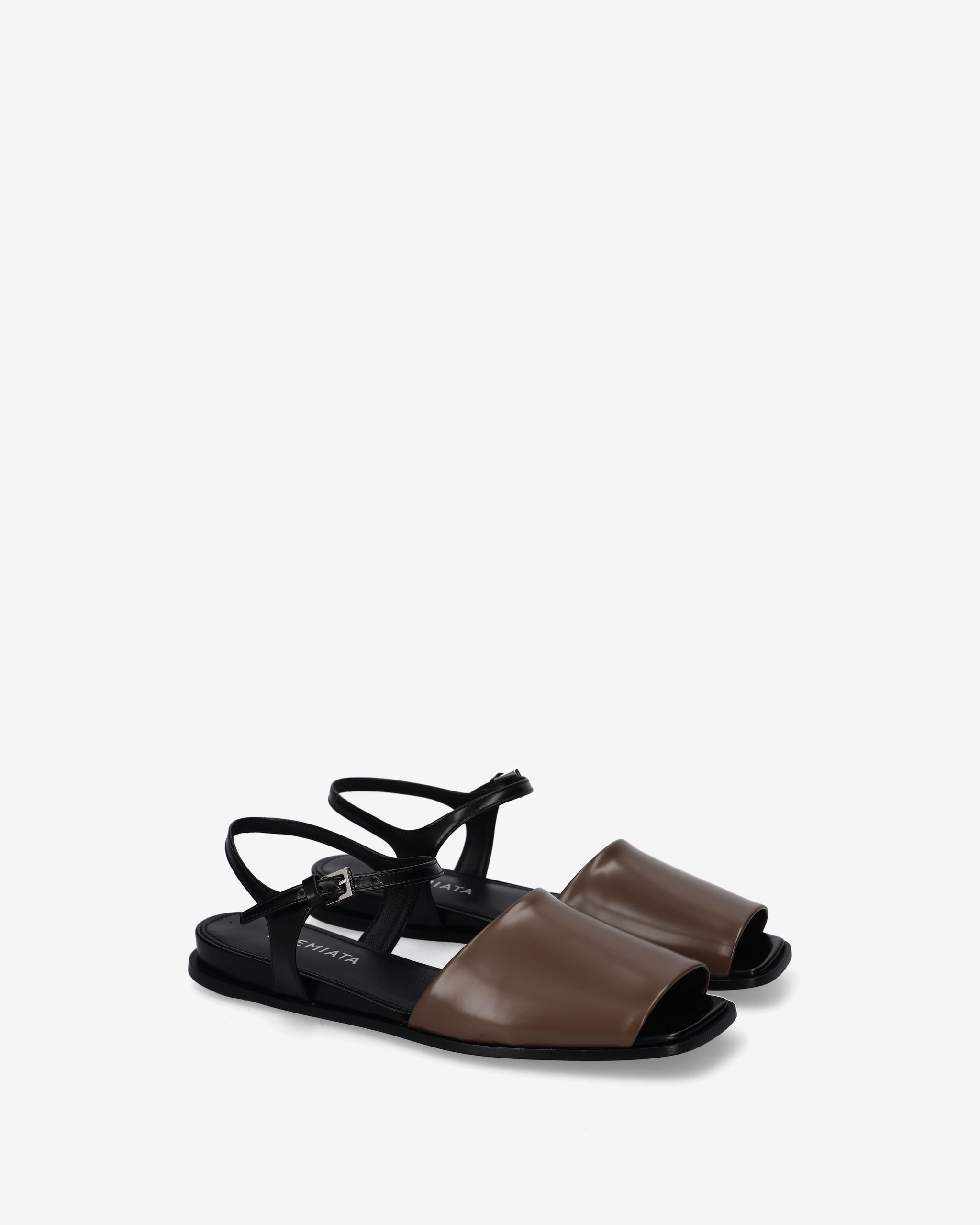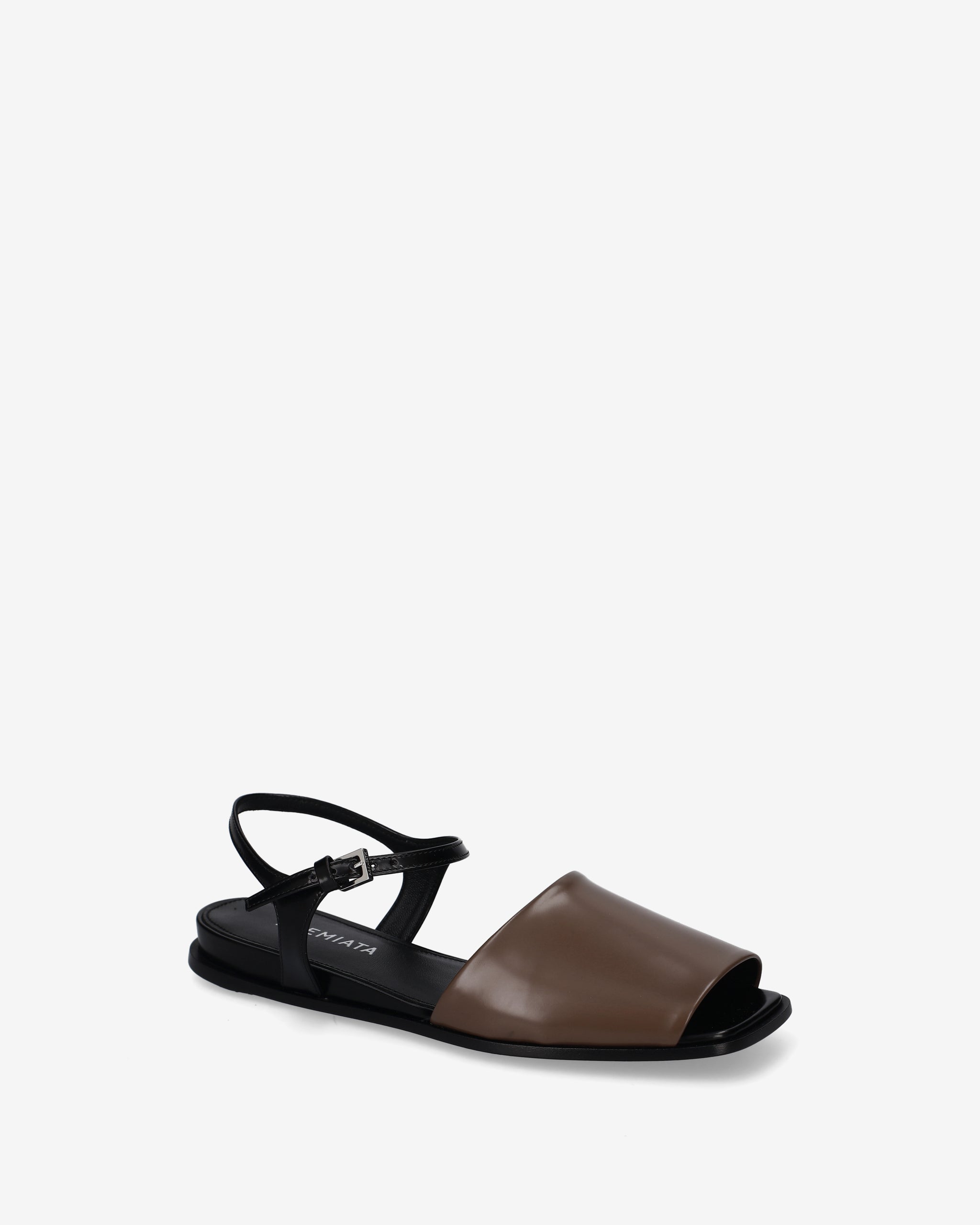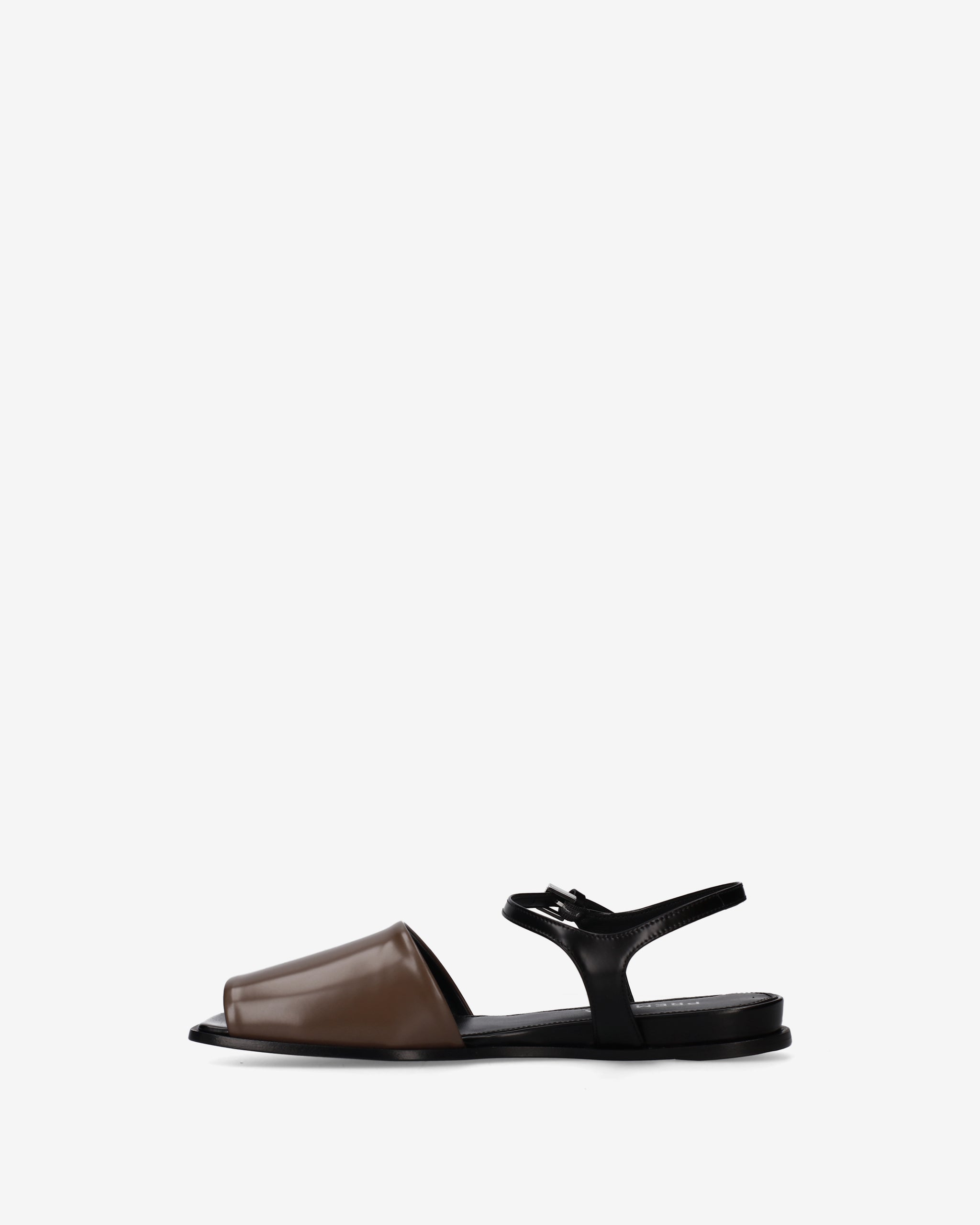 Un sandalo dal design contemporaneo e grafico, caratterizzato da un raffinato gioco di contrasti cromatici e finiture lucide. La struttura essenziale valorizza il taglio geometrico della tomaia, offrendo uno stile sofisticato e moderno