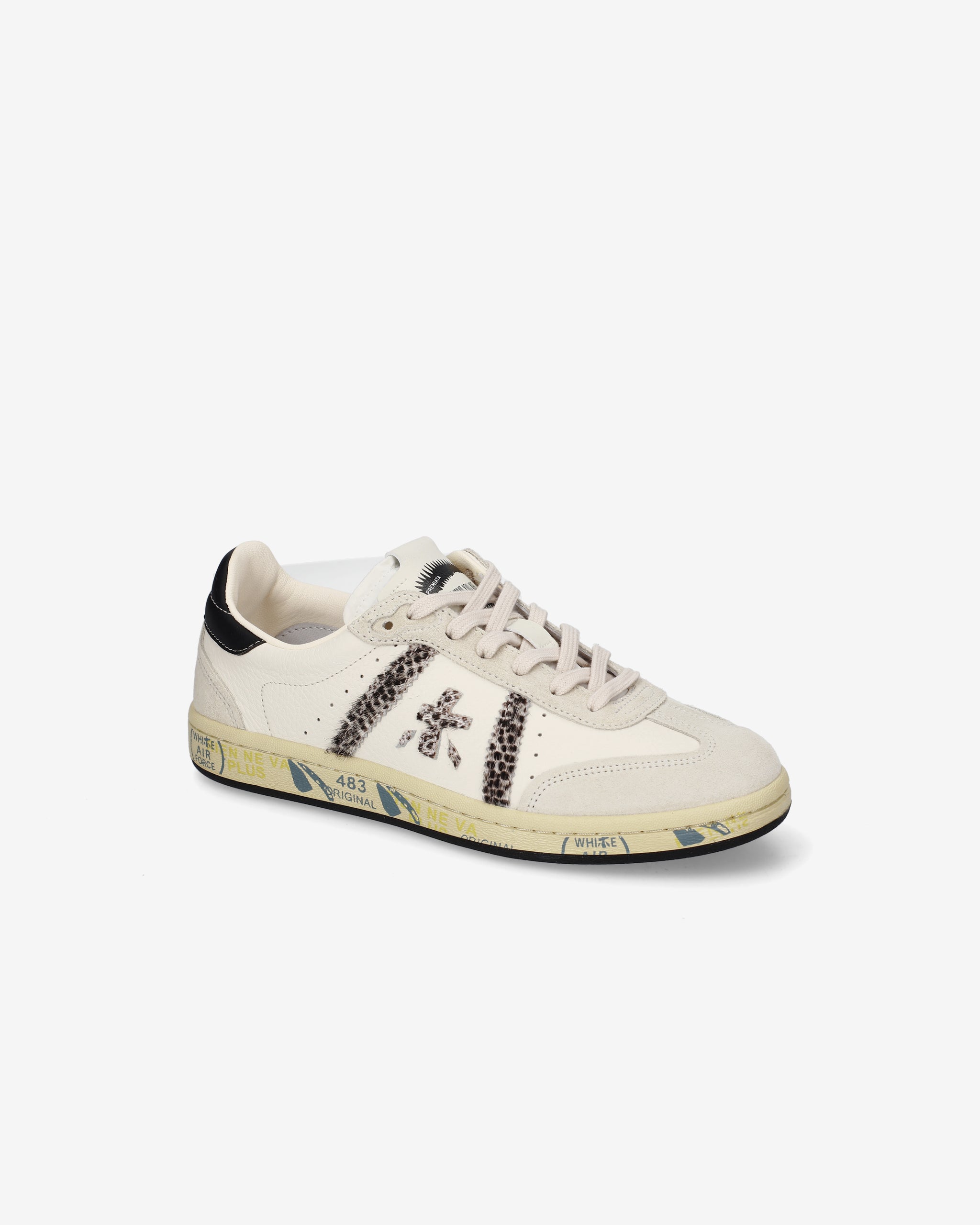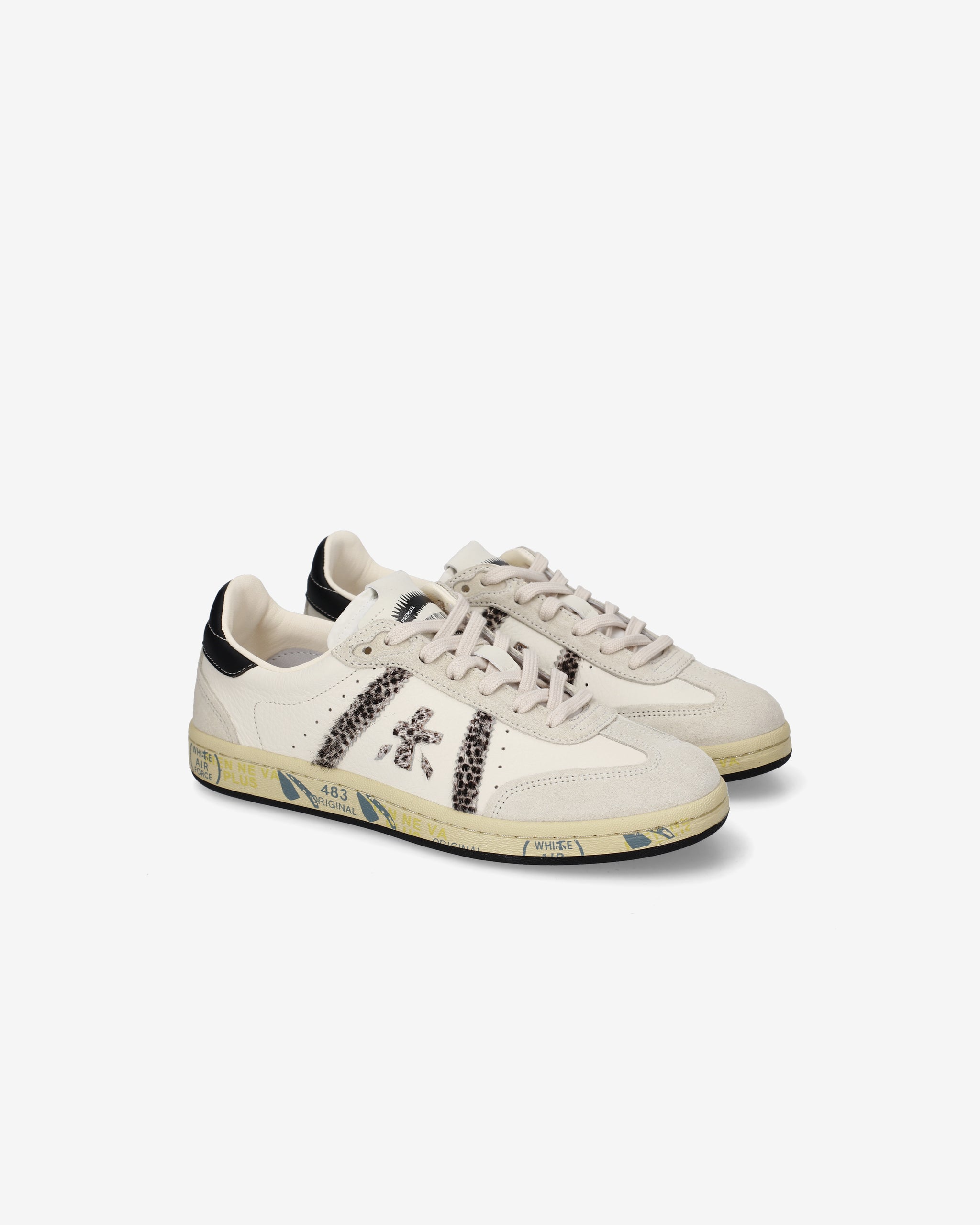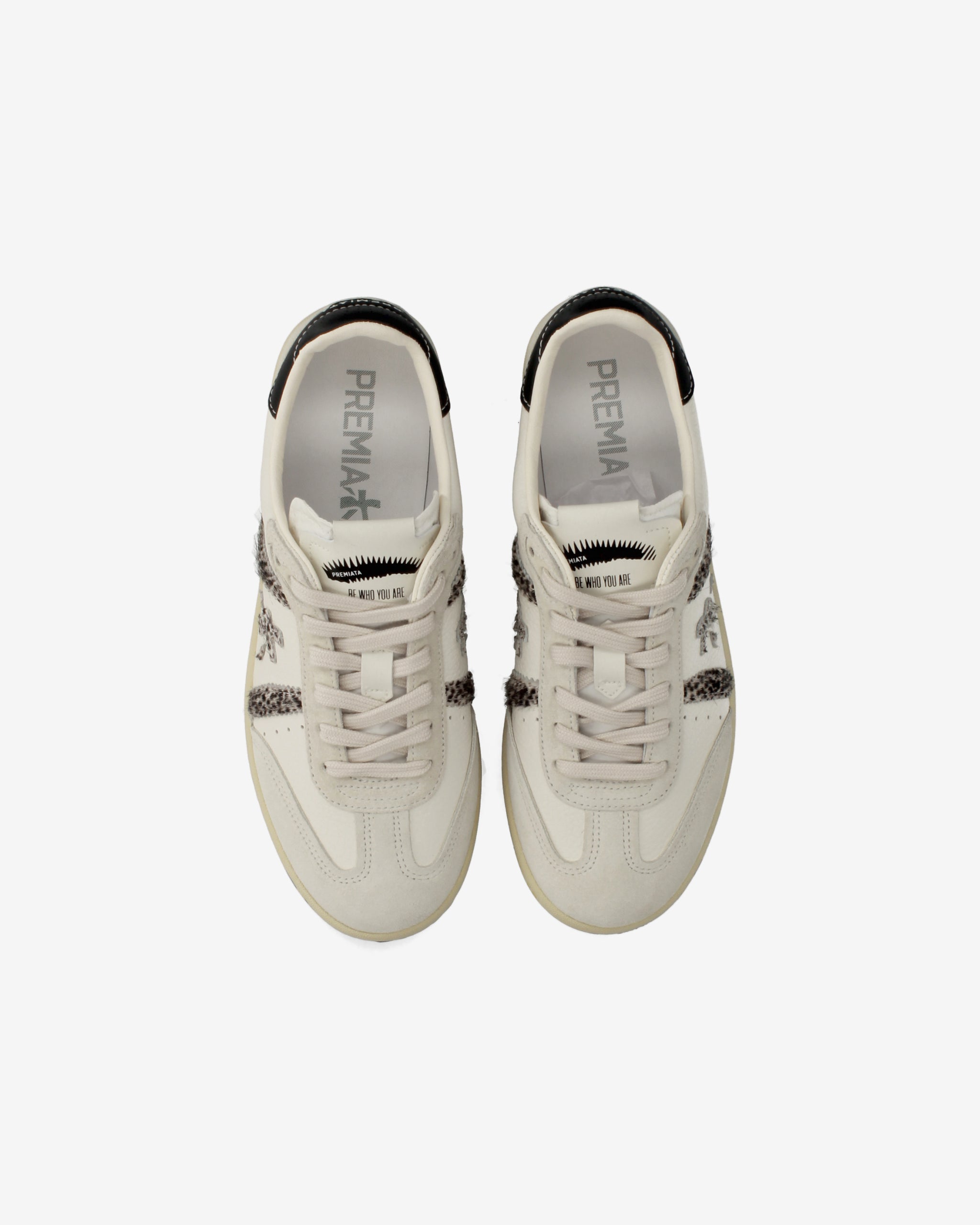 Questa sneaker dal look pulito e contemporaneo presenta una tomaia beige con accenti neri, punta in pelle scamosciata e tallone a contrasto. Il motivo laterale a pois e la suola decorata con timbri distintivi aggiungono un tocco originale, perfetta per uno stile urbano e versatile.