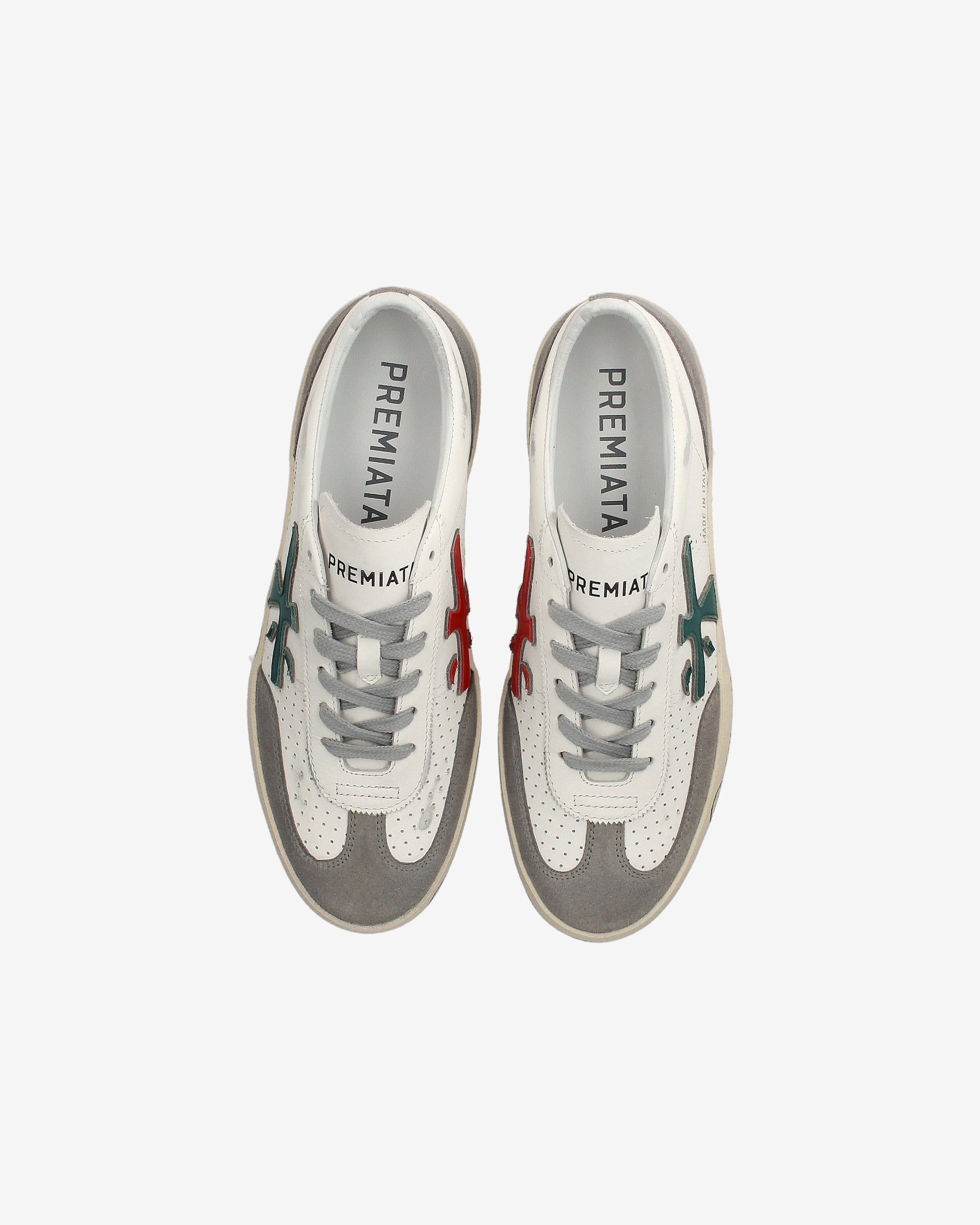 Sneakers dallo stile urbano con tomaia in pelle e pelle scamosciata, logo laterale verde scuro e suola in gomma con timbri decorativi. I lacci grigi completano il look casual e raffinato, perfetta per ogni giorno.