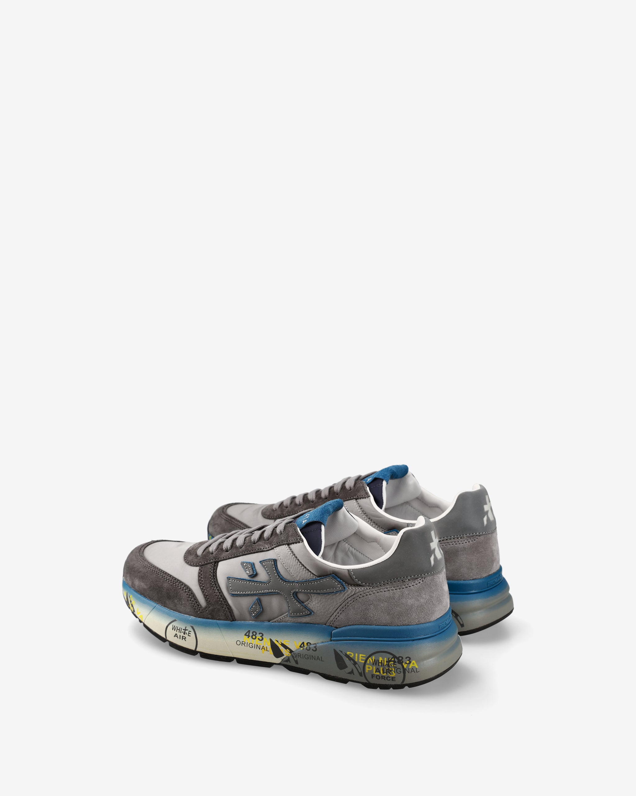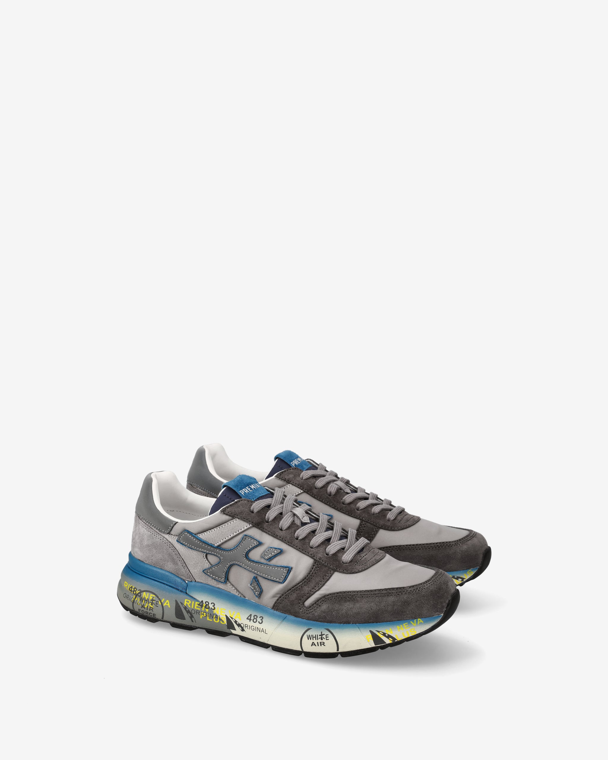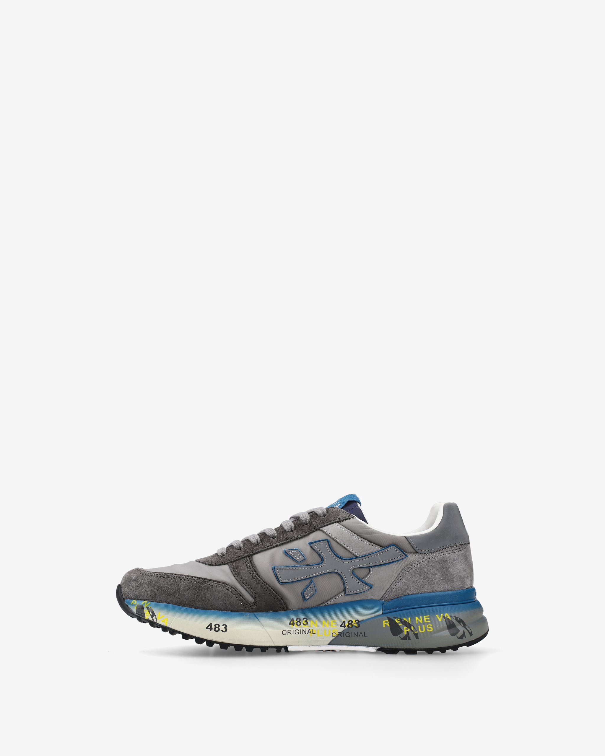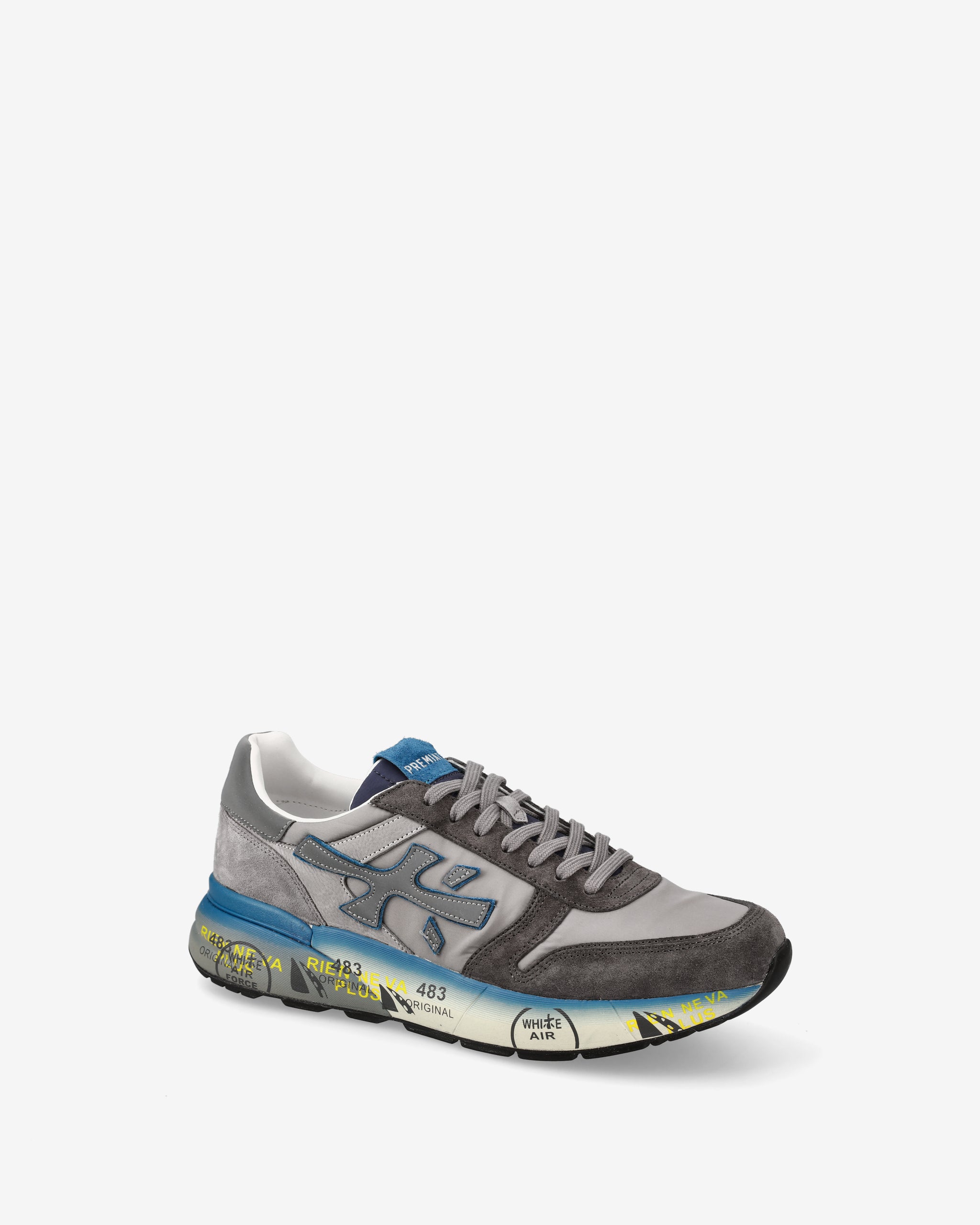 Un mix di materiali e pellami di qualità. La scarpa è realizzata nelle tonalità del blu e del grigio per uno stile casual. L'iconica silhouette è arrichita dal logo Premiata.