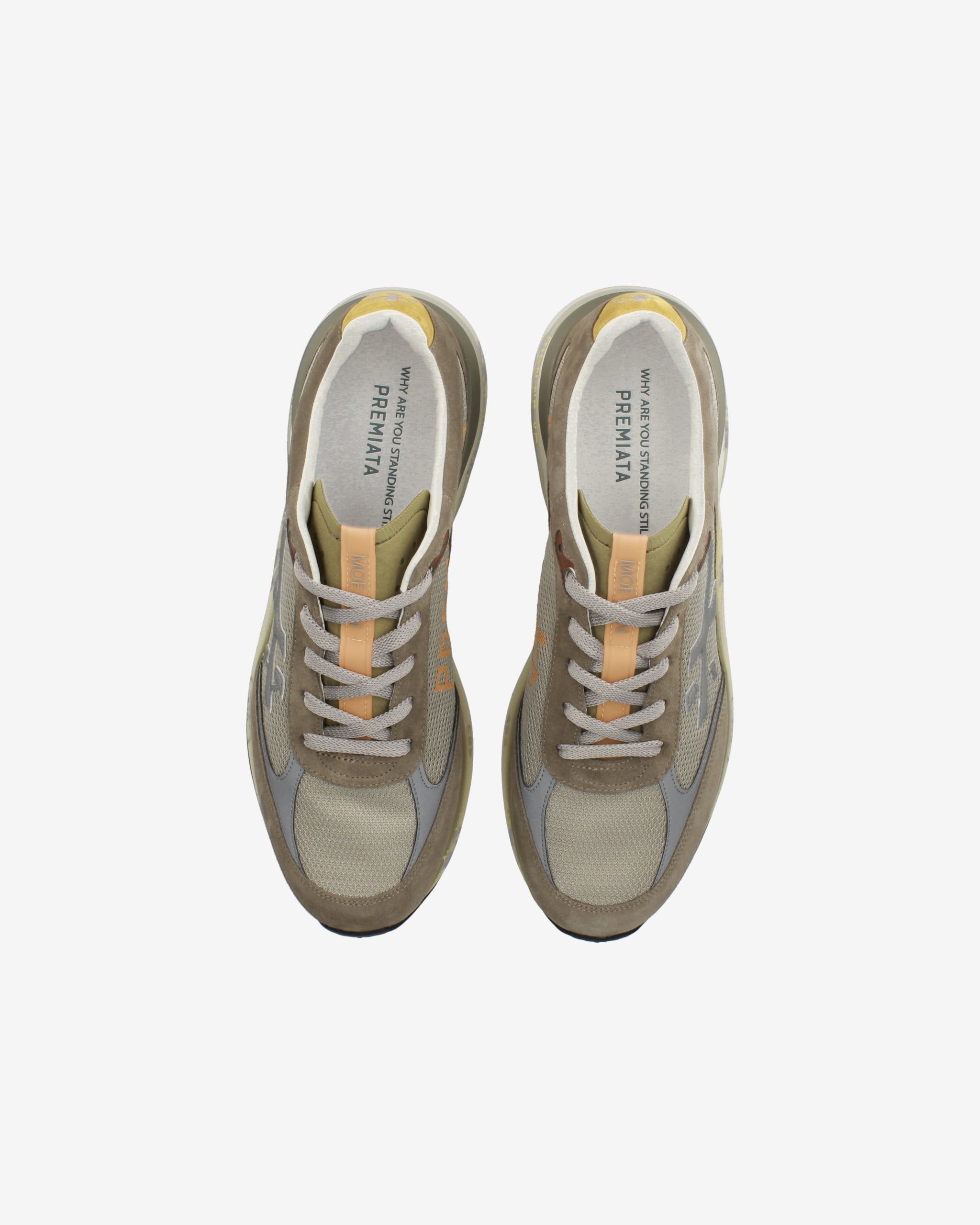 Ideate per stupire. La Moerun si basa sulla leggerezza del movimento, la stabilità e la sensazione ammortizzante data dall'innovazione del fondo. La nuova silhouette è ricca di dettagli: logo sul laterale esterno, scritta PREMIATA sul laterale interno e nome del modello sull'etichetta.