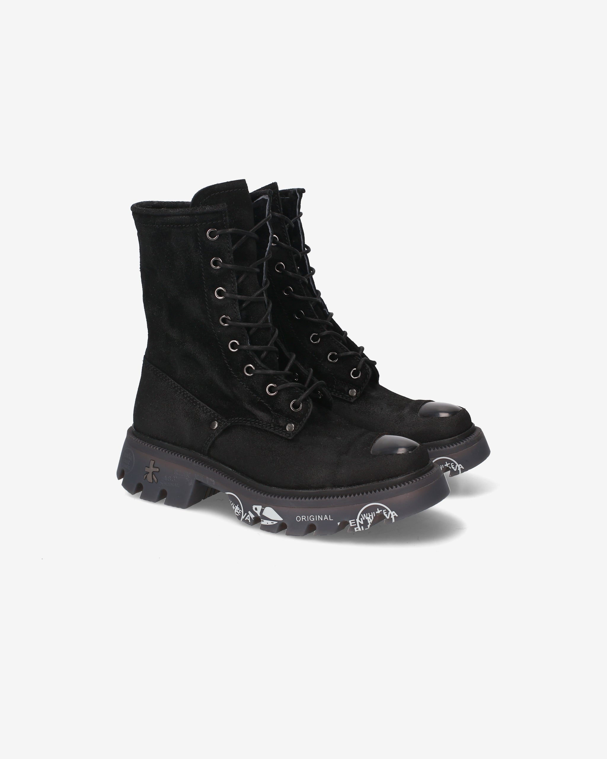 Anfibio in vitello nero foderato in montone, tutto in tono, dal look essenziale e raffinato ispirato all’estetica underground londinese. Perfetto per uno stile urbano e deciso.