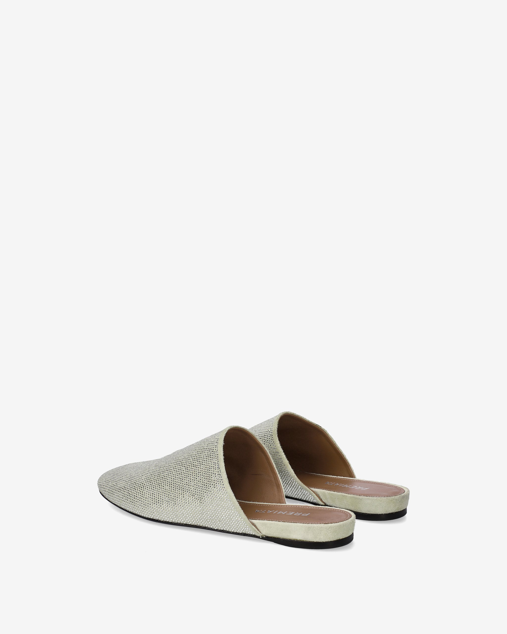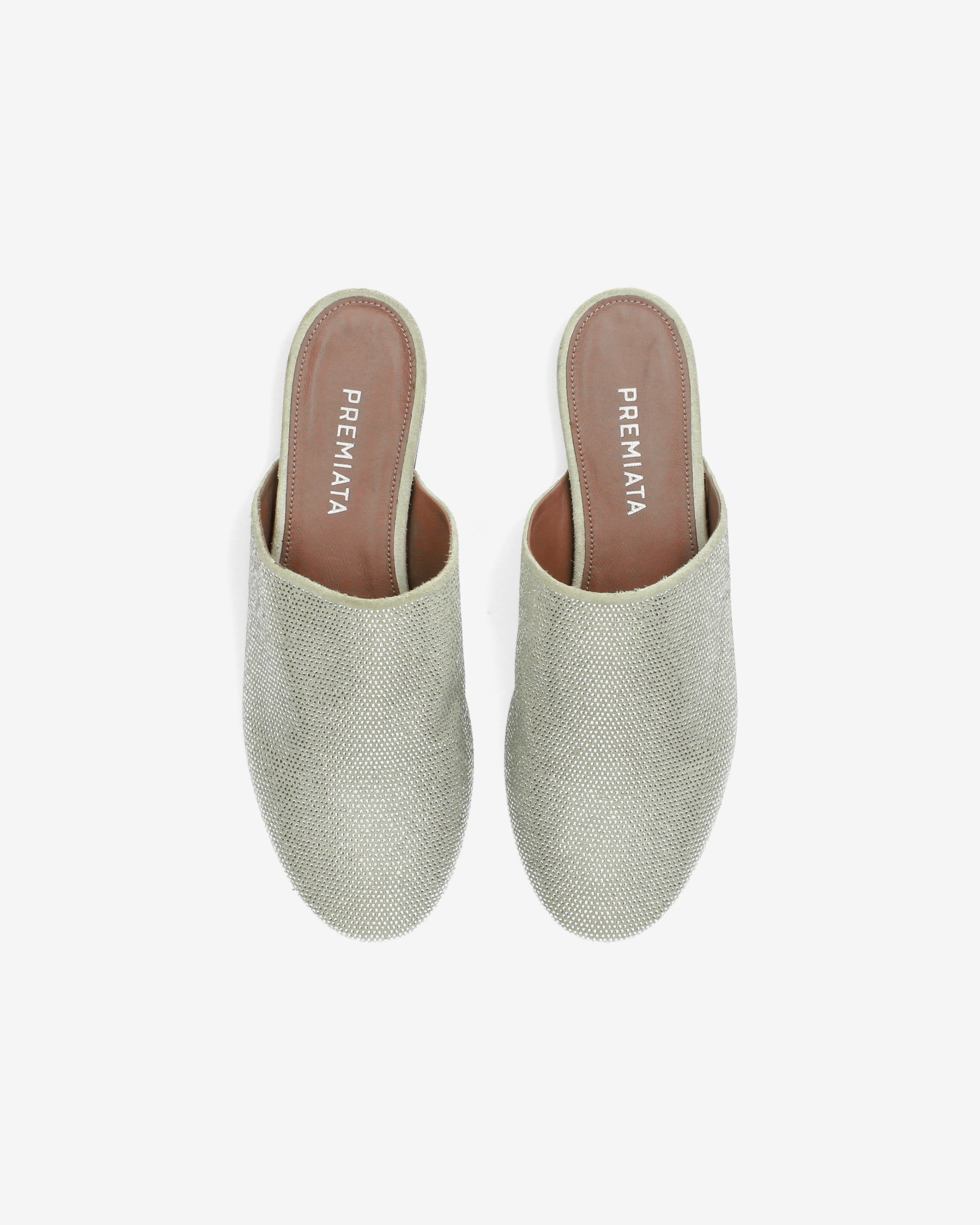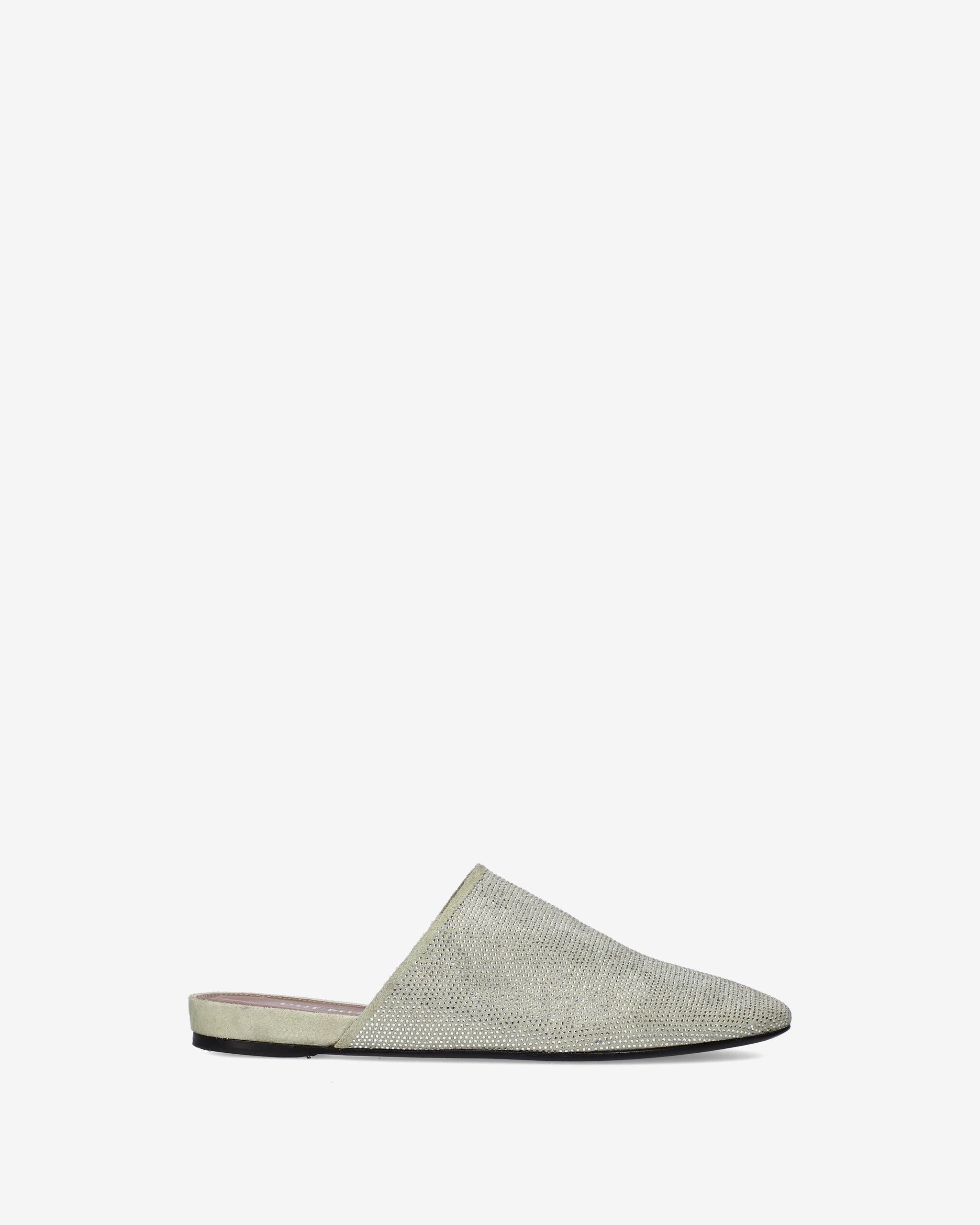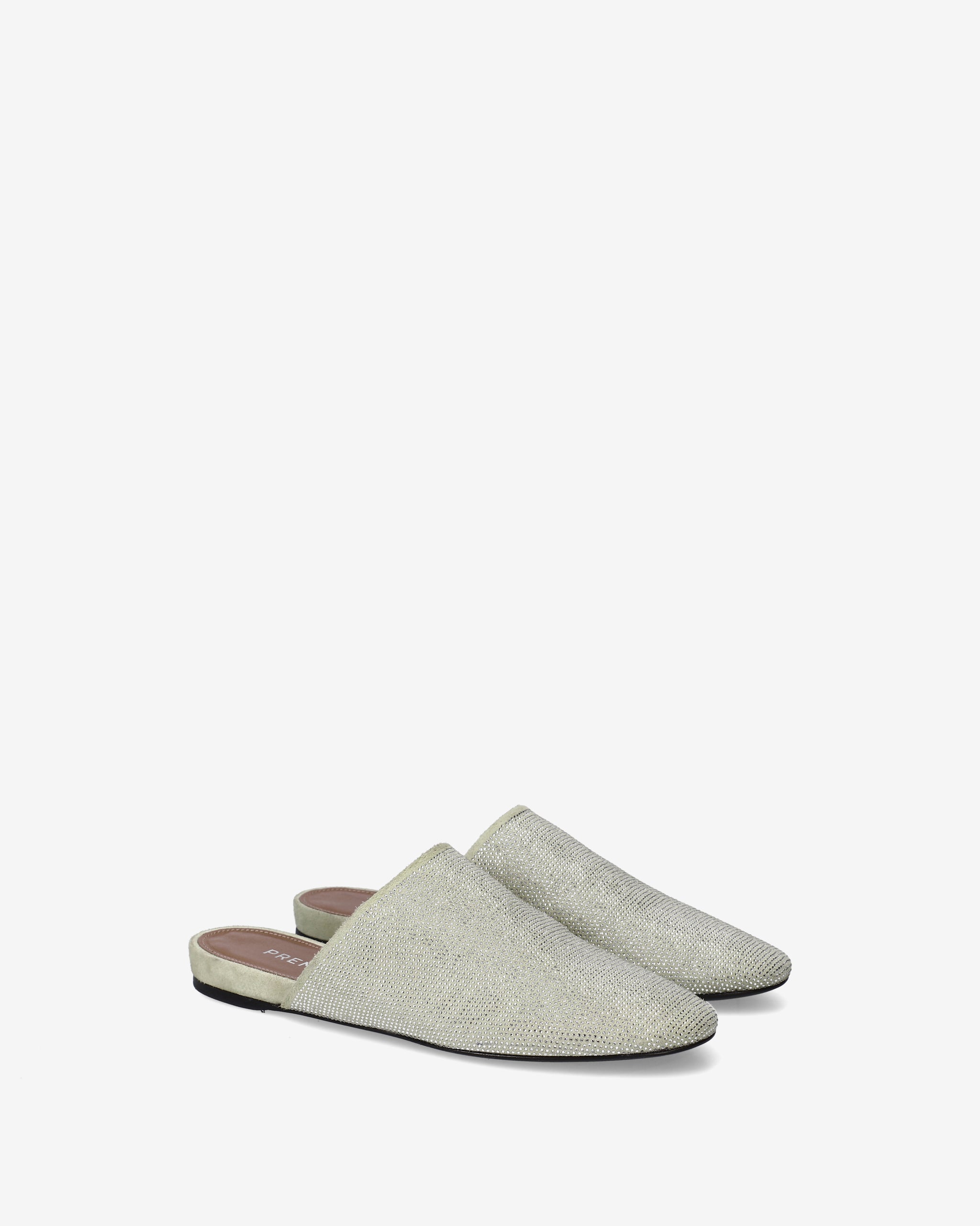Un’elegante slipper flat che eleva il concetto di calzatura da sera attraverso un design minimalista e un gioco di luce tono su tono. La combinazione del camoscio ghiaccio con i cristalli chiari crea un effetto di brillantezza discreta e profonda