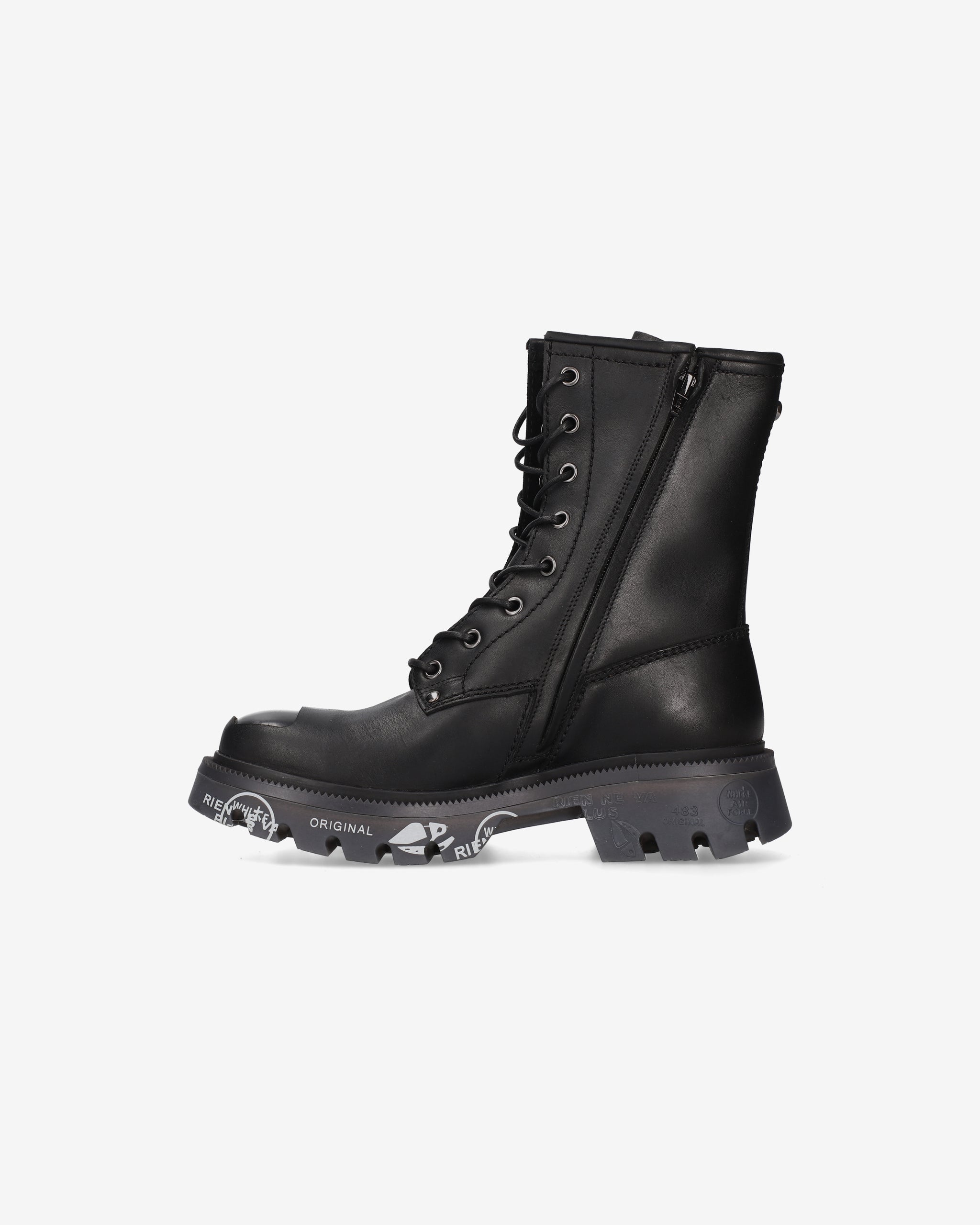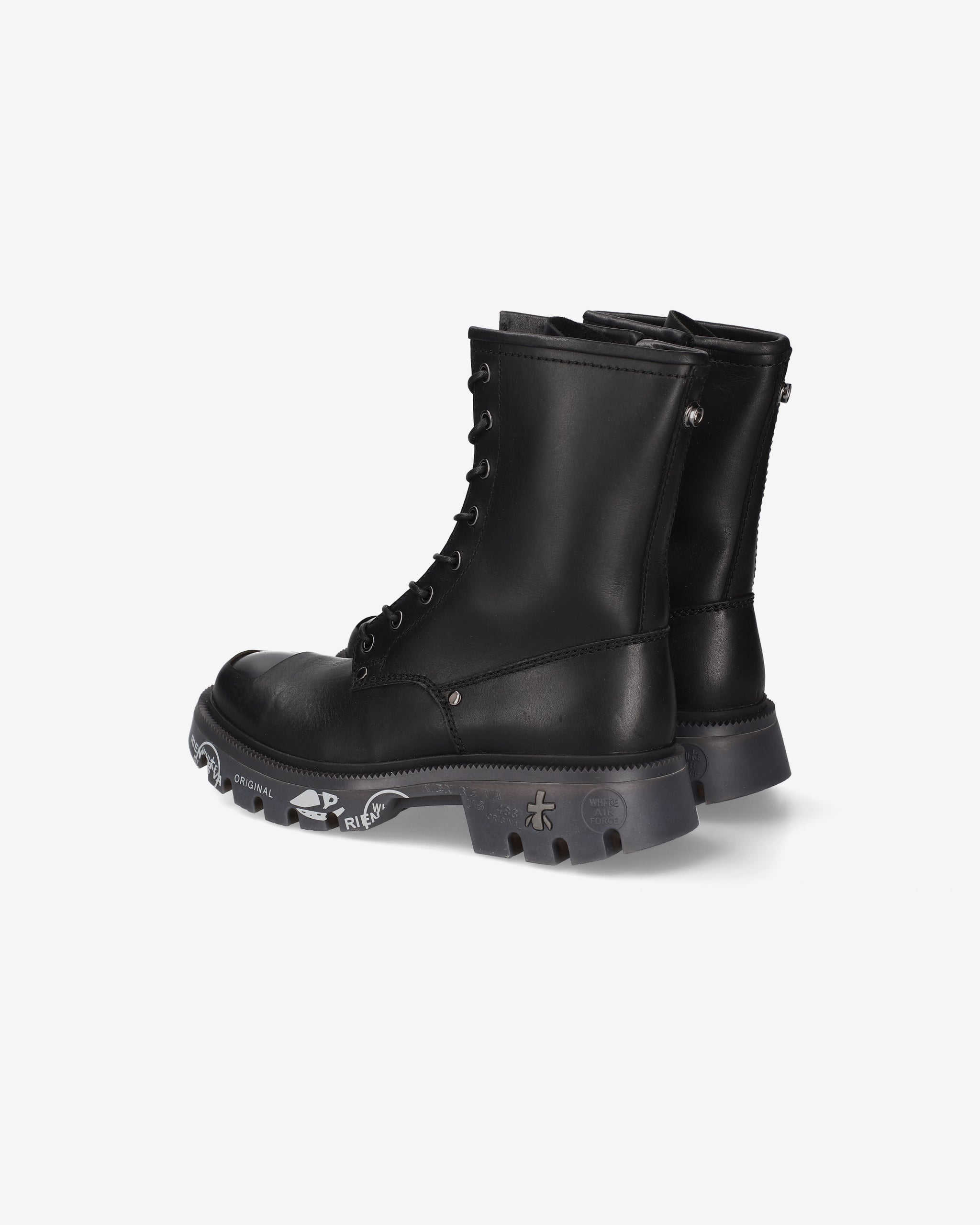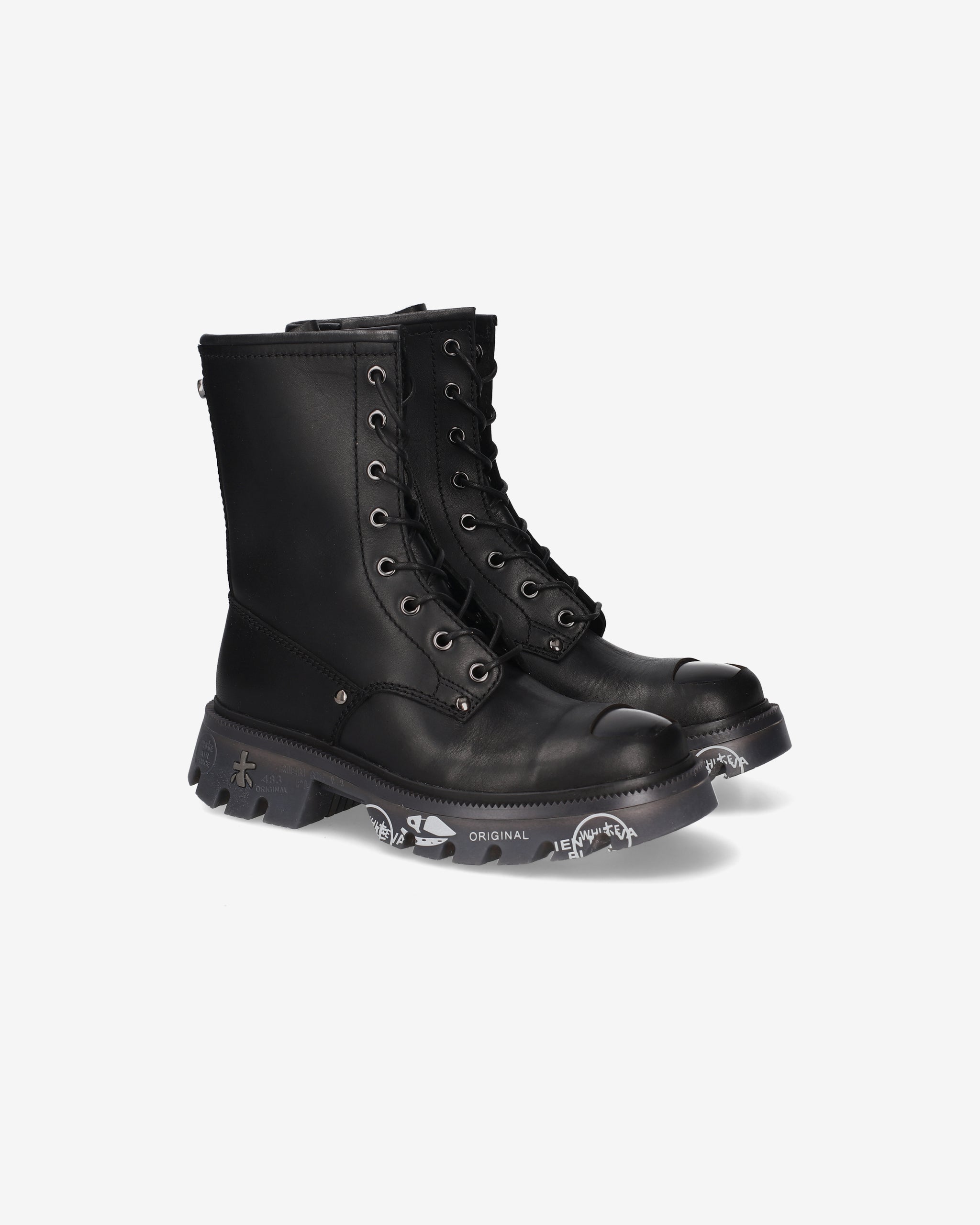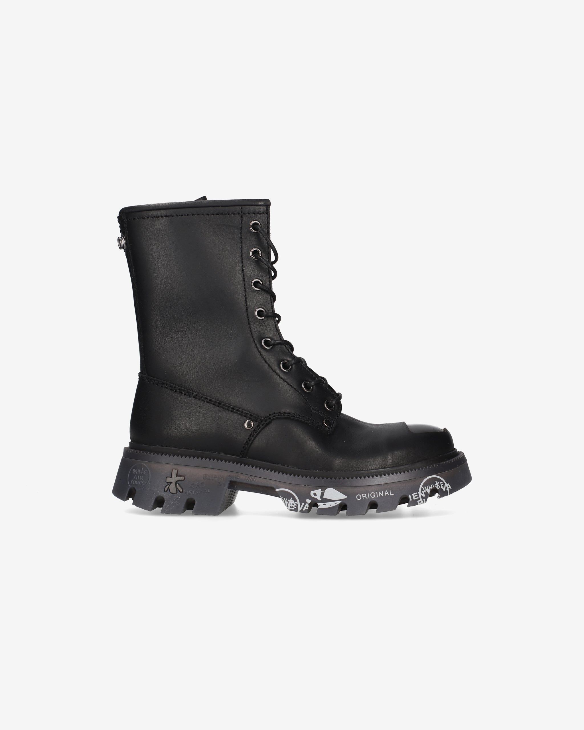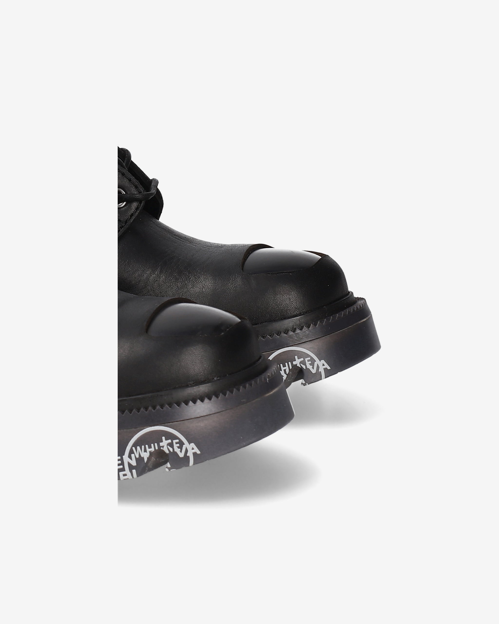 Anfibio in crosta ingrassata con puntale in ABS e suola in gomma traslucida nera. Design ispirato al mondo underground londinese, unisce stile urbano e resistenza.