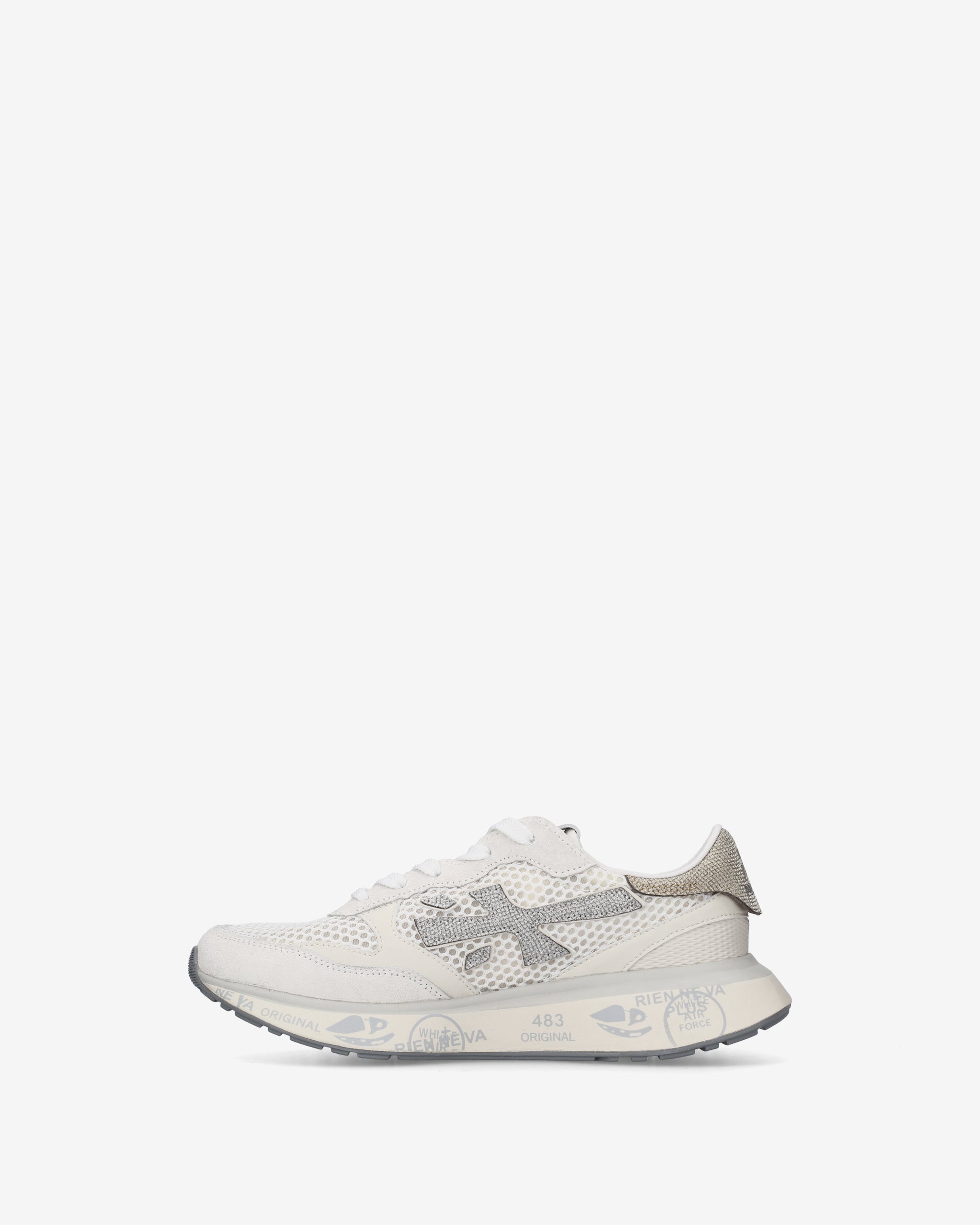 Stile e funzionalità si fondono in una sneaker rétro running rivisitata in chiave moderna. Realizzata con materiali di alta qualità, combina suede, pelle e tessuto per un look distintivo. La suola, arricchita dagli iconici dettagli stile Premiata, esalta l'identità urban e casual-chic.