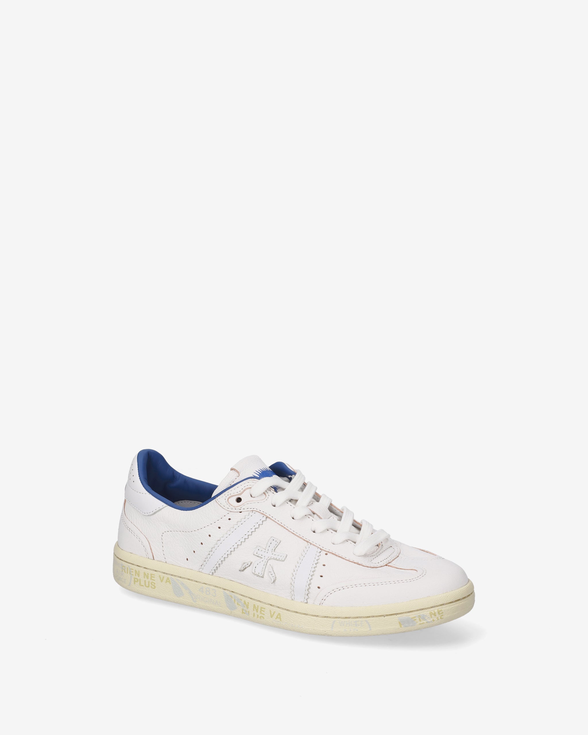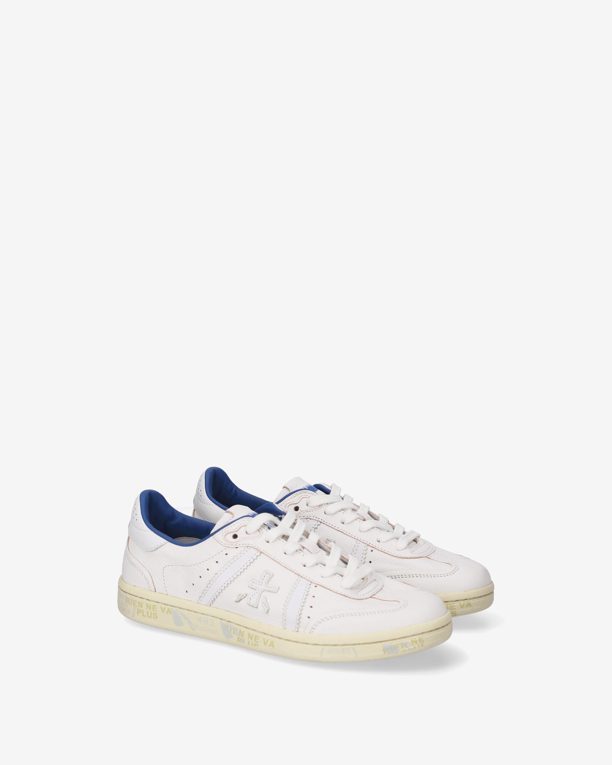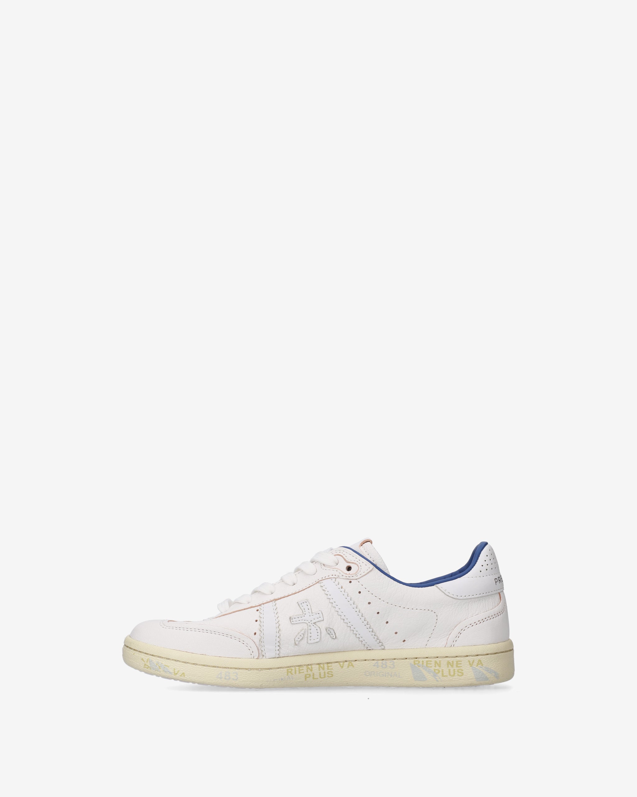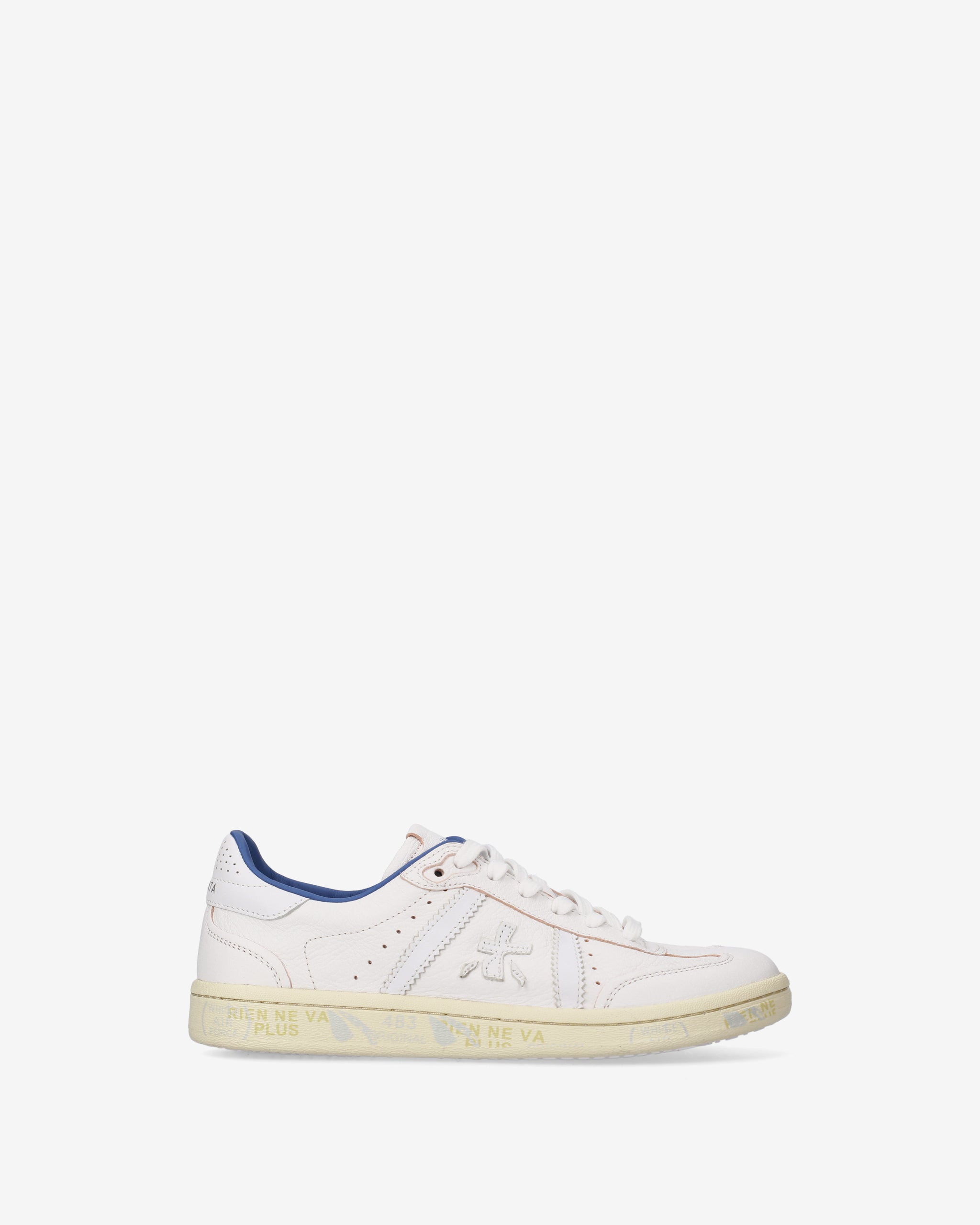 White Bonnie and off-white sole with contrasting blue lining. A white sneaker for a clean and sophisticated look.