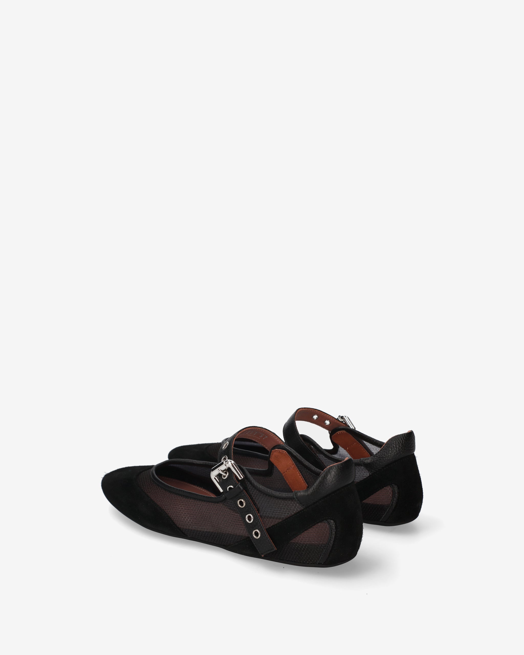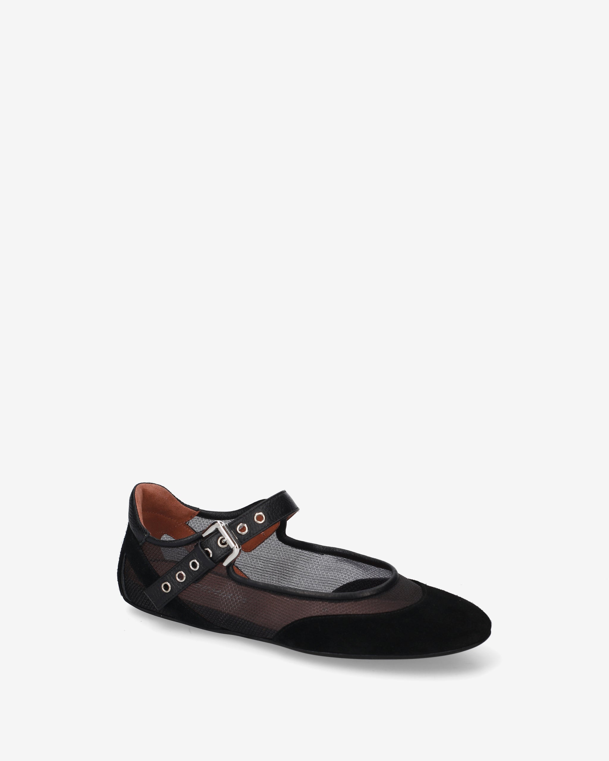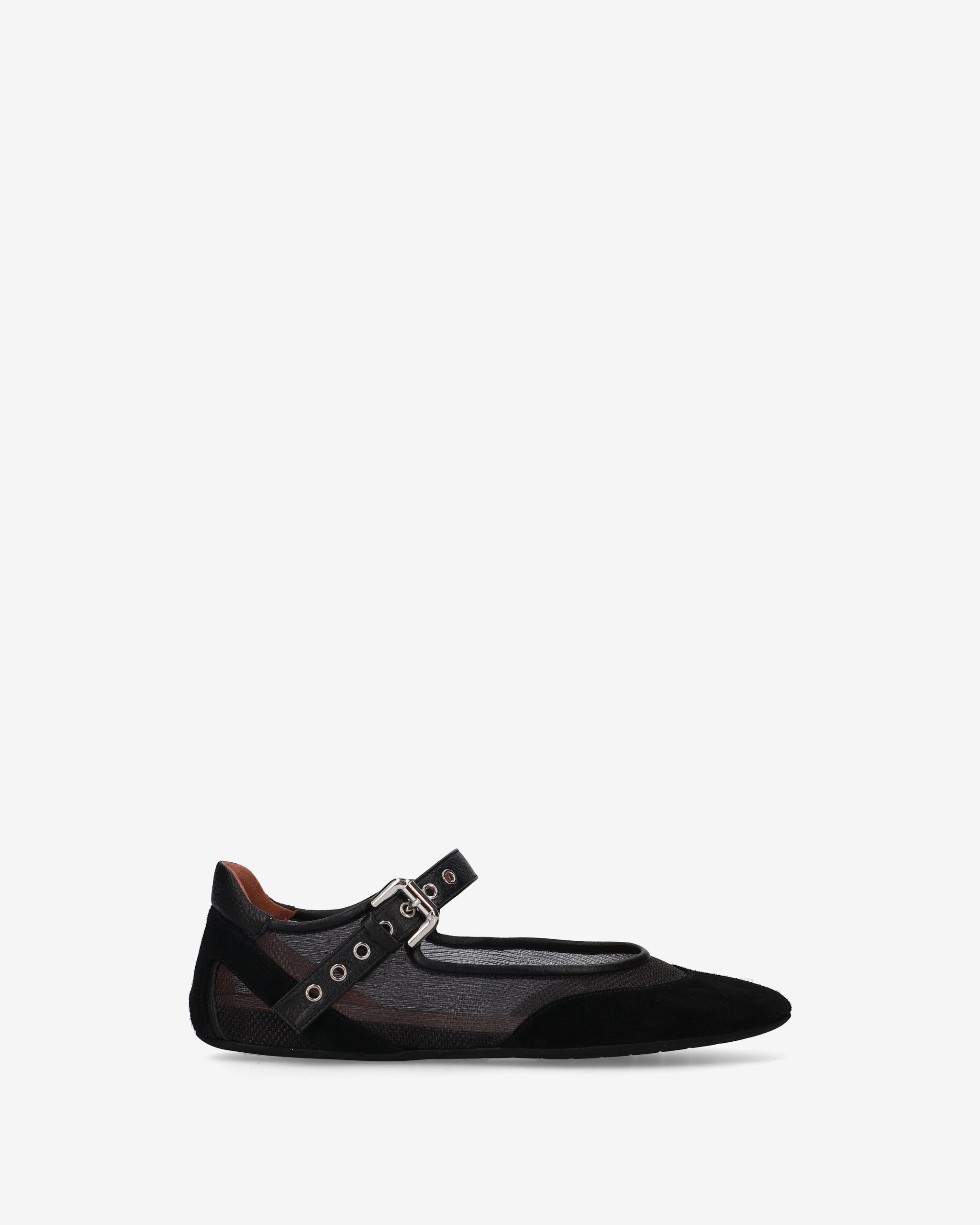 A flat shoe that combines the classic elegance of Mary Janes with a technical, futuristic aesthetic. The interplay of transparencies and the combination of different materials create a dynamic, ultra-lightweight design.