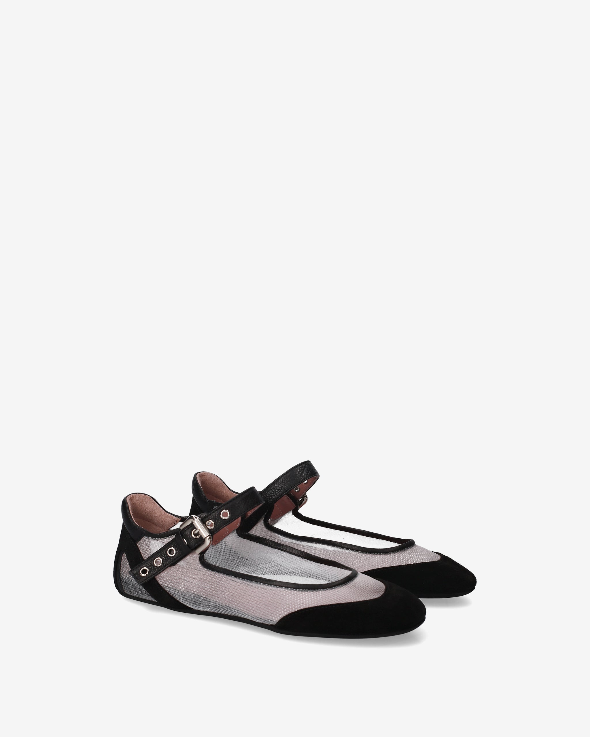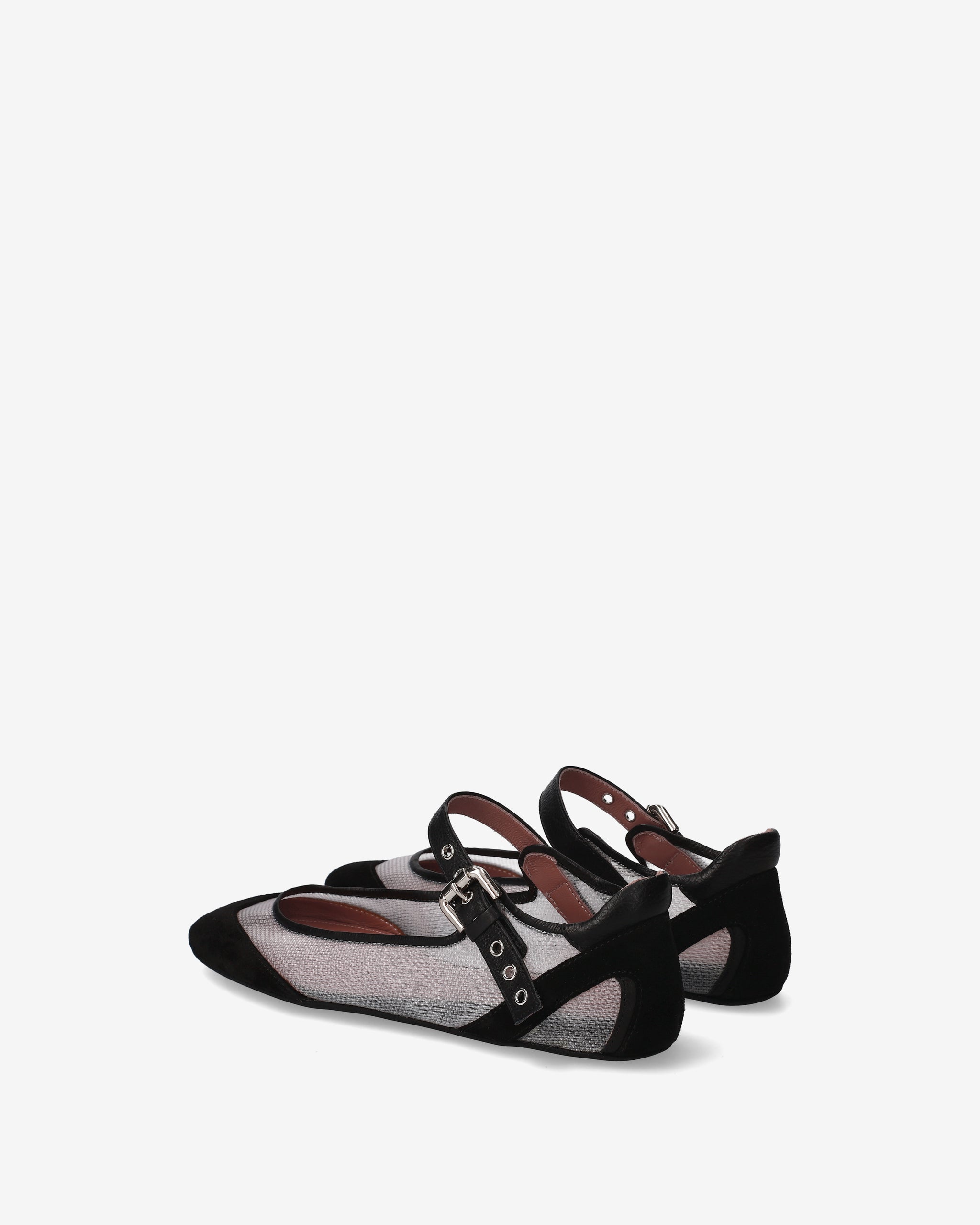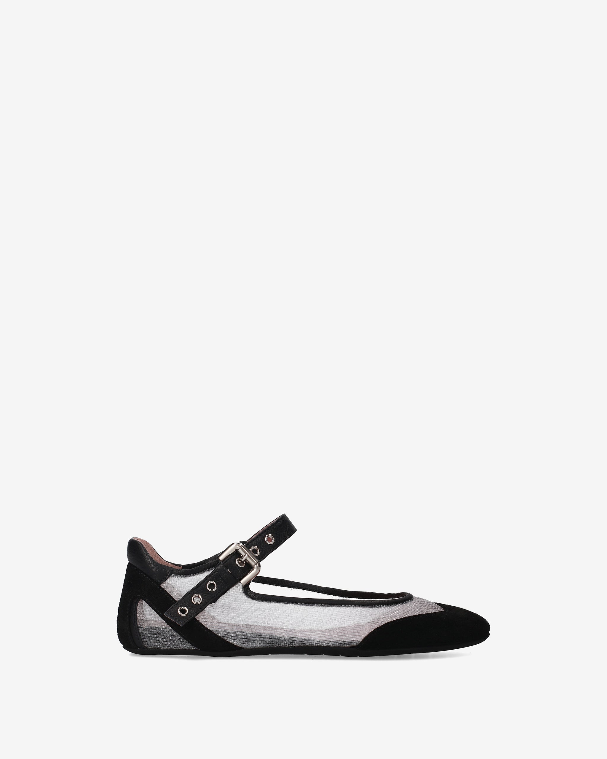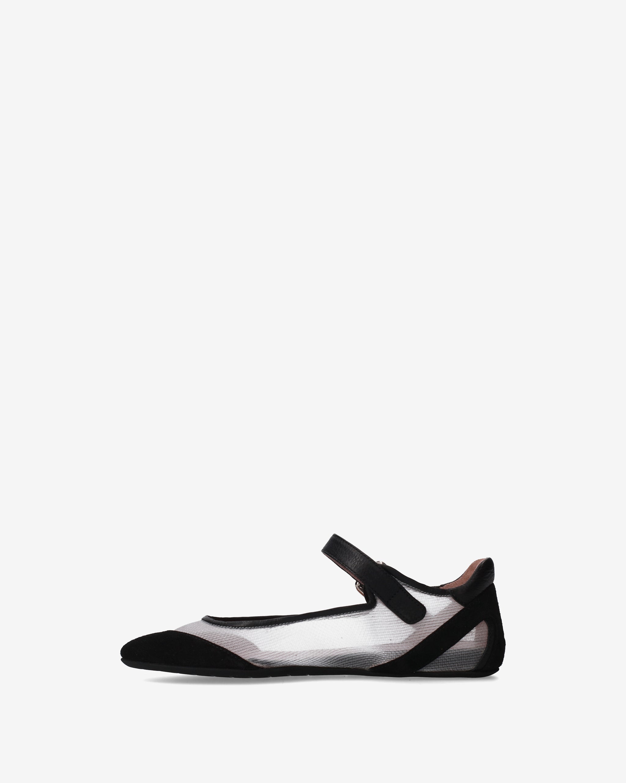 A flat shoe that combines the classic elegance of Mary Janes with a technical, futuristic aesthetic. The interplay of transparencies and the combination of different materials create a dynamic, ultra-lightweight design.