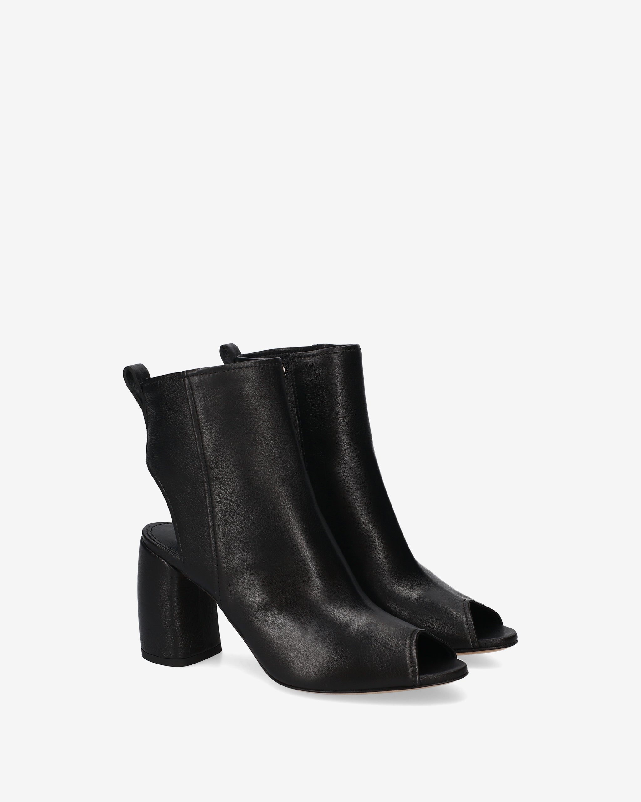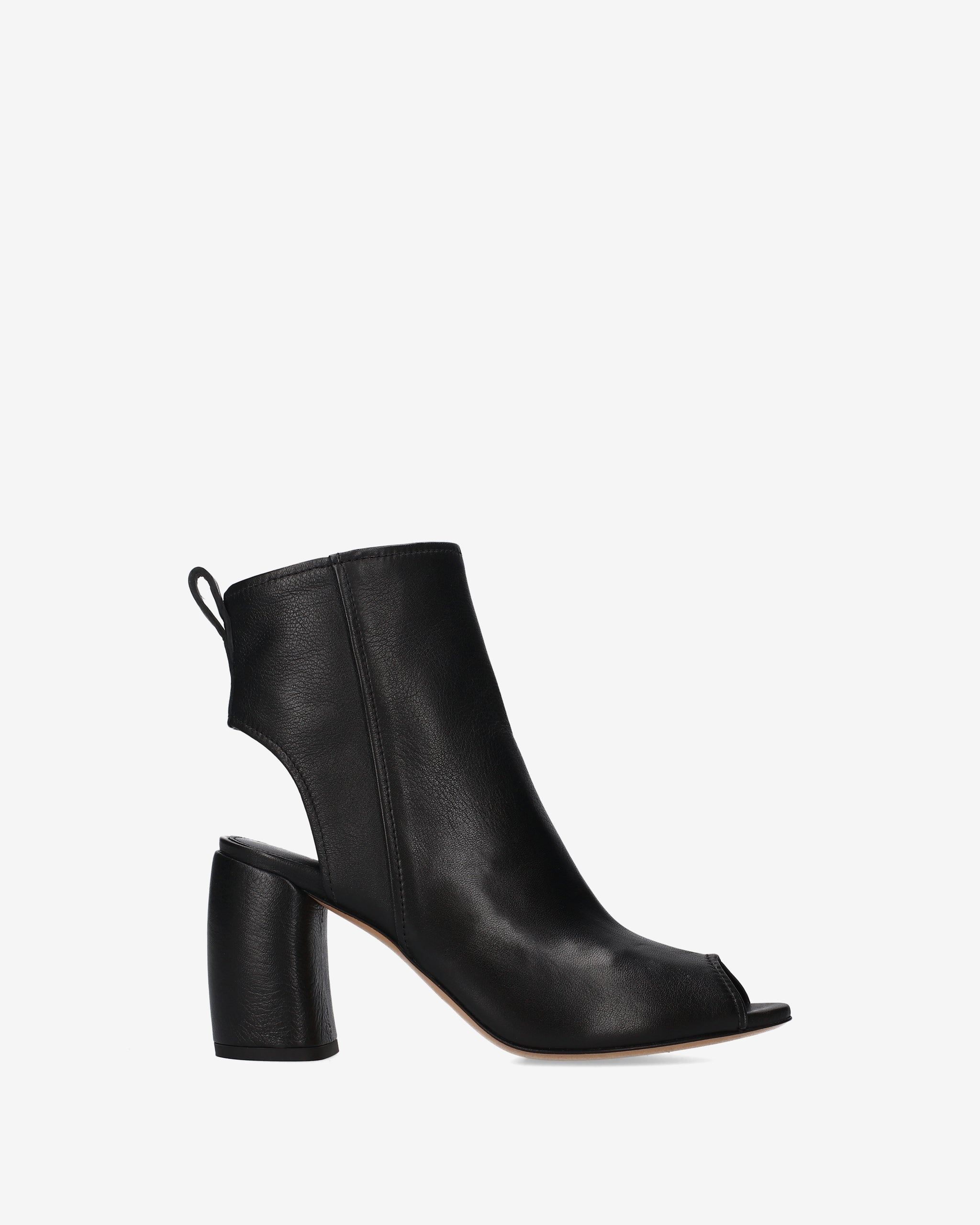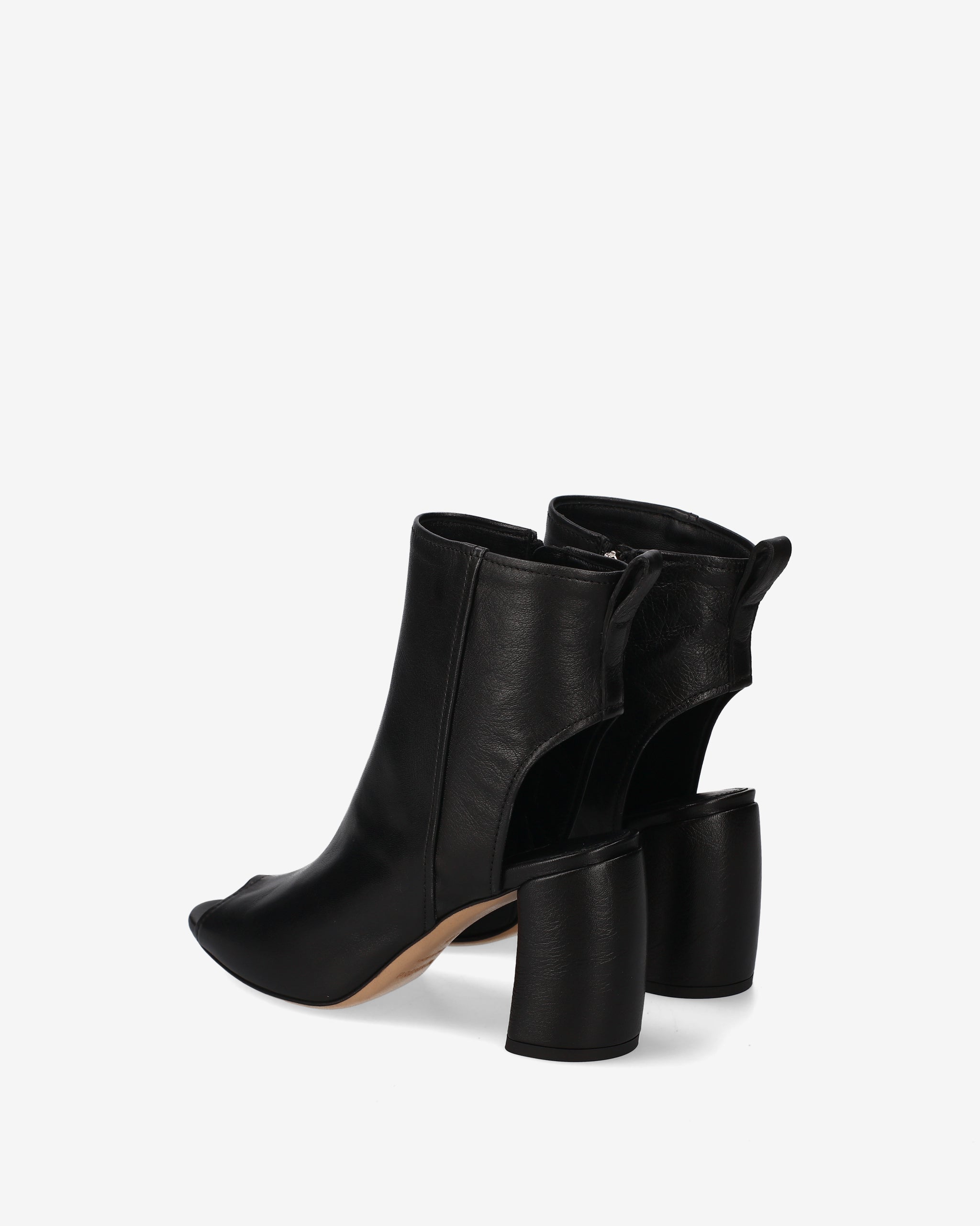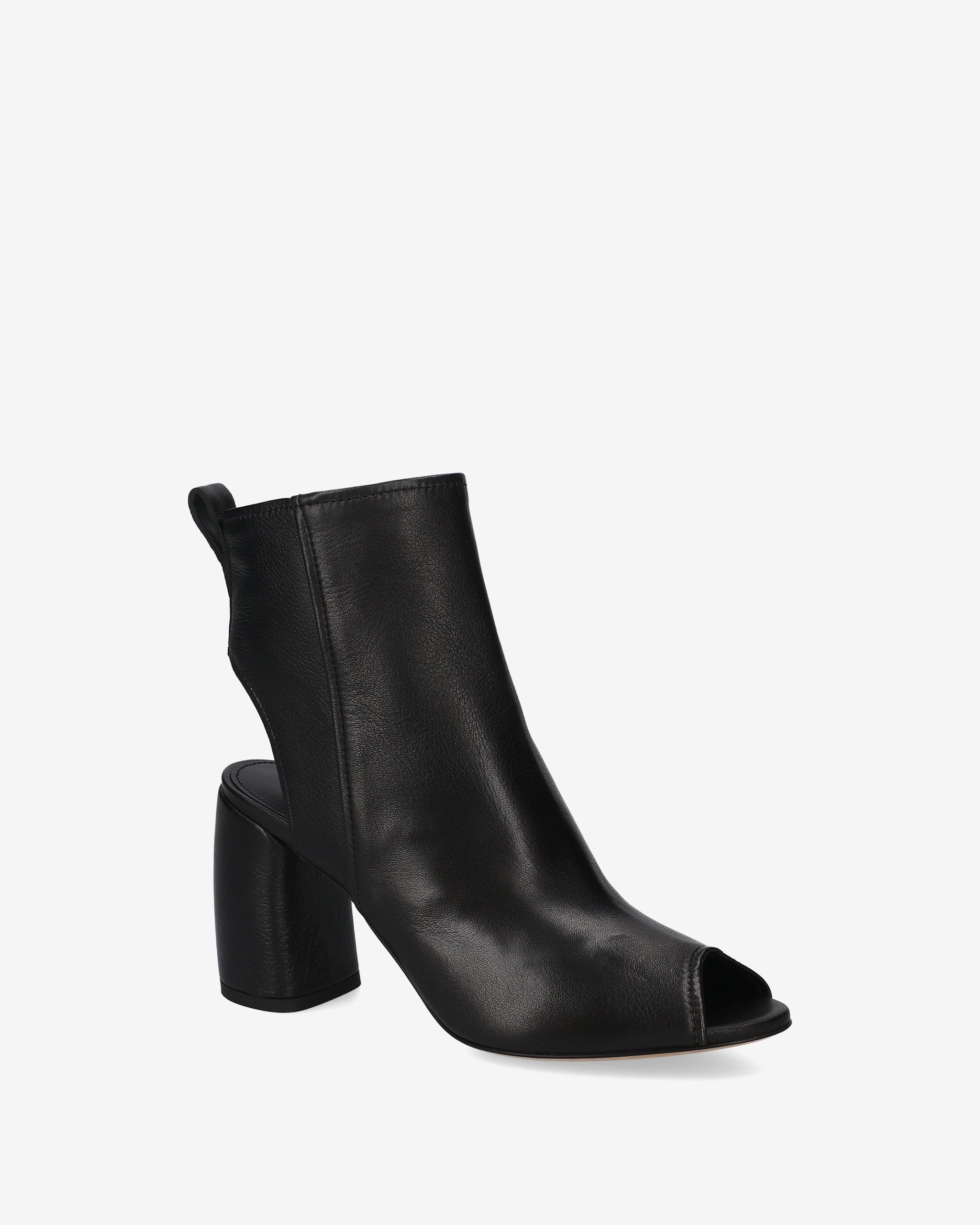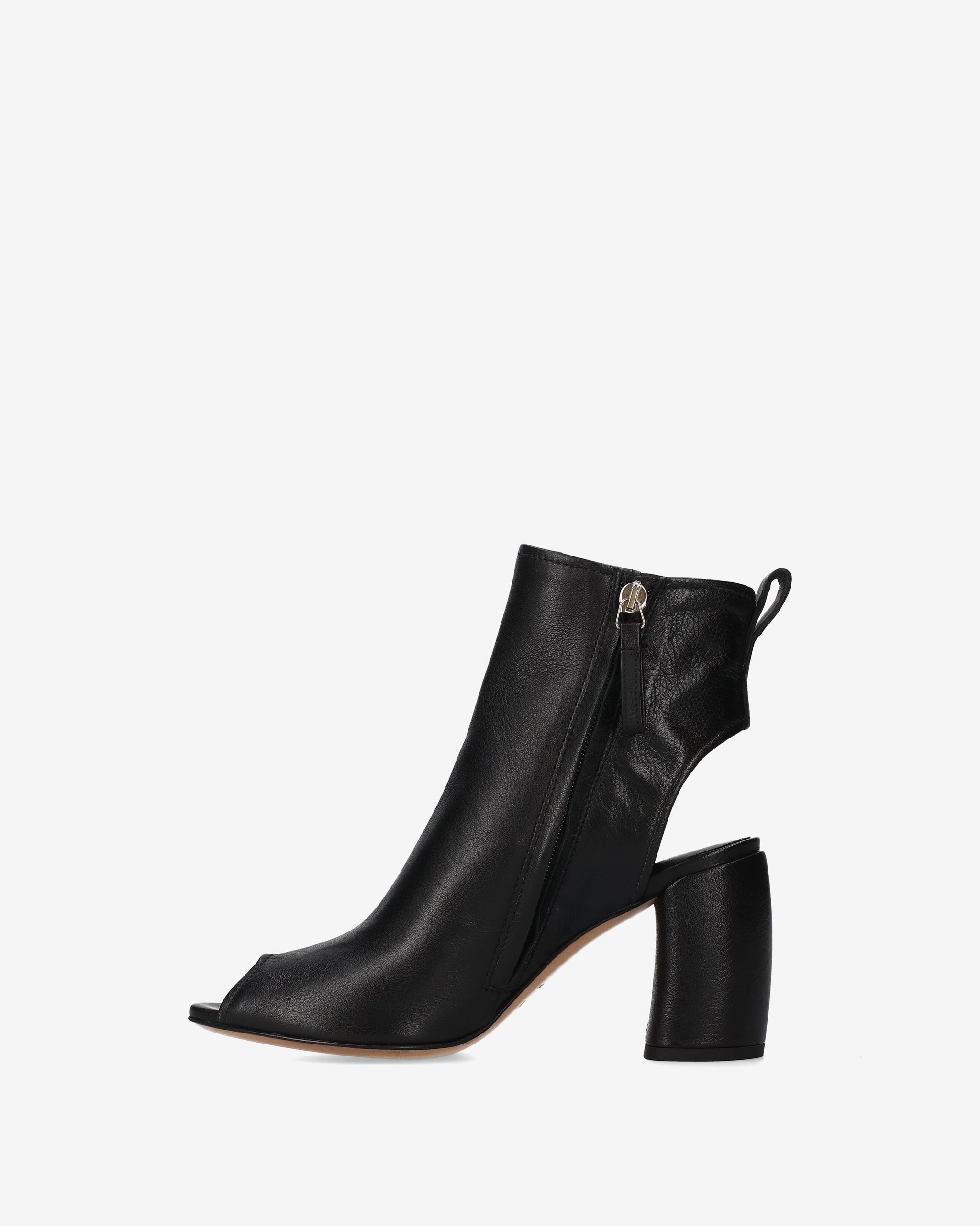 This hybrid ankle boot combines the structure of an ankle boot with the lightness of a sandal, creating a bold, architectural design. The cut-out silhouette at the heel and the open toe make it a distinctive and edgy seasonal style