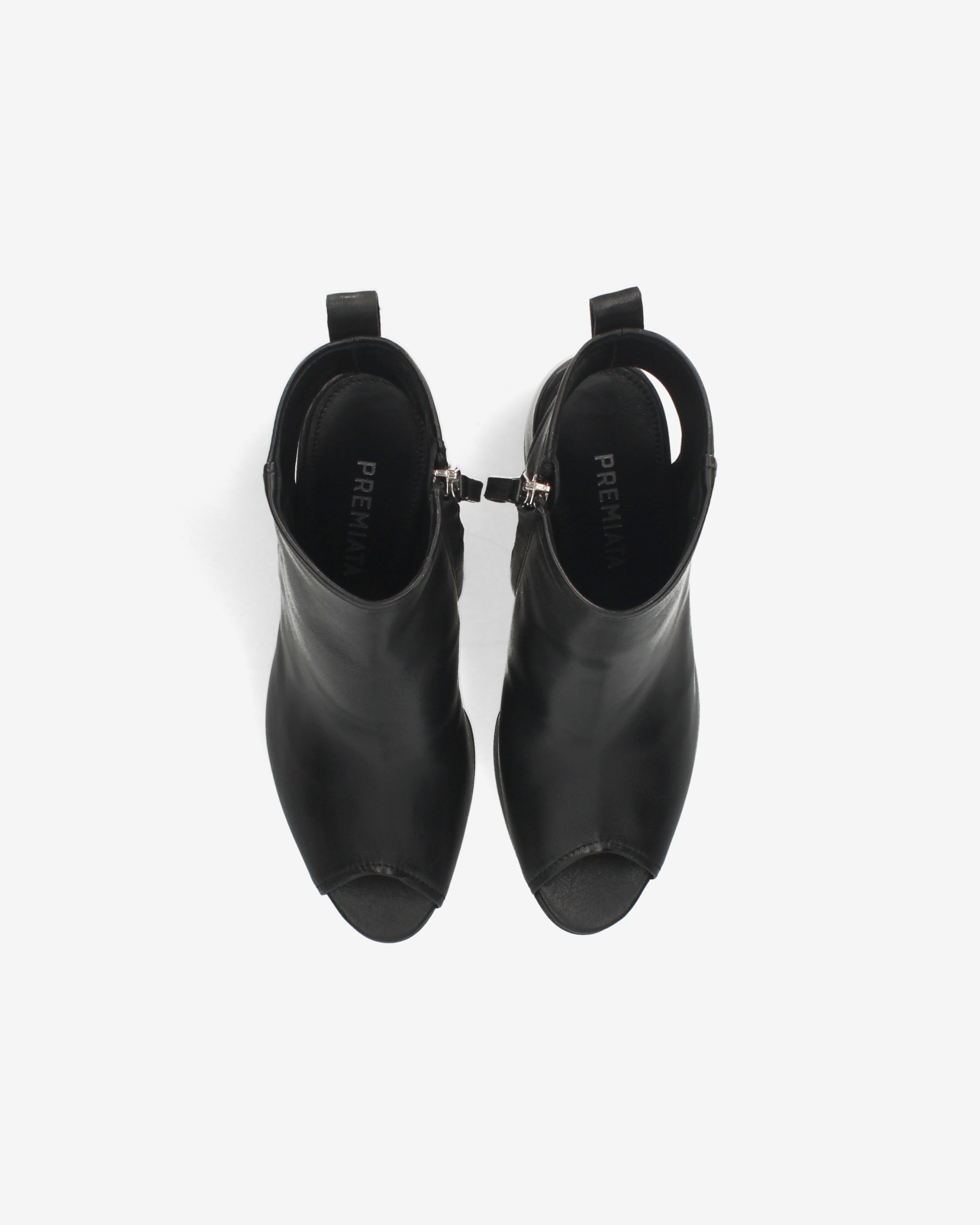 - Ankle boot style with a front opening and a wide back cutout that leaves the heel exposed